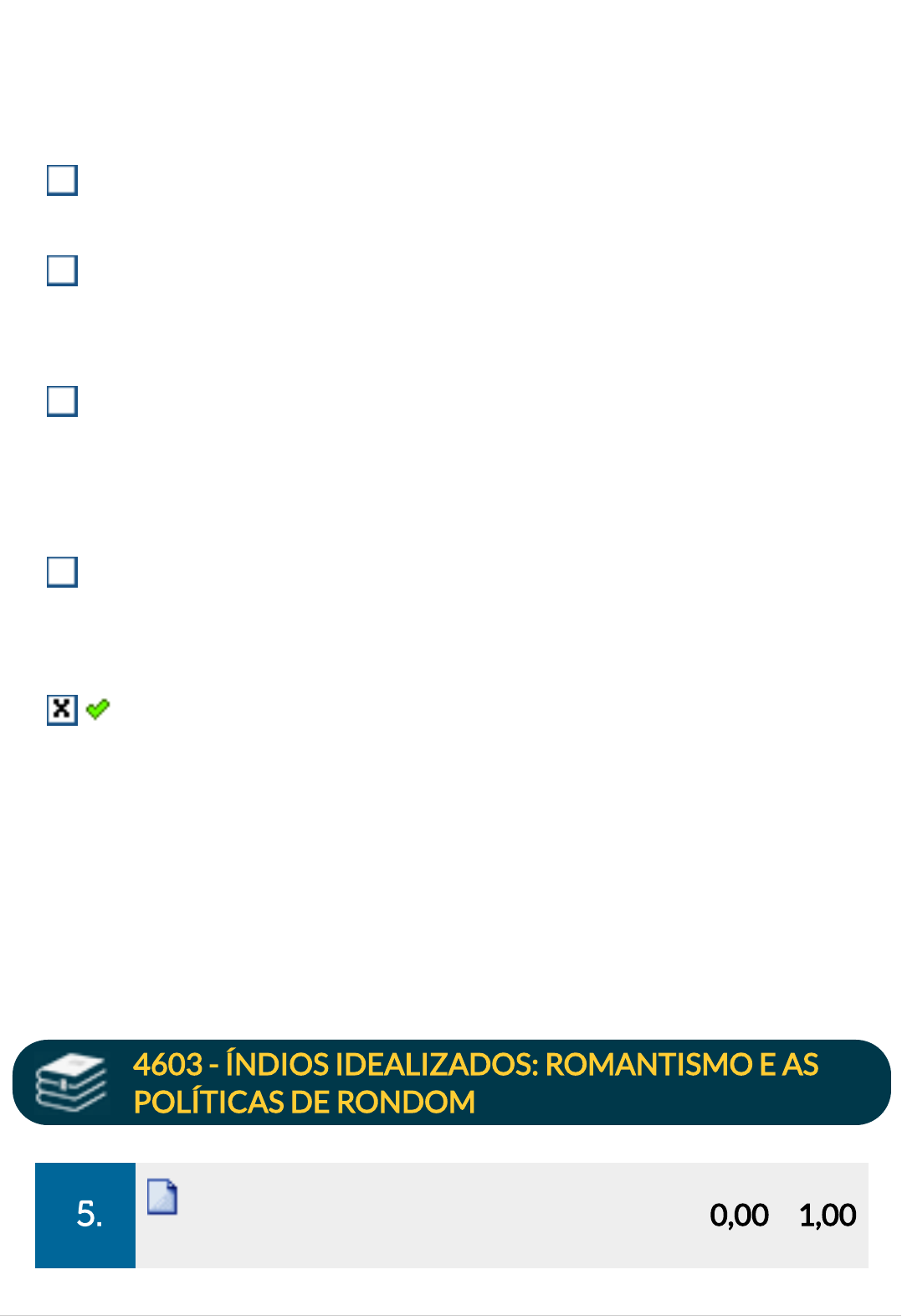 construídas aldeias que reuniam diferentes povos, com línguas e culturas distintas, para realizar a catequese e conversão à cultura cristã. Nesse sentido, a Coroa sempre tomava o lado dos jesuítas nas disputas que se seguiam sobre a liberdade não houve maiores problemas, tendo em vista que todos os povos indígenas aceitaram passivamente a catequização jesuíta. o esforço de exploração da população indígena pelos sertanistas encontrou grande barreira nos aldeamentos jesuíticos, completamente interessados na livre circulação dos nativos. os aldeamentos reforçam a ideia de integração irrestrita dos indígenas à cultura cristã, já que respeitavam a cultura e língua dos nativos. os Sete Povos das Missões são um exemplo da tentativa de isolamento e controle das populações nativas pelos jesuítas, que realizaram importante resistência às autoridades coloniais durante a Guerra Guaranítica. 4603 - ÍNDIOS IDEALIZADOS: ROMANTISMO E AS POLÍTICAS DE RONDOM 5. Ref.: 7698259 Pontos: 0,00 / 1,00 javascript:alert('C%C3%B3digo da quest%C3%A3o: 7698259.'); javascript:alert('C%C3%B3digo da quest%C3%A3o: 7698259.');