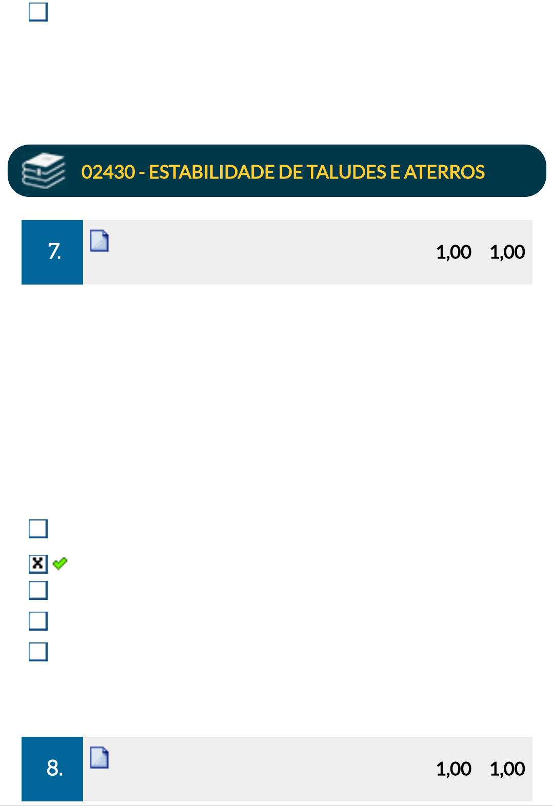 Prospecção estática do barrilete e aplicação de pressão para expansão de membrana 02430 - ESTABILIDADE DE TALUDES E ATERROS 7. Ref.: 6078425 Pontos: 1,00 / 1,00 Em Obras de Terras, como encostas de rodovias ou ferrovias, maciço de barragens e escavações uma grande preocupação são os deslizamentos. A avaliação da estabilidade dessas obras é importante para que se possa prever deslizamentos de terra. São empregados diferentes métodos para essa avaliação. Os ábacos de estabilidade são úteis para quando se deseja conhecer, de um talude: O ângulo de atrito interno do seu solo O ângulo de inclinação máximo permitido A coesão aparente de seu solo O peso especí�co do seu solo O intercepto coesivo de seu solo 8. Ref.: 6078231 Pontos: 1,00 / 1,00 javascript:alert('C%C3%B3digo da quest%C3%A3o: 6078425.'); javascript:alert('C%C3%B3digo da quest%C3%A3o: 6078425.'); javascript:alert('C%C3%B3digo da quest%C3%A3o: 6078231.'); javascript:alert('C%C3%B3digo da quest%C3%A3o: 6078231.');