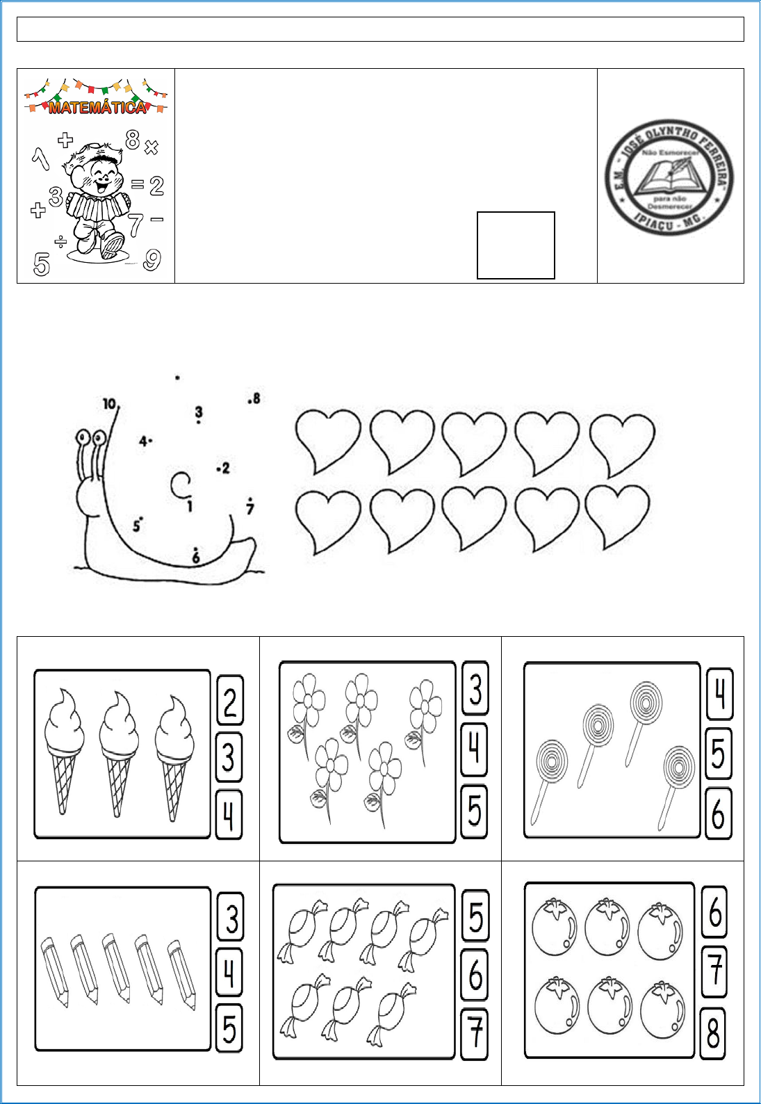 1 º PROVA BIMESTRAL MATEMÁTICA ESCOLA MUNICIPAL JOSÉ OLYNTHO FERREIRA. DIRETORA: MAURA MARIA LUIZA DA SILVA PROFESSORA: ______________________________ ALUNO: ____________________________________ DATA: _____/______/______ 1º ANO ______ VALE:10,0 PONTOS 1-LIGUE OS NÚMERO DE 1 ATÉ 10 E ESCREVA NO CORAÇÃO. 2- PINTE O NUMERAL QUE INDICA A QUANTIDADE EM CADA CONJUNTO. NOTA 9 1 3- EM CADA ÁRVORE DESENHE A QUANTIDADE DE FRUTOS QUE SE PEDE. 4- ESCREVA O NÚMERO CORRESPONDENTE. 5- CONTE E RESPONDA: QUANTAS BOLAS? ________ QUANTOS ROBOS? _________