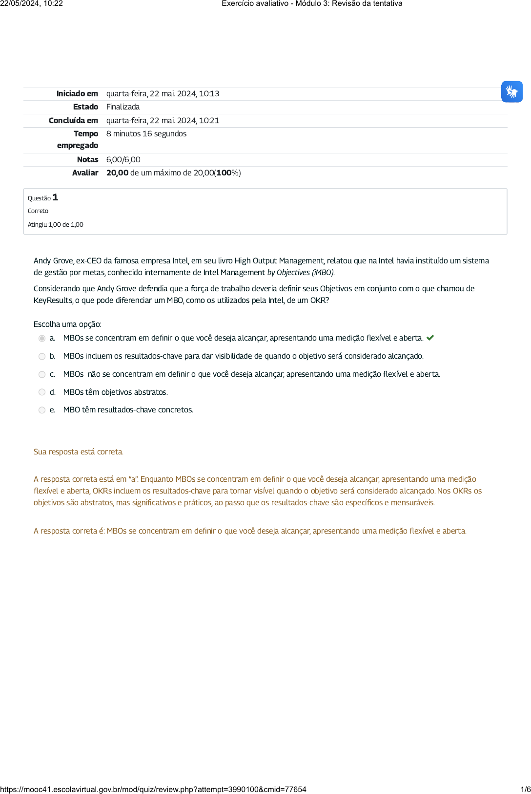 Iniciado em quarta-feira, 22 mai. 2024, 10:13 Estado Finalizada Concluída em quarta-feira, 22 mai. 2024, 10:21 Tempo empregado 8 minutos 16 segundos Notas 6,00/6,00 Avaliar 20,00 de um máximo de 20,00(100%) Questão 1 Correto Atingiu 1,00 de 1,00 Andy Grove, ex-CEO da famosa empresa Intel, em seu livro High Output Management, relatou que na Intel havia instituído um sistema de gestão por metas, conhecido internamente de Intel Management by Objectives (iMBO). Considerando que Andy Grove defendia que a força de trabalho deveria de�nir seus Objetivos em conjunto com o que chamou de KeyResults, o que pode diferenciar um MBO, como os utilizados pela Intel, de um OKR? Escolha uma opção: a. MBOs se concentram em de�nir o que você deseja alcançar, apresentando uma medição �exível e aberta. b. MBOs incluem os resultados-chave para dar visibilidade de quando o objetivo será considerado alcançado. c. MBOs não se concentram em de�nir o que você deseja alcançar, apresentando uma medição �exível e aberta. d. MBOs têm objetivos abstratos. e. MBO têm resultados-chave concretos. Sua resposta está correta. A resposta correta está em “a”. Enquanto MBOs se concentram em de�nir o que você deseja alcançar, apresentando uma medição �exível e aberta, OKRs incluem os resultados-chave para tornar visível quando o objetivo será considerado alcançado. Nos OKRs os objetivos são abstratos, mas signi�cativos e práticos, ao passo que os resultados-chave são especí�cos e mensuráveis. A resposta correta é: MBOs se concentram em de�nir o que você deseja alcançar, apresentando uma medição �exível e aberta. 22/05/2024, 10:22 Exercício avaliativo - Módulo 3: Revisão da tentativa https://mooc41.escolavirtual.gov.br/mod/quiz/review.php?attempt=3990100&cmid=77654 1/6 Questão 2 Correto Atingiu 1,00 de 1,00 Existem muitas discussões sobre semelhanças e diferenças entre as propostas de uso de OKR (Objectives and Key Results ou Objetivos e Resultados-Chave em português) e dos conhecidos KPIs (Key Performance Indicator ou Indicadores-Chave de Performance em português.) Qual é a grande diferença entre OKR e KPI? Escolha uma opção: a. O uso de KPIs não permite analisar o histórico de desempenho. b. O uso de KPIs não permite identi�car tendências e fazer previsões para o futuro. c. Os OKRs não se encaixam como uma forma de estruturar objetivos ligados a resultados mensuráveis que apoiam a realização de cada objetivo. d. OKRs não podem ser usados para comunicar de forma que toda organização tenha visibilidade e alinhamento sobre os resultados esperados. e. Os KPIs são métricas de negócios que re�etem o desempenho, enquanto o OKR pode ser visto como uma metodologia para de�nição de metas, no sentido de impulsionar a melhoria contínua. Sua resposta está correta. O uso de KPIs pode ser bastante e�caz para analisar o histórico de desempenho, identi�car tendências e fazer previsões para o futuro. Já os OKRs podem ser entendidos como uma forma de estruturar objetivos ligados a resultados mensuráveis que apoiam a realização de cada objetivo, direcionando e promovendo foco e disciplina. Se analisarmos as duas abordagens, podemos considerar que, enquanto os KPIs são métricas de negócios que re�etem o desempenho, o OKR pode ser visto como uma metodologia para de�nição de metas, no sentido de impulsionar a melhoria contínua. Portanto, a alternativa correta é a letra “e”. A resposta correta é: Os KPIs são métricas de negócios que re�etem o desempenho, enquanto o OKR pode ser visto como uma metodologia para de�nição de metas, no sentido de impulsionar a melhoria contínua. 22/05/2024, 10:22 Exercício avaliativo - Módulo 3: Revisão da tentativa https://mooc41.escolavirtual.gov.br/mod/quiz/review.php?attempt=3990100&cmid=77654 2/6 Questão 3 Correto Atingiu 1,00 de 1,00 John Doerr é um investidor de tecnologia que iniciou carreira na empresa Intel e passou a investir em empresas como Google e Amazon. A fórmula de Doerr para a construção de OKR é: Escolha uma opção: a. Nós vamos (Meta) medido por (Indicador). b. Nós fazemos (Ação) medido por (Indicador). c. Eu vou (Objetivo) medido por (Key Results). d. Eu vou (Ação) medido por (Key Results). e. Eu faço (Objetivo) medido por (Key Results). Sua resposta está correta. A fórmula de Doerr é a melhor maneira de se explicar a estrutura de um OKR, onde: Eu vou (Objetivo) medido por (Key Results) Objectives/Objetivos - descrições memoráveis e qualitativas daquilo que se deseja alcançar. Devem ser curtos, inspiradores e envolventes. Na metodologia OKR, um Objetivo deve motivar e desa�ar a equipe. Key Results/Resultados-Chave - conjunto de métricas que medem o seu progresso em direção ao atingimento dos Objetivos. A metodologia OKR orienta que para cada Objetivo você deve ter um conjunto de 2 a 5 resultados principais. Importante destacar que todos os Key Results devem ser quantitativos e mensuráveis. Portanto, a alternativa correta é a letra “c”. A resposta correta é: Eu vou (Objetivo) medido por (Key Results). 22/05/2024, 10:22 Exercício avaliativo - Módulo 3: Revisão da tentativa https://mooc41.escolavirtual.gov.br/mod/quiz/review.php?attempt=3990100&cmid=77654 3/6 Questão 4 Correto Atingiu 1,00 de 1,00 Na metodologia OKR, um objetivo é especí�co, mensurável, realizável, relevante e deve ter um tempo determinado para sua realização. Considerando os tipos de objetivos “compromissado” e “aspiracional”, qual a diferença entre eles? Escolha uma opção: a. O objetivo compromissado, também conhecido por moonshot, re�ete a melhoria contínua e não provocam grandes transformações na organização. b. O objetivo aspiracional, também conhecido por roofshot, é um objetivo ousado e muito difícil de ser alcançado. c. O objetivo compromissado, em geral, não apresenta um ganho de alto valor e devem representar apen