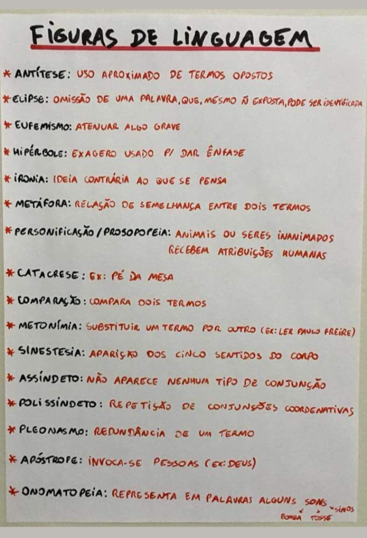 FIGURAS DE LINGUAGEM uso APROXIMADO DE TERMOS OPOSTOS DE UMA PALAVRA, QUE, MESMO EXPOSTA, PODE EUFEMISMO: ATENUAR ALGO GRAVE EXAGERO USADO DAR AO SE PENSA METÁFORA: DE ENTRE Dois TERMOS ou SERES RECEBEM HUMANAS CATACRESE: PE DA MESA : COMPARA TERMOS SUBSTITUIR UM TERMO POR OUTRO DOS SENTIDOS DO CORPO APARECE NENHUM DE RE PE DE COORDENATIVAS PLEONASMO: DE TERMO INVOCA-SE PESSOAS REPRESENTA EM PALAVRAS ALGUNS SONS