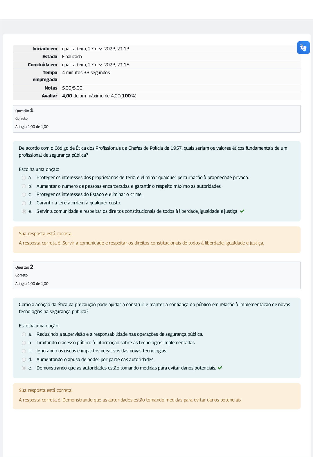 03/01/2024, 18:45 Atividade avaliativa 1: Revisão da tentativa https://mooc41.escolavirtual.gov.br/mod/quiz/review.php?attempt=1021530&cmid=24274 1/3 Iniciado em quarta-feira, 27 dez. 2023, 21:13 Estado Finalizada Concluída em quarta-feira, 27 dez. 2023, 21:18 Tempo empregado 4 minutos 38 segundos Notas 5,00/5,00 Avaliar 4,00 de um máximo de 4,00(100%) Questão 1 Correto Atingiu 1,00 de 1,00 Questão 2 Correto Atingiu 1,00 de 1,00 De acordo com o Código de Ética dos Pro�ssionais de Chefes de Polícia de 1957, quais seriam os valores éticos fundamentais de um pro�ssional de segurança pública? Escolha uma opção: a. Proteger os interesses dos proprietários de terra e eliminar qualquer perturbação à propriedade privada. b. Aumentar o número de pessoas encarceradas e garantir o respeito máximo às autoridades. c. Proteger os interesses do Estado e eliminar o crime. d. Garantir a lei e a ordem à qualquer custo. e. Servir a comunidade e respeitar os direitos constitucionais de todos à liberdade, igualdade e justiça. Sua resposta está correta. A resposta correta é: Servir a comunidade e respeitar os direitos constitucionais de todos à liberdade, igualdade e justiça. Como a adoção da ética da precaução pode ajudar a construir e manter a con�ança do público em relação à implementação de novas tecnologias na segurança pública? Escolha uma opção: a. Reduzindo a supervisão e a responsabilidade nas operações de segurança pública. b. Limitando o acesso público à informação sobre as tecnologias implementadas. c. Ignorando os riscos e impactos negativos das novas tecnologias. d. Aumentando o abuso de poder por parte das autoridades. e. Demonstrando que as autoridades estão tomando medidas para evitar danos potenciais. Sua resposta está correta. A resposta correta é: Demonstrando que as autoridades estão tomando medidas para evitar danos potenciais. 03/01/2024, 18:45 Atividade avaliativa 1: Revisão da tentativa https://mooc41.escolavirtual.gov.br/mod/quiz/review.php?attempt=1021530&cmid=24274 2/3 Questão 3 Correto Atingiu 1,00 de 1,00 Questão 4 Correto Atingiu 1,00 de 1,00 Questão 5 Correto Atingiu 1,00 de 1,00 Considerando o exemplo formulado no módulo 02, qual das seguintes diretrizes é uma parte importante do controle ético ao considerar a implementação de sistemas de reconhecimento facial na segurança pública? Escolha uma opção: a. Garantir a transparência e o escrutínio público, incluindo consultas, debates abertos e avaliações independentes. b. Ampliar a aplicação do reconhecimento facial para monitorar todos os cidadãos em espaços públicos. c. Evitar a supervisão e a responsabilidade humana na operação do sistema. d. Não se preocupar com a proteção da privacidade e dos dados pessoais. e. Minimizar a transparência e manter as intenções em segredo. Sua resposta está correta. A resposta correta é: Garantir a transparência e o escrutínio público, incluindo consultas, debates abertos e avaliações independentes. Qual dos seguintes princípios éticos faz parte do Código de Ética da Polícia Federal do Brasil? Escolha uma opção: a. Ignorar a legalidade. b. Promover a moralidade. c. Agir de forma pessoal. d. Abster-se da disciplina. e. Desprezar a cortesia. Sua resposta está correta. A resposta correta é: Promover a moralidade. Qual campo interdisciplinar trouxe questões éticas relacionadas ao controle e à automação, e quem foi um dos proeminentes �lósofos da ética nesse contexto? Escolha uma opção: a. Genética e Albert Einstein. b. Engenharia de so�ware e Steve Jobs. c. Astronomia e Galileu Galilei. d. Cibernética e Norbert Wiener. e. Biologia marinha e Jacques Cousteau. Sua resposta está correta. A resposta correta é: Cibernética e Norbert Wiener. 03/01/2024, 18:45 Atividade avaliativa 1: Revisão da tentativa https://mooc41.escolavirtual.gov.br/mod/quiz/review.php?attempt=1021530&cmid=24274 3/3