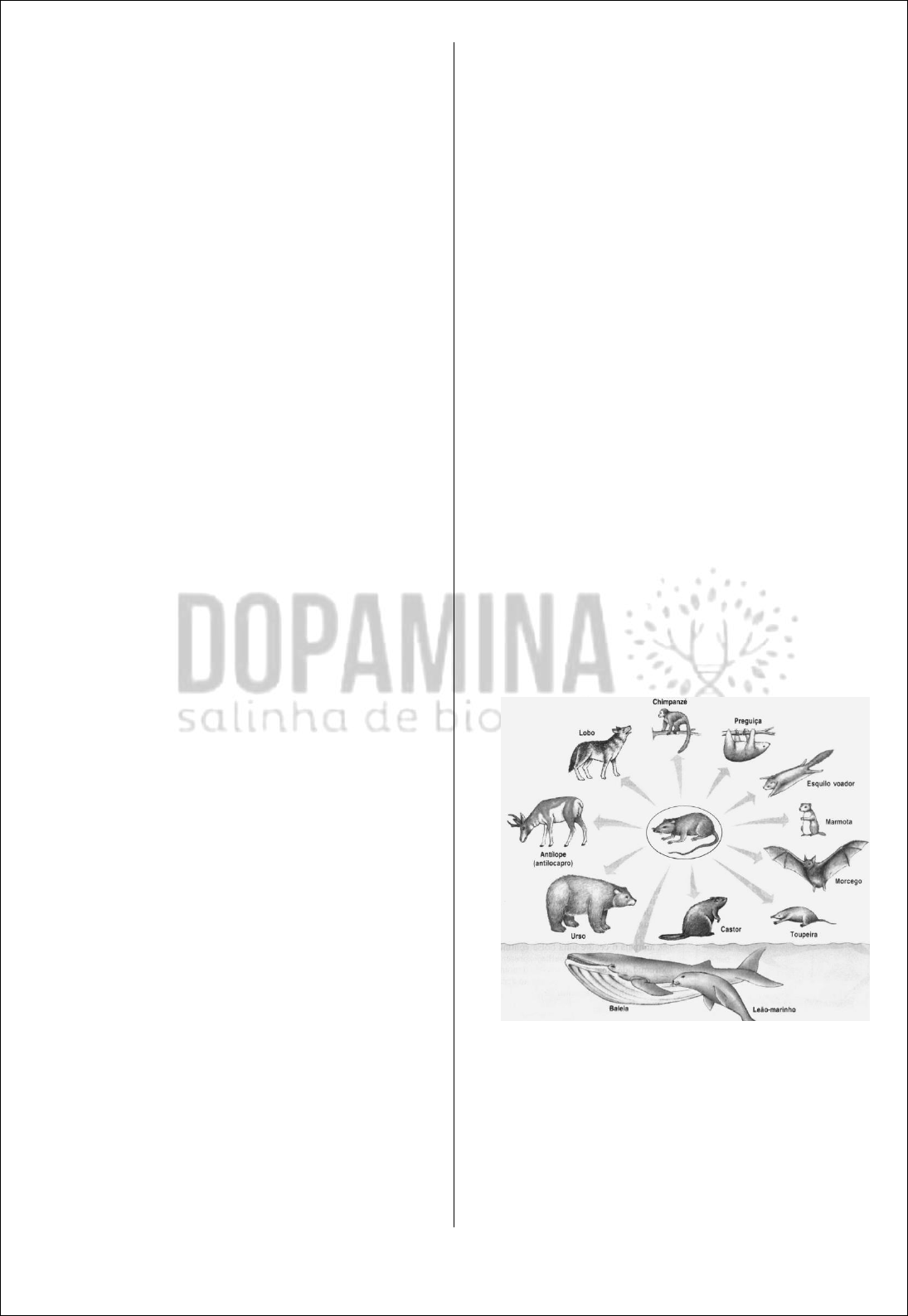 PROFESSORA MARINA ESPÍNOLA SALINHA DOPAMINA 211 Assim, a forma do corpo e os membros em forma de barbatanas são caracteres puramente semelhantes quando se compara a baleia com os peixes, porque constituem, nas duas classes, uma adaptação especial em virtude do modo de locomoção aquática. (Charles Darwin, in A origem das Espécies) No trecho acima, ao comparar os caracteres citados, Darwin está se referindo a uma situação hoje conhecida por: a) convergência adaptativa, resultante da ação da seleção natural em ambientes com as mesmas características. b) convergência adaptativa, resultante da ação da seleção natural em ambientes com características distintas. c) divergência adaptativa, resultante da ação da seleção natural em ambientes com as mesmas características. d) divergência adaptativa, resultante da ação da seleção natural em ambientes com características distintas. e) irradiação adaptativa, resultante da competição entre diferentes espécies em um dado ambiente. Questão 45 - (UFTM MG/2008) A ema (gênero Rhea), o avestruz (gênero Struthio) e o casuar (gênero Casuarius) são aves pernaltas de grande porte, não voadoras, que ocorrem naturalmente na América do Sul, na África e na Austrália, respectivamente. Embora em continentes diferentes, essas espécies guardam entre si muitas semelhanças anatômicas, fisiológicas e comportamentais, o que sugere que tenham tido origem evolutiva comum. Pode-se dizer que muito provavelmente a formação dessas espécies a partir de um ancestral comum se deu por: a) irradiação adaptativa, durante a qual teria ocorrido isolamento geográfico seguido da diferenciação genética das populações isoladas. b) irradiação adaptativa, caracterizada pela aquisição de mecanismos de isolamento reprodutivo aos quais se seguem o isolamento geográfico e, posteriormente, a diferenciação genética das populações isoladas. c) convergência adaptativa, durante a qual teria ocorrido isolamento geográfico seguido da diferenciação genética das populações isoladas. d) convergência adaptativa, caracterizada pela aquisição de mecanismos de isolamento reprodutivo aos quais se seguem o isolamento geográfico e, posteriormente, a diferenciação genética das populações isoladas. e) divergência adaptativa, caracterizada pela diferenciação genética de fragmentos da população a qual se segue a aquisição de mecanismos de isolamento reprodutivo e, posteriormente, o isolamento geográfico. Questão 46 - (UNIMONTES MG/2008) A evolução é corroborada por um conjunto de fatores. A figura abaixo ilustra um desses fatores. Analise-a. Considerando a figura e o assunto abordado, analise as afirmativas abaixo e assinale a alternativa INCORRETA. a) O processo evidenciado pela figura é denominado de irradiação adaptativa. PROFESSORA MARINA ESPÍNOLA SALINHA DOPAMINA 212 b) A analogia entre as estruturas das espécies é uma forte evidência da ocorrência do processo representado. c) Quando uma espécie adquire a capacidade de explorar novos ambientes, seguindo-se o isolamento geográfico, pode ocorrer o processo representado. d) As espécies representadas guardam características da sua ancestralidade. Questão 47 - (UNIVAS MG/2008) Os morcegos desenvolveram um curioso método para evitar os obstáculos. Ao voarem à noite ou em caverna sem luz, emitem sons de alta freqüência, que não podemos ouvir. Pelo eco que o som produz batendo em obstáculos, eles reconhecem a presença de objetos ou presa. Fato tão extraordinário parecia impossível de repetir em outro grupo de animais. Demonstrou-se, entretanto, que uma ave cavernícola da Venezuela orienta-se exatamente pelo mesmo processo. Processo impressionante, por que esse sistema de orientação exige um aprimoramento notável do órgão fonador e do ouvido, além de uma coordenação neuromotora toda especial. (Frota Pessoa, vol II) O texto acima exemplifica claramente o que em evolução chamamos de: a) fluxo gênico b) adaptação divergente c) mutação dirigida d) convergência adaptativa e) deriva genética Questão 48 - (UFU MG/2008) Os braços humanos, as nadadeiras das baleias e as asas dos morcegos têm estruturas ósseas muito parecidas, sugerindo uma ancestralidade comum e as mesmas origens embriológicas. As asas das aves e as dos insetos são estruturas semelhantes quanto à função, mas têm origens evolutiva e embrionária diferentes. De acordo com os estudos relacionados com a biologia do desenvolvimento e com a evolução das espécies, marque a alternativa correta. a) As asas dos morcegos e as asas dos insetos são órgãos análogos. O processo evolutivo responsável por essa analogia é a irradiação adaptativa. b) Os braços humanos, as nadadeiras das baleias e as asas dos morcegos são órgãos análogos. O processo evolutivo responsável por essa homologia é a convergência adaptativa. c) As asas dos morcegos e as asas dos insetos são órgãos homólogos. O processo evolutivo responsável por essa homologia é a convergência adaptativa. d) Os braços humanos, as nadadeiras das baleias e as asas dos morcegos são órgãos homólogos. O processo evolutivo responsável por essa homologia é a irradiação adaptativa. Questão 49 - (UNIMONTES MG/2007) A mutação, a migração, a deriva genética e a seleção natural têm efeitos diferentes na variação genética dentro das populações e entre as populações. Considerando populações diferentes, assinale a alternativa que apresenta o fator que tem MAIOR CHANCE DE DIMINUIR a variação genética entre populações. a) Mutação. b) Recombinação. c) Deriva genética. d) Migração. Questão 50 - (UNESP SP/2006) Algumas espécies de aves e de mamíferos de climas temperados trocam a plumagem ou a pelagem de acordo com as estações do ano (variações sazonais). No verão, possuem cores escuras, que os confundem com a vegetação e, no inverno, tornam-se claros, ficando pouco vi
