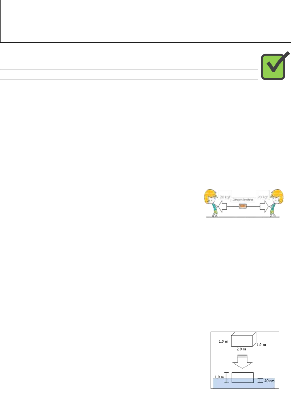 CADERNO DE EXERCÍCIOS ALUNO TURMA SIMULADO DE FÍSICA VERDE PROFESSOR RESOLUÇÃO COMENTADA Visite o Link para assistir à Playlist com a resolução, na sequência, de todas as questões: https://www.youtube.com/playlist?list=PLnY4QEDOBpoIuBm0NAfMP1cazYvra9itr QUESTÕES 01. Um pescador deseja atravessar um rio de 60 m de largura em um ponto colocado a frente de um porto, na margem oposta. Sendo as velocidades do barco de 5 m/s, em relação às águas, e do rio de 3 m/s, em relação às margens. Considerando que o pescador assuma uma direção que permita atingir o porto, em quanto tempo isso ocorreria? a) 7,5 s. b) 12,0 s. c) 15,0 s. d) 20,0 s. e) 30,0 s. 02. As vezes deparamos com situações em que forças são exercidas nos corpos, fazendo-se uso de fios. Com relação a situação apresentada, sobre a intensidade da tração nos fios, a indicação do dinamômetro, em kgf, neste cabo de guerra é de a) 0. b) 5. c) 10. d) 20. e) 40. 03. Considerando que uma barra de chocolate forneça 20 kcal de energia, com 1 cal igual a 4,2 J, quantas vezes você deveria levantar, com velocidade constante, um peso de 1 kg a uma altura de 1 m, para dissipar essa energia ingerida? (Adote g = 10 m/s2). a) 42. b) 84. c) 420. d) 8400. e) 42000. 04. Na ausência de uma balança de grande capacidade, uma estratégia para estimar a massa de um objeto de volume conhecido é colocá-lo em água, medindo a porção do corpo imersa nesta. É claro que a estratégia só será válida se a densidade do corpo for menor que a massa específica da água, de 1 g/cm3. Agora é com você! Qual deve ser a massa de uma peça de madeira que flutua em água conforme o esquema ao lado? Questão 04 Questão 02 https://www.youtube.com/playlist?list=PLnY4QEDOBpoIuBm0NAfMP1cazYvra9itr a) 8 Kg. b) 40 Kg. c) 200 Kg. d) 400 Kg. e) 800 Kg. 05. A média de temperatura global de 2020 ultrapassou 1,1°C acima da média pré- industrial, informou Met Office, do Reino Unido. O ano mais quente até então registrado foi 2016, quando o mundo sofreu um forte El Niño. No Brasil, a onda de calor que atingiu a porção central do país em 2020 resultou em temperaturas máximas próximas a 45 °C. Para divulgação dessa notícia em diferentes meios, essa temperatura máxima, de 45 °C, precisa ser expressa na escala Fahrenheit. Qual seria o valor dessa temperatura máxima nessa escala? a) 5 °F. b) 57 °F. c) 77 °F. d) 113 °F. e) 318 °F. 06. Em um restaurante, um espelho deve ser colocado na parede oposta ao caixa, para que, deste, seja possível ver toda a porta de entrada. Considerando que cada quadriculado do projeto apresentado tenha uma dimensão de 2 m x 2 m, qual deve ser a largura mínima do espelho a ser colocado na parede? a) 2 m. b) 4 m. c) 6 m. d) 8 m. e) 10 m. 07. O gráfico a seguir representa a voltagem entre os polos de um motor elétrico em função da corrente elétrica que o atravessa em diferentes situações. A partir destas informações, qual deve ser o rendimento deste motor quando submetido a uma tensão de 120 V? a) 5%. b) 25%. c) 50%. d) 75%. e) 95%. Questão 07 08. A figura mostra duas placas paralelas, separadas por uma distância de 3 m, indicando o potencial elétrico no ponto A, VA = 5 V. Considerando que as placas estão submetidas a uma ddp de 15 V, o módulo do vetor campo elétrico entre as placas e o potencial elétrico do ponto C, respectivamente, valem: a) 5 V/m e -5 V. b) 5 V/m e 0 V. c) 15 V/m e 5 V. d) 15 V/m e -0 V. e) -5 V/m e 5 V. 09. O comprimento total entre as pontas das asas de um avião é de 80 m. O avião voa a 900 km/h e com altura constante, numa direção perpendicular à direção do campo magnético terrestre. Nestas condições, a diferença de potencial induzida por este campo magnético entre as pontas das asas do avião é de: (A intensidade do campo magnético terrestre nessa região é de 5.10-5 T). a) 0,36 V. b) 1,0 V. c) 3,6 V. d) 12 V. e) 100 V. 10. (UFMG) Paulo Sérgio, viajando em sua nave, aproxima-se de uma plataforma espacial, com velocidade de 0,7 c, em que c é a velocidade da luz. Para se comunicar com Paulo Sérgio, Priscila, que está na plataforma, envia um pulso luminoso em direção à nave. Com base nessas informações, é correto afirmar que a velocidade do pulso medida por Paulo Sérgio é de: a) 0,7 c. b) 1,0 c. c) 0,3 c. d) 1,7 c. e) 2,0 c. Questão 10