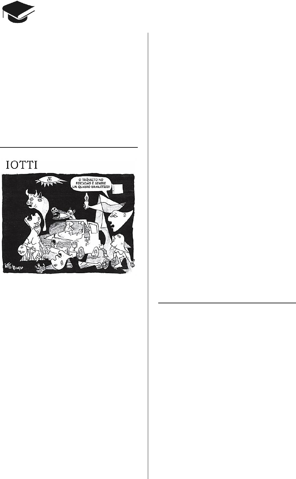 CADERNO LITERATURA ENEM 2009 a 2018 78 novocadernoenem@gmail.com As rubricas em itálico, como as trazidas no tre- cho de Martins Pena, em uma atuação teatral, constituem: A) necessidade, porque as encenações preci- sam ser fiéis às diretrizes do autor. B) possibilidade, porque o texto pode ser muda- do, assim como outros elementos. C) preciosismo, porque são irrelevantes para o texto ou para a encenação. D) exigência, porque elas determinam as carac- terísticas do texto teatral. E) imposição, porque elas anulam a autonomia do diretor. Questão 207 (2014.1) Na criação do texto, o chargista Iotti usa criati- vamente um intertexto: os traços reconstroem uma cena de Guernica, painel de Pablo Picasso que retrata os horrores e a destruição provoca- dos pelo bombardeio a uma pequena cidade da Espanha. Na charge, publicada no período de carnaval, recebe destaque a figura do carro, elemento introduzido por Iotti no intertexto. Além dessa figura, a linguagem verbal contribui para estabelecer um diálogo entre a obra de Picasso e a charge, ao explorar: A) uma referência ao contexto, “trânsito no feri- adão”, esclarecendo-se o referente tanto do texto de Iotti quanto da obra de Picasso. B) uma referência ao tempo presente, com o emprego da forma verbal “é”, evidenciando-se a atualidade do tema abordado tanto pelo pintor espanhol quanto pelo chargista brasileiro. C) um termo pejorativo, “trânsito”, reforçando-se a imagem negativa de mundo caótico presente tanto em Guernica quanto na charge. D) uma referência temporal, “sempre”, referindo- se à permanência de tragédias retratadas tanto em Guernica quanto na charge. E) uma expressão polissêmica, “quadro dramá- tico”, remetendo-se tanto à obra pictórica quanto ao contexto do trânsito brasileiro. Questão 208 (2014.1) Óia eu aqui de novo xaxando Óia eu aqui de novo para xaxar Vou mostrar pr’esses cabras Que eu ainda dou no couro Isso é um desaforo Que eu não posso levar Que eu aqui de novo cantando Que eu aqui de novo xaxando Óia eu aqui de novo mostrando Como se deve xaxar Vem cá morena linda Vestida de chita Você é a mais bonita Desse meu lugar Vai, chama Maria, chama Luzia Vai, chama Zabé, chama Raque Diz que eu tou aqui com alegria (BARROS, A. Óia eu aqui de novo. Disponível em: www.luizluagonzaga.mus.br. Acesso em: 5 maio 2013) A letra da canção de Antônio de Barros manifes- ta aspectos do repertório linguístico e cultural do Brasil. O verso que singulariza uma forma ca- racterística do falar popular regional é: A) “Isso é um desaforo”. B) “Diz que eu tou aqui com alegria”. C) “Vou mostrar pr’esses cabras”. D) “Vai, chama Maria, chama Luzia”. E) “Vem cá morena linda, vestida de chita”. Questão 209 (2014.1) No Brasil, a origem do funk e do hip-hop remon- ta aos anos 1970, quando da proliferação dos chamados “bailes black” nas periferias dos grandes centros urbanos. Embalados pela black music americana, milhares de jovens encontra- vam nos bailes de finais de semana uma alter- nativa de lazer antes inexistente. Em cidades como o Rio de Janeiro ou São Paulo, forma- vam-se equipes de som que promoviam bailes onde foi se disseminando um estilo que buscava a valorização da cultura negra, tanto na música como nas roupas e nos penteados. No Rio de Janeiro ficou conhecido como "Black Rio”. A indústria fonográfica descobriu o filão e, lan- çado discos de “equipe” com as músicas de sucesso nos bailes, difundia a moda pelo res- tante do país. (DAYRELL, J. A música entra em cena: o rap e o funk na socialização da juventude. Belo H.: UFMG, 2005) A presença da cultura hip-hop no Brasil caracte- riza-se como uma forma de: CADERNO LITERATURA ENEM 2009 a 2018 79 novocadernoenem@gmail.com A) lazer gerada pela diversidade de práticas artísticas nas periferias urbanas. B) entretenimento inventada pela indústria fono- gráfica nacional. C) subversão de sua proposta original já nos primeiros bailes. D) afirmação de identidade dos jovens que a praticam. E) reprodução da cultura musical norte- americana. Questão 210 (2014.1) A forte presença de palavras indígenas e africa- nas e de termos trazidos pelos imigrantes a partir do século XIX é um dos traços que distin- guem o português do Brasil e o português de Portugal. Mas, olhando para a história dos em- préstimos que o português brasileiro recebeu de línguas europeias a partir do século XX, outra diferença também aparece: com a vinda ao Brasil da família real portuguesa (1808) e, parti- cularmente, com a Independência, Portugal deixou de ser o intermediário obrigatório da assimilação desses empréstimos e, assim, Bra- sil e Portugal começaram a divergir, não so por terem sofrido influências diferentes, mas tam- bém pela maneira como reagiram a elas. (ILARI, R.; BASSO, R. O português da gente: a lín- gua que estudamos, a língua que falamos. São Paulo: Contexto, 2006) Os empréstimos linguísticos, recebidos de di- versas línguas, são importantes na constituição do português do Brasil porque: A) deixaram marcas da história vivida pela na- ção, como a colonização e a imigração. B) transformaram em um só idioma línguas dife- rentes, como as africanas, as indígenas e as europeias. C) promoveram uma língua acessível a falantes de origens distintas, como o africano, o indígena e o europeu. D) guardaram uma relação de identidade entre os falantes do português do Brasil e os do por- tuguês de Portugal. E) tornaram a língua do Brasil mais complexa do que as línguas de outros países que também tiveram colonização portuguesa. Questão 211 (2014.2) Soneto Oh! Páginas da vida que eu amava, Rompei-vos! nunca mais! tão desgraçado!... Ardei, lembranças doces do passado! Quero rir-me de tudo que eu amava! E que doido que eu fui! como eu pensava Em mãe, amor de irmã! em sossegado Adormecer na vida acalentado Pelos lábios que eu tímido beijava