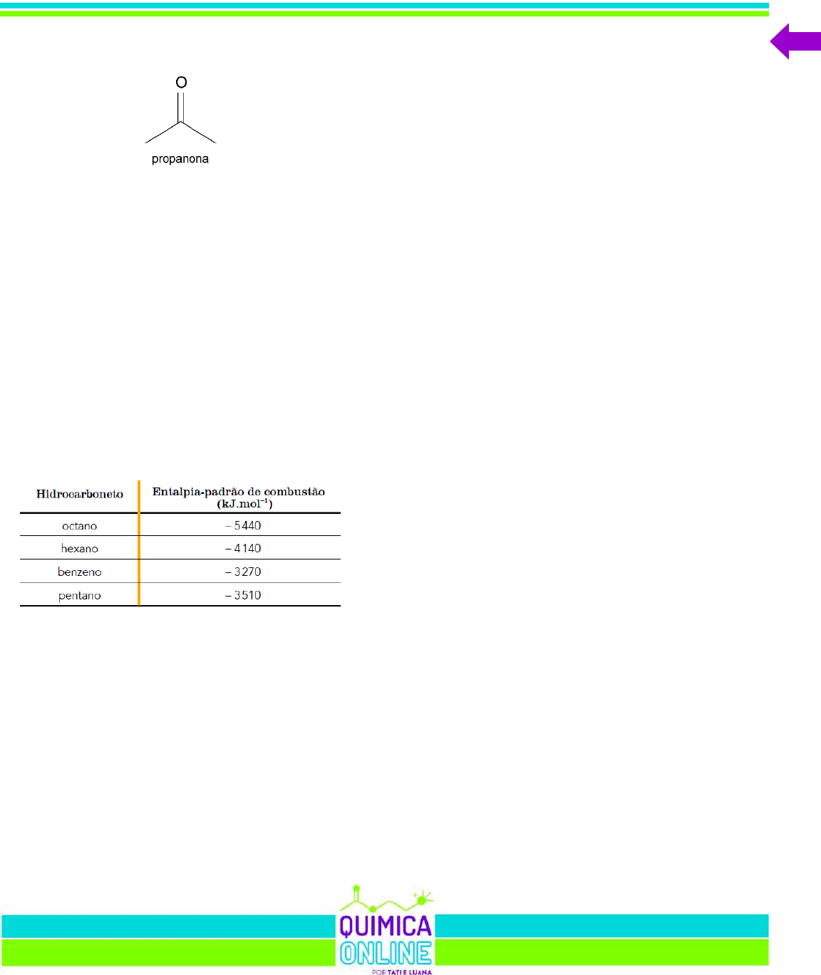 3000 QUESTÕES DE QUÍMICA 353 de unhas. A combustão completa de 1 mol desta substância libera 604 kJ de energia por mol de CO2 produzido. Na combustão completa de 1 mol de propanona, a energia liberada para cada mol de O2 consumido é a) 220 kJ. b) 805 kJ. c) 906 kJ. d) 403 kJ. e) 453 kJ. 51 - (UERJ) A capacidade poluidora de um hidrocarboneto usado como combustível é determinada pela razão entre a energia liberada e a quantidade de CO2 formada em sua combustão completa. Quanto maior a razão, menor a capacidade poluidora. A tabela abaixo apresenta a entalpia-padrão de combustão de quatro hidrocarbonetos. A partir da tabela, o hidrocarboneto com a menor capacidade poluidora é: a) octano b) hexano c) benzeno d) pentano 52 - (UNITAU SP) O gás acetileno é muito utilizado em operações de soldagem de metais, devido a sua natureza inflamável. A combustão completa do gás acetileno com oxigênio libera 650 kJ de calor para 1,0 mol de CO2 formado. A equação de combustão é C2H2(g) + O2(g) CO2(g) + H2O(g) + calor A quantidade de calor liberada pela combustão de 104 g de acetileno é de a) 4550 kJ b) 3900 kJ c) 3250 kJ d) 5200 kJ e) 2600 kJ 53 - (UNCISAL) De acordo com uma reportagem da revista Superinteressante, a Organização Mundial do Comércio (OMC) afirma, em seu relatório World Trade Report – Natural Resources, que recursos naturais são “estoques de materiais existentes em ambiente natural que são escassos e economicamente úteis”. Ou seja, se forem usados de forma excessiva, se esgotarão e teremos grandes problemas no que se refere aos combustíveis. Fatos desse tipo têm levado à especulação sobre combustíveis alternativos, em particular sobre o uso do hidrogênio (H2). Se compararmos o hidrogênio ao propano, que também tem sido utilizado em alguns veículos, temos os seguintes dados: H2(g) + 1/2 O2(g) H2O(g) kJ/mol H2 C3H8(g) + 5 O2(g) 3 CO2(g) + 4 H2O(g) kJ/mol C3H8 Referente à comparação entre os dois combustíveis, assinale a a lternativa correta. a) Na comparação da combustão do hidrogênio com a do propano, pode-se perceber que o propano produz mais energia por grama que o hidrogênio. b) A vantagem de se utilizar o hidrogênio é que ele é menos poluente e de fácil obtenção e armazenamento. c) A energia produzida por grama de hidrogênio é 2,6 vezes maior que a energia produzida por grama de propano. d) São necessários 5 mols de hidrogênio para produzir a mesma quantidade de energia que 1 mol de propano. e) Por serem substâncias puras, as Entalpias Padrão de Formação tanto do gás Hidrogênio quanto do Propano são iguais a zero. 54 - (UESB BA) → → 83,241Ho reação −= → 15,2043Ho reação −= 3000 QUESTÕES DE QUÍMICA 354 A pirometalurgia do ferro é um processo industrial que se baseia na obtenção do ferro metálico a partir do aquecimento do minério de ferro. As equações químicas I, II e III representam a conversão do minério de ferro em ferro metálico, e a tabela, os valores de entalpia-padrão de formação de algumas substâncias a 25ºC. I. 3Fe2O3(s) + CO(g) 2Fe3O4(s) + CO2(g) II. Fe3O4(s) + CO(g) 3FeO(s) + CO2(g) III. FeO(s) + CO(g) Fe(l) + CO2(g) + 16,3kJ Com base nas equações químicas, nas informações do texto, da tabela e considerando-se que os processos ocorrem na condição padrão, é correto afirmar: 01) Na formação de 3,0mol de FeO(s), a partir do Fe3O4(s), são necessários 19,0 kJ de energia. 02) Na formação de um mol de FeO(s), a partir do Fe3O4(s), são necessários 20,0 kJ de energia. 03) A equação I é termoquímica, pois representa as espécies que participam do processo e os estados físicos dessas substâncias. 04) Na reação química representada na equação I, são liberados 46,4 kJ de energia por mol de Fe2O3(s), que reage. 05) A equação III indica que a reação do FeO(s) com CO(g) para formar Fe(l) e CO2(g) é endotérmica. 55 - (ENEM) Por meio de reações químicas que envolvem carboidratos, lipídeos e proteínas, nossas células obtêm energia e produzem gás carbônico e água. A oxidação da glicose no organismo humano libera energia, conforme ilustra a equação química, sendo que aproximadamente 40% dela é disponibilizada para atividade muscular. C6H12O6 (s) + 6 O2 (g) 6 CO2 (g) + 6 H2O(l) kJ Considere as massas molares (em g mol–1): H = 1; C = 12; O = 16. LIMA, L. M.; FRAGA, C. A. M.; BARREIRO, E. J. Química na saúde. São Paulo: Sociedade Brasileira de Química, 2010 (adaptado). Na oxidação de 1,0 grama de glicose, a energia obtida para atividade muscular, em quilojoule, é mais próxima de a) 6,2. b) 15,6. c) 70,0. d) 622,2. e) 1 120,0. 56 - (UPE PE) O rótulo ao lado traz a informação nutricional de uma porção de 100g de um produto alimentício e dos valores diários de referência, com base em uma dieta de 2000kcal ou 8400kJ. Esses valores podem ser maiores ou menores, dependendo das necessidades energéticas. Para as gorduras trans, o valor diário de referência não foi estabelecido. Fonte: http://nicoline.com.br Esses dados são condizentes com as características de a) bolo de aveia. b) óleo de girassol. c) linguiça de porco. d) bolo de rolo recheado. e) farinha de trigo sem fermento. 57 - (FMSanta Casa SP) Em determinada cidade promoveu-se a substituição do combustível fóssil utilizado na usina termoelétrica local por um combustível ambientalmente sustentável, proveniente de fonte renovável. Assim, o gás propano foi substituído pelo gás metano, oriundo do biogás gerado no aterro sanitário local, que contém 60% em massa de metano. A tabela apresenta algumas propriedades desses gases. → → → → 2800Hc −= 3000 QUESTÕES DE QUÍMICA 355 a) Escreva a equação balanceada da reação de combustão completa do metano. Classifique a reação de combustão do metano quanto ao calor envolvido na reação. b) Considerando que a energia gerada pelo biogás é proveniente unicamente da combustão do metano, calcule a mass