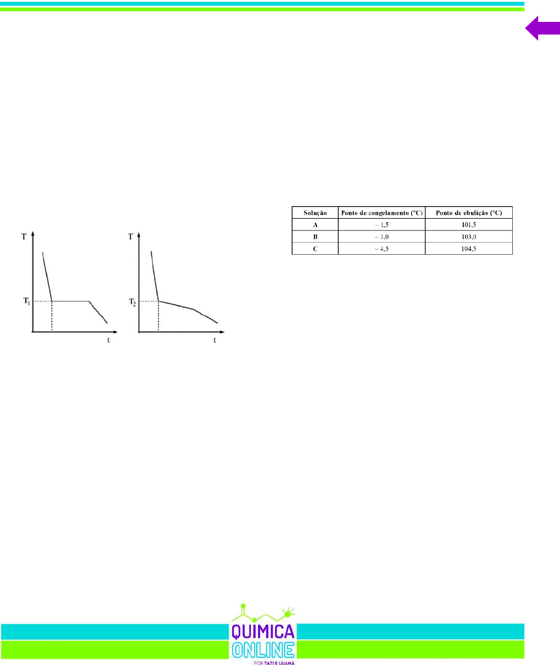 3000 QUESTÕES DE QUÍMICA 320 pura e sua ebulição, a uma temperatura mais baixa que a da água pura. b) a solidificação de uma solução aquosa de etilenoglicol deve começar a uma temperatura mais baixa que a da água pura e sua ebulição, a uma temperatura mais elevada que a da água pura. c) tanto a solidificação de uma solução aquosa de etilenoglicol quanto a sua ebulição devem começar em temperaturas mais baixas que as da água pura. d) tanto a solidificação de uma solução aquosa de etilenoglicol quanto a sua ebulição devem começar em temperaturas mais altas que as da água pura. 115 - (UFRGS RS) As figuras abaixo representam a variação da temperatura, em função do tempo, no resfriamento de água líquida e de uma solução aquosa de sal. Considere as seguintes afirmações a respeito das figuras. I. A curva da direita representa o sistema de água e sal. II. T1 = T2. III. T2 é inferior a 0 ºC. Quais estão corretas? a) Apenas I. b) Apenas II. c) Apenas III. d) Apenas I e III. e) I, II e III. 116 - (IFGO) As propriedades coligativas indicam alterações nas propriedades físico químicas de uma substância a partir da adição de um soluto. Uma dessas propriedades é bastante utilizada quando se deseja fazer com que as bebidas de uma festa possam ficar geladas mais rapidamente. Consiste basicamente na adição de cloreto de sódio sobre o gelo que estava resfriando as bebidas. A propriedade que explica a ocorrência desse fenômeno é conhecida como a) ebulioscopia. b) glaciação. c) crioscopia. d) pressão osmótica. e) pressão de vapor. 117 - (Mackenzie SP) Ao investigar as propriedades coligativas das soluções, um estudante promoveu o congelamento e a ebulição de três soluções aquosas de solutos não voláteis (A, B e C), ao nível do mar. O resultado obtido foi registrado na tabela abaixo. Após a análise dos resultados obtidos, o estudante fez as seguintes afirmações: I. a solução A é aquela que, dentre as soluções analisadas, apresenta maior concentração em mol.L–1. II. a solução B é aquela que, dentre as soluções analisadas, apresenta menor pressão de vapor. III. a solução C é aquela que, dentre as soluções analisadas, apresenta menor volatilidade. De acordo com os dados fornecidos e com seus conhecimentos, pode-se dizer que apenas a) a afirmação I está correta. b) a afirmação II está correta. c) a afirmação III está correta. d) as afirmações I e II estão corretas. e) as afirmações II e III estão corretas. 118 - (UNIFOR CE) A adição de solutos não voláteis à água gera propriedades físicas na mistura, conhecidas como propriedades coligativas. Considere que a adição de 50 g de um composto desconhecido a 250 g de água gerou uma temperatura de ebulição 101,5 ºC, a 1 atm. Conciderando a constante ebulioscópica da água é 0,5 ºC/molal, podemos afirmar que a massa molar do composto desconhecido é de, aproximadamente, 3000 QUESTÕES DE QUÍMICA 321 a) 66,7 g mol–1. b) 81,3 g mol–1. c) 92,1 g mol–1. d) 133,5 g mol–1. e) 150,4 g mol–1. 119 - (FPS PE) Considere uma solução aquosa 0,1 M de NaCl. De acordo com as propriedades coligativas, é correto afirmar que, a 1 atm, esta solução possui: a) temperatura de ebulição maior que 100 ºC. b) temperatura de fusão maior que 0 ºC. c) pressão de vapor igual à da água pura. d) densidade menor que 1 g/mL. e) pressão osmótica igual à da água pura. 120 - (UDESC SC) Considere as três soluções aquosas abaixo: (1) Al(NO3)3 0,10 mol/L (2) FeCl2 0,133 mol/L (3) Na2SO4 0,300 mol/L Assinale a alternativa que representa as informações corretas acerca das temperaturas de ebulição das soluções. a) As soluções 1 e 2 possuem pontos de ebulição iguais, e a solução 3 ponto de ebulição maior. b) A ordem crescente de ponto de ebulição é solução 1< solução 2< solução 3. c) A ordem crescente de ponto de ebulição é solução 2< solução 1< solução 3. d) A ordem crescente de ponto de ebulição é solução 3<solução2 < solução1. e) As soluções 1 e 2 possuem pontos de ebulição iguais, e a solução 3 ponto de ebulição menor. 121 - (ACAFE SC) Considere soluções aquosas diluídas e de mesma concentração das seguintes soluções: 1: Mg3(PO4)2 2: K2Cr2O7 3: Na2S2O3.5H2O 4: Al(NO3)3 A ordem crescente do ponto de ebulição dessas soluções é: a) 2 3 > 4 > 1 b) 2 < 4 < 1 < 3 c) 2 > 4 > 1 > 3 d) 2 3 < 4 < 1 122 - (UECE) O ponto de ebulição do etanol em determinadas condições é 78,22 ºC. Ao dissolver um pouco de fenol no etanol, um estudante de química produziu uma solução com ponto de ebulição 78,82 ºC, nas mesmas condições. Sabendo-se que o etanol tem Ke = 1,2 ºC, pode-se afirmar corretamente que a molalidade da solução é a) 0,25 M. b) 0,30 M. c) 0,50 M. d) 0,60 M. 123 - (UEMG) Ebulioscopia é a propriedade coligativa, relacionada ao aumento da temperatura de ebulição de um líquido, quando se acrescenta a ele um soluto não volátil. Considere as três soluções aquosas a seguir: Solução A = NaCl 0,1 mol/L Solução B = sacarose 0,1 mol/L Solução C = CaCl2 0,1 mol/L As soluções foram colocadas em ordem crescente de temperatura de ebulição em a) C, A, B. b) B, A, C. c) A, B, C. d) C, B, A. 124 - (IFGO) A quantidade de soluto dissolvida em uma solução influencia em sua temperatura de fusão, uma vez que quanto maior a quantidade de soluto dissolvida, menor o ponto de fusão da mesma. O quadro a seguir mostra a receita de um picolé de fruta e de um picolé de cremoso. 3000 QUESTÕES DE QUÍMICA 322 Comparando o processo de derretimento de um picolé de fruta e de um picolé cremoso, é correto afirmar: a) Os dois picolés derretem ao mesmo tempo, uma vez que o ponto de fusão dos dois são iguais. b) O ponto de ebulição do picolé cremoso é maior do que o ponto de ebulição do picolé de fruta. c) Não há diferença no processo de derretimento dos dois picolés. d) Por ser mais c