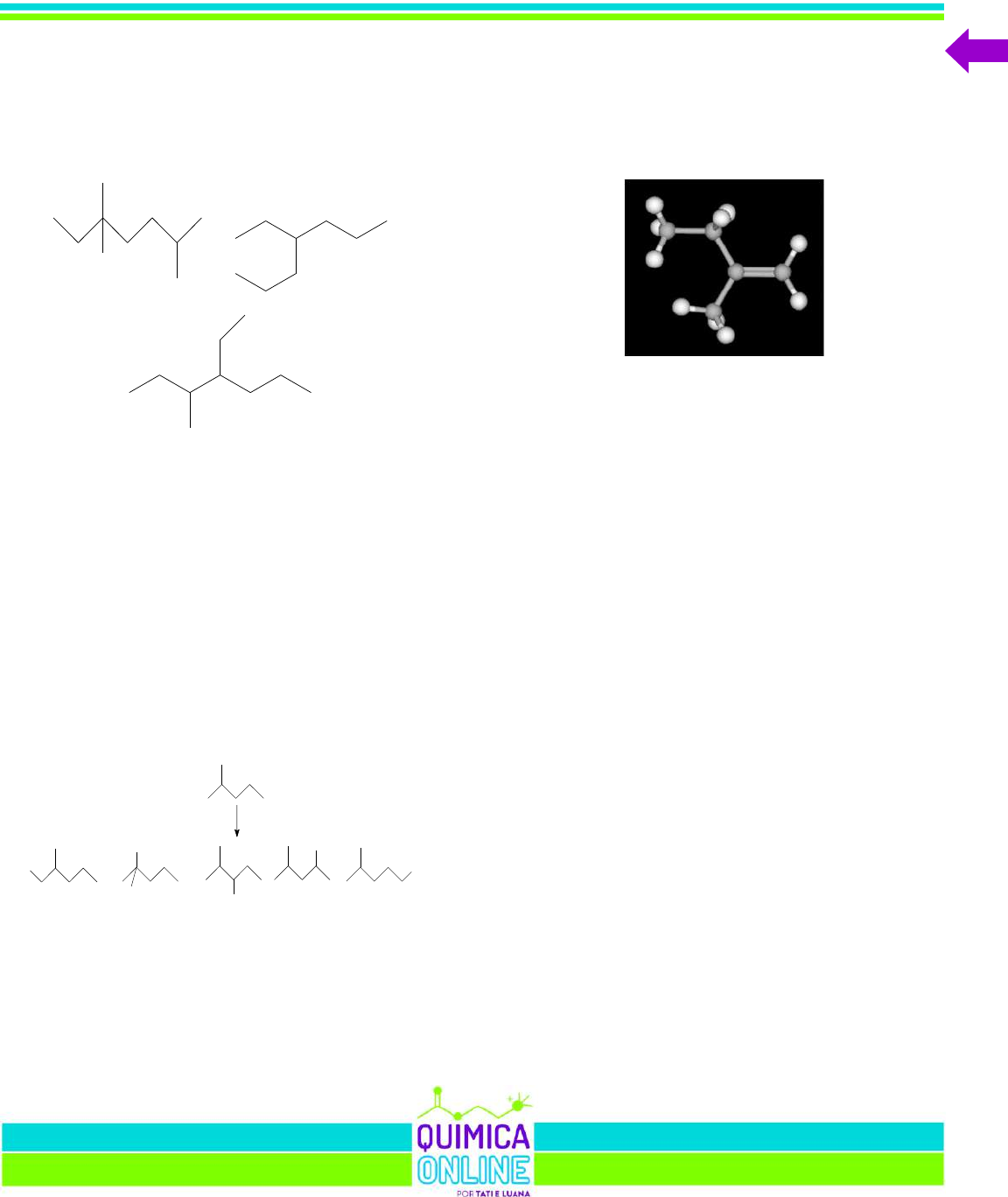 3000 QUESTÕES DE QUÍMICA 585 e) Os radicais metila, etila e isopropila. 20 - (UFV MG) Assinale a alternativa que apresenta CORRETAMENTE os nomes sistemáticos para os compostos I, II e III, respectivamente: I II III a) 3,3,6-trimetileptano, 3-propilexano, 3-metil-4- metileptano. b) 2,5,5-trimetileptano, 4-etileptano, 4-etil-3- metileptano. c) 3,3,6-trimetileptano, 4-etileptano, 3-metil-4- metileptano. d) 2,5,5-trimetileptano, 3-propilexano, 4-etil-3- metileptano. 21 - (Unioeste PR) Da reação do 2-metil-pentano com bromo em condições radicalares (reação mostrada abaixo), é possível se obter os cinco produtos mostrados abaixo. Br2 / peróxidos Br Br Br Br Br (I) 4-metil-5-bromo- pentano (II) 1-bromo-1,1-dimetil- pentano (III) 3-bromo-4-metil- pentano (IV) 2-bromo-4-metil- pentano (V) 2-metil-5-bromo- pentano Dos produtos apresentados, o único que possui nomenclatura correta é: a) I. b) II. c) III. d) IV. e) V. 22 - (UFRGS RS) Considere a representação tridimensional da molécula orgânica mostrada abaixo. Sobre essa molécula, é correto afirmar que a) é um hidrocarboneto saturado de cadeia homogênea e ramificada. b) possui todos os átomos de carbono com geometria trigonal plana. c) tem, na nomenclatura oficial IUPAC, o nome 2- metilbut-1-eno. d) apresenta isomeria geométrica. e) possui fórmula molecular C5H12. 23 - (UEL PR) Cidades menores, quando não organizadas, podem apresentar problemas sérios de saúde pública, como é o caso de epidemias de dengue. Esforços têm sido dedicados à descoberta de novos métodos para controle da dengue. A curcumina, uma substância presente no açafrão-da-terra, pode matar as larvas do Aedes aegypti. Basta colocar o pó em locais onde o mosquito da dengue costuma se reproduzir, como pratos e vasos de plantas. Além de ser eficaz, a substância não agride o meio ambiente. (Adaptado de: <http://g1.globo.com/sp/sao-carlos- regiao/noticia/2015/03/ substancia-presente-no-acafrao-pode-ajudar-no-combate- dengue-diz-usp.html>. Acesso em: 14 abr. 2015.) A curcumina, cuja molécula é apresentada a seguir, é uma substância presente no açafrão-da-terra e que dá o tom de amarelo ao pó. 3000 QUESTÕES DE QUÍMICA 586 H3CO HO OCH3 OH OHO Sobre essa molécula, atribua V (verdadeiro) ou F (falso) às afirmativas a seguir. ( ) Apresenta cadeia carbônica homogênea e insaturada. ( ) Contém igual número de átomos de carbono e hidrogênio. ( ) Por combustão total, forma monóxido de carbono e peróxido de hidrogênio. ( ) Possui, no total, dezessete carbonos secundários e dois carbonos terciários. ( ) Os grupos funcionais são ácido carboxílico, álcool e éster. Assinale a alternativa que contém, de cima para baixo, a sequência correta. a) V, V, V, F, F. b) V, V, F, F, V. c) V, F, F, V, F. d) F, V, F, V, V. e) F, F, V, F, V. 24 - (UFJF MG) Um método clássico para a preparação de alcoóis é a hidratação de alcenos catalisada por ácido. Nessa reação, o hidrogênio se liga ao carbono mais hidrogenado, e o grupo hidroxila se liga ao carbono menos hidrogenado (regra de Markovnikov). Sabendo-se que os alcoóis formados na hidratação de dois alcenos são, respectivamente, 2-metil-2- hexanol e 1-etilciclopentanol, quais são os nomes dos alcenos correspondentes que lhes deram origem? a) 2-metil-2-hexeno e 2-etilciclopenteno. b) 2-metil-2-hexeno e 1-etilciclopenteno. c) 2-metil-3-hexeno e 1-etilciclopenteno. d) 2-metil-1-hexeno e 2-etilciclopenteno. e) 3-metil-2-hexeno e 2-etilciclopenteno. 25 - (UEM PR) Assinale a(s) alternativa(s) que apresenta(m) a descrição correta da molécula de 3-bromo-3,6-dimetil-5-etil-octa-4-eno. 01. O número de átomos de hidrogênio presente na cadeia principal é maior do que o número de átomos de hidrogênio presente nas ramificações. 02. A molécula apresenta uma cadeia aberta, normal, heterogênea e insaturada. 04. A molécula apresenta 8 átomos de carbono. 08. A molécula apresenta carbonos com hibridização sp3, sp2 e sp. 16. Os carbonos 3 e 6 são quirais. 26 - (UDESC SC) Analise o composto representado na figura abaixo: H3C C CH3 CH3 CH2 C CH2 CH3 Sobre o composto, é incorreto afirmar que: a) o seu nome é 2,2,4- trimetil-4-penteno. b) apresenta dois carbonos com hibridização sp2. c) é um alceno ramificado de cadeia aberta. d) é um hidrocarboneto ramificado de cadeia aberta. e) apresenta seis carbonos com hibridização sp3. 27 - (UFCG PB) A partir do conhecimento do nome oficial de um composto orgânico, escrito de acordo com as regras gerais de nomenclatura estabelecidas pela IUPAC, pode-se saber as características estruturais do composto. Na tabela a seguir são dados na primeira coluna os nomes oficiais de alguns hidrocarbonetos e na segunda coluna, uma informação que pode ser obtida a partir da estrutura do respectivo composto. Analise os dados da tabela e assinale a alternativa que representa a informação correta associada ao composto. metila. grupos 4octano-dimetil-2,4-Dietil-3,5e) átomos. 22 de totalUm heptano-Trimetil-2,2,3d) duplas. ligações Duas hexeno-2-metil-4-Etil-3c) carbono. de átomos 11 hexeno-1-Trimetil-3,3,4b) .hidrogênio de átomos 14 hexano-ciclo-Metila) contém moléculaA netoHidrocarbo de Nome 28 - (ITA SP) 3000 QUESTÕES DE QUÍMICA 587 Embrulhar frutas verdes em papel jornal favorece o seu processo de amadurecimento devido ao acúmulo de um composto gasoso produzido pelas frutas. Assinale a opção que indica o composto responsável por esse fenômeno. a) Eteno. b) Metano. c) Dióxido de carbono. d) Monóxido de carbono. e) Amônia. 29 - (UEM PR) Assinale a(s) alternativa(s) que apresenta(m) uma descrição correta da molécula orgânica: 01. Na molécula, a cadeia principal contém o maior número de átomos de carbono em sequência possível de ser obtido. 02. A cadeia principal não apresenta carbonos quaternários, mas apresenta carbonos com hibridização sp3, sp2 e sp. 04. A cadeia principal contém 4 radicais. 08. A cadeia principal con
