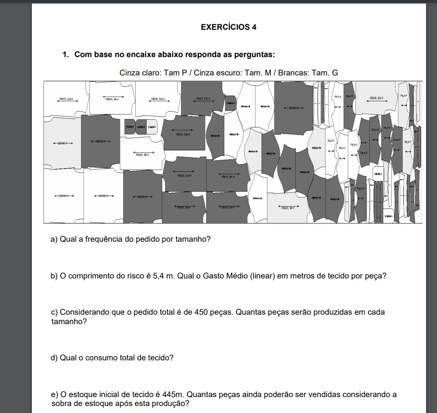 EXERCÍCIOS 4 1. Com base no encaixe abaixo responda as perguntas: Cinza claro: Tam P / Cinza escuro: Tam. M / Brancas: Tam. G a) Qual a frequência do pedido por tamanho? b) o comprimento do risco é 5,4 m. Qual Gasto Médio (linear) em metros de tecido por peça? c) Considerando que pedido total é de 450 peças. Quantas peças serão produzidas em cada tamanho? d) Qual consumo total de tecido? e) o estoque inicial de tecido é 445m. Quantas peças ainda poderão ser vendidas considerando a sobra de estoque após esta produção?