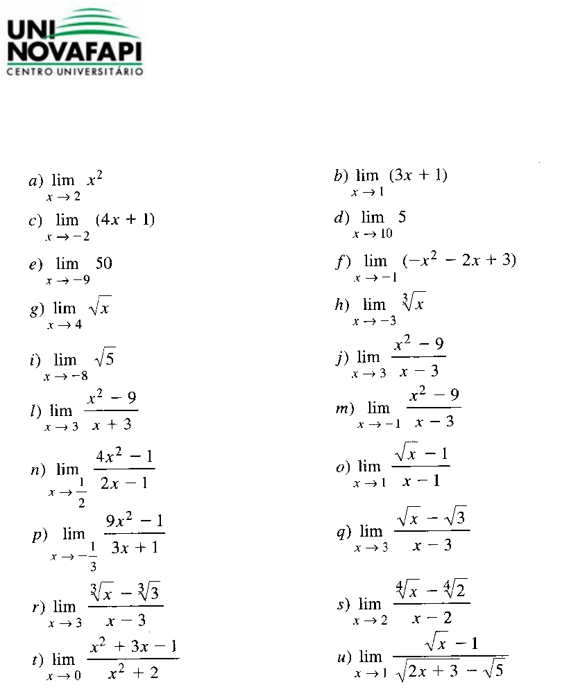 CENTRO UNIVERSITÁRIO UNINOVAFAPI - UNINOVAFAPI Engenharia de Produção Lista de Exercícios 2 ALUNO(A):____________________________________________________ MATRÍCULA:__________________ 01. Calcule os limites abaixo: image1.emf image2.png