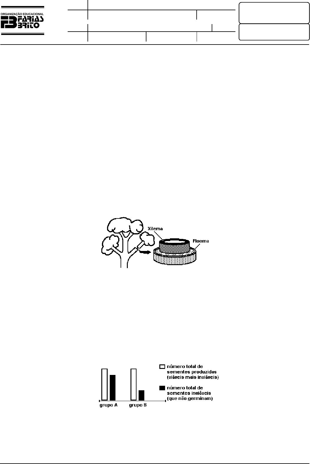 OSG.: 090513/15 ��� ���������� �� ������ ���������� � � ����� �� �������� � �� ���� ���� ����� � RICARDO JORGE TODAS � � ������������ ���� �� � � ����������������� � 1�� (PUC�SP/2004) Um casal de namorados, com auxílio de um canivete, faz a inscrição de seus nomes ao redor do tronco de uma árvore. Passados seis meses, o casal se separa. O rapaz vai até a árvore e retira um anel da casca, circundando o tronco na região que continha a inscrição. Após algum tempo, o casal se reconcilia e volta à árvore para refazer a prova de amor, mas, para sua surpresa, encontram�na morta, porque o anel de casca que foi retirado continha: a) além da periderme, o floema. b) além da periderme, o xilema. c) apenas o floema. d) apenas o xilema. e) o xilema e o floema. 2�� (Cesgranrio/2004) O estado físico dos compostos químicos pode ser reconhecido e justificado por meio das ligações interatômicas e intermoleculares que ocorrem, respectivamente, entre os átomos que formam as moléculas e entre as próprias moléculas. A água, por exemplo, em condições ambientais, é um solvente líquido, e as suas moléculas possuem um tipo especial de atração entre si, como decorrência da presença de polos opostos em sua estrutura molecular. Trata�se da ligação hidrogênio ou ponte de hidrogênio. Constata�se, ainda, que fenômenos fisiológicos como o transporte de algumas substâncias no corpo de uma árvore resultam de tais interações. Nas árvores, as interações que ocorrem entre as moléculas de água representam uma base teórica para explicar a: a) condução da seiva bruta ao longo dos vasos do xilema. b) condução da seiva bruta ao longo dos vasos do floema. c) condução da seiva elaborada ao longo dos vasos do xilema. d) condução da seiva elaborada ao longo dos vasos do floema. e) impulsão da seiva bruta pela pressão positiva gerada na raiz pela absorção dessa substância. 3�� (UFSCar/2004) Se retirarmos um anel da casca de um ramo lateral de uma planta, de modo a eliminar o floema, mas mantendo o xilema intacto, como mostrado na figura, espera�se que: a) o ramo morra, pois os vasos condutores de água e sais minerais são eliminados e suas folhas deixarão de realizar fotossíntese. b) o ramo morra, pois os vasos condutores de substâncias orgânicas são eliminados e suas folhas deixarão de receber alimento das raízes. c) o ramo continue vivo, pois os vasos condutores de água e sais minerais não são eliminados e as folhas continuarão a realizar fotossíntese. d) o ramo continue vivo, pois os vasos condutores de substâncias orgânicas não são eliminados e suas folhas continuarão a receber alimento das raízes. e) a planta toda morra, pois a eliminação do chamado anel de Malpighi, independentemente do local onde seja realizado, é sempre fatal para a planta. 4�� (Unesp/2004) Flores hermafroditas de uma determinada espécie de planta foram polinizadas manualmente sendo que, em algumas, o pólen depositado sobre os estigmas era proveniente de anteras das mesmas flores (grupo A). Em outras, o pólen depositado sobre os estigmas era proveniente de anteras de outras flores da mesma espécie (grupo B). A figura apresenta os resultados obtidos a partir dessas polinizações. Tendo o gráfico como referência, pode�se afirmar que: a) esta espécie de planta apresenta algum tipo de mecanismo que impede a autofecundação. b) esta espécie de planta apresenta algum tipo de mecanismo que impede a fecundação cruzada. c) nesta espécie de planta, a fecundação cruzada garante maior sucesso reprodutivo. d) nesta espécie de planta, o androceu amadurece antes que o gineceu. e) nesta espécie de planta, o gineceu amadurece antes que o androceu. ������������ �� �� � OSG.: 090513/15 5�� (Fatec/2003) Durante uma aula de Botânica, a fim de destacar a importância econômica de vários produtos de origem vegetal, um professor de biologia ressaltou que: – da raiz tuberosa da mandioca se retiram vários produtos importantes para a alimentação, ricos, principalmente, em � !"#; – dos caules de árvores, como mogno, cedro, peroba, jacarandá, pinho, imbuia, ipê etc., se retira uma grande variedade de �"$!%�&; – do caule do sobreiro é extraída a grossa camada externa, conhecida como '#%(!)�; – do caule da seringueira brasileira é extraído o *+($,, que fornece a preciosa borracha. Os produtos citados pelo professor e destacados no texto – � !"#-� �"$!%�&-�'#%(!)��$�*+($, – se relacionam a diferentes tipos de tecidos vegetais, respectivamente: a) tecido de sustentação; parênquima de reserva; vasos lenhosos; tecido suberoso. b) parênquima de reserva; vasos lenhosos; tecido suberoso; tecido secretor. c) tecido secretor; parênquima de reserva; vasos lenhosos; tecido suberoso. d) parênquima de reserva; tecido suberoso; vasos lenhosos; tecido secretor. e) tecido suberoso; vasos lenhosos; tecido secretor; parênquima de reserva. 6�� (UFV/2003) Na transição evolutiva das plantas do habitat aquático para o terrestre, algumas substâncias, como a lignina, a suberina e a cutina, foram muito importantes nessa adaptação. Com relação a essas substâncias, analise as afirmativas abaixo. I. A lignina é de ampla ocorrência nas plantas vasculares e se relaciona principalmente à sustentação; II. A cutina está associada aos tecidos de revestimento, sendo depositada na superfície da parede celular da face externa da célula; III. A suberina está relacionada à restrição de perda de água e pode ser encontrada em peridermes e em estrias de Caspary da endoderme. Assinale a opção correta: a) Apenas a afirmativa I é verdadeira. b) Apenas a afirmativa II é verdadeira. 