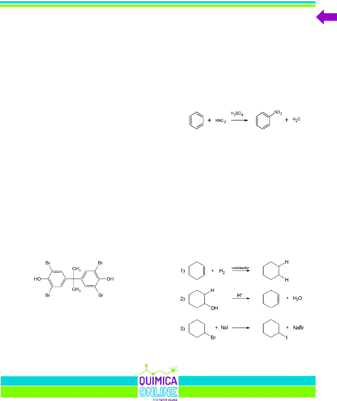3000 QUESTÕES DE QUÍMICA 750 fármacos, dentre outros. Uma classe de reações orgânicas de particular interesse são as reações de substituição, onde troca- se um átomo ou grupo de átomos de um composto orgânico por outro átomo ou grupo de átomos. Analise as reações orgânicas abaixo: I. C2H2 + 2H2 → C2H6 II. C2H6 + Cl2 → C2H5Cl + HCl III. C2H6O → C2H4 + H2O IV. C2H6 + HNO3 → C2H5NO2 + H2O Das reações mostradas, são reações de substituição: a) Apenas I e II. b) Apenas I e III. c) Apenas II e IV. d) Apenas I, III e IV. e) Apenas II, III e IV. 22 - (FMABC SP) Nem mesmo as profundezas dos oceanos, consideradas as áreas mais intocadas do planeta, estão livres da influência humana. Amostras de anfípodas, crustáceos semelhantes aos camarões, coletadas a profundidades que variavam de 7 mil a 10 mil metros em duas áreas do Oceano Pacífico, revelaram níveis elevados de dois produtos químicos: os bifenilpoliclorados, usados por décadas em fluidos de refrigeração; e os bifenilpolibromados, empregados como retardadores da propagação de chamas em tintas, tecidos e materiais da indústria automobilística e aeronáutica. (Adaptado de: Revista Pesquisa Fapesp, março de 2017) A estrutura do tetrabromobisfenol A, um exemplo de bifenilpolibromado, está representada a seguir. A reação típica para a formação do tetrabromobisfenol A, partindo do bisfenol A, é de a) condensação. b) hidrólise. c) esterificação. d) adição. e) substituição. 23 - (FCM PB) A Química Orgânica estuda os compostos que possuem carbono. Atualmente aproximadamente dez milhões são os compostos existentes, mas cerca de nove milhões são de compostos orgânicos. Uma molécula orgânica complexa pode se quebrar, pois seus átomos adquirirem novas disposições, por um grande número de processos. Há também outros métodos para adicionarem a essa molécula mais átomos ou substituir seus átomos por outros átomos. A Química Orgânica resume-se em identificar essas reações, como elas se realizam e as suas possíveis aplicações na síntese de compostos. Observe as reações abaixo e as classifique-as: I. CH2=CH-CH=CH2+Cl2 → Cl-CH2-CH=CH-CH2Cl II. III. CH3-CHCl-CH3+KOH ⎯⎯⎯ →⎯ OHC 62 KCl+H2O+CH3-CH=CH2 A classificação, respectivamente: a) I. Adição; II. Eliminação; III. Substituição b) I. Eliminação; II. Adição; III. Substituição c) I. Eliminação; II. Substituição; III. Adição d) I. Adição; II. Substituição; III. Eliminação e) I. Substituição; II. Adição; III. Eliminação 24 - (FPS PE) A produção de muitos produtos químicos sintéticos, tais como drogas, plásticos, aditivos alimentares, tecidos, dependem de reações orgânicas. As reações orgânicas são reações químicas envolvendo compostos orgânicos. As reações orgânicas 1, 2 e 3 descritas abaixo podem ser classificadas, respectivamente, como reações de: a) substituição, adição e eliminação. b) adição, rearranjo e substituição. 3000 QUESTÕES DE QUÍMICA 751 c) adição, rearranjo e redox. d) adição, eliminação e substituição. e) redox, adição e eliminação. 25 - (FPS PE) O composto bromo-cicloexano é convertido em cicloexanol através da reação com hidróxido de sódio, de acordo com o esquema abaixo. Nesse caso, é correto afirmar que ocorre uma reação de a) isomerização. b) eliminação. c) adição. d) tautomerização. e) substituição. 26 - (Univag MT) Atualmente, grande parte da produção industrial do ácido clorídrico provém de reações que ocorrem entre compostos orgânicos e cloro (Cl2), gerando esse ácido como subproduto. Um exemplo é a cloração do benzeno, que é uma reação de a) saponificação. b) hidrólise. c) adição. d) substituição. e) esterificação. 27 - (UFU MG) O butano é comumente utilizado nos botijões de gás de cozinha, como combustível de isqueiros, matéria-prima na produção da borracha sintética, aquecimento de piscinas e saunas, dentre outros usos. Por ser inodoro, acrescenta-se mercaptano no botijão a fim de que as pessoas identifiquem vazamentos, caso ocorram. O butano pode ser obtido a partir do 2-butino, conforme a equação química a seguir. Para que o 2-butino se transforme no gás de cozinha, é necessário submetê-lo a uma reação de a) adição de hidrogênios na ligação tripla, que é mais reativa que as ligações duplas. b) substituição dos hidrogênios em presença de platina, que é um catalisador. c) hidrogenação catalítica, em que o hidrogênio atacará as ligações insaturadas. d) desidratação, em que ocorre a perda de água na estrutura do 2-butino. 28 - (UFRGS RS) A reação do 2-bromo-2-metilpropano (A) com o etóxido de sódio (B), usando etanol como solvente, leva a uma mistura de produtos C e D, apresentada abaixo. Assinale a alternativa que preenche corretamente as lacunas do enunciado abaixo, na ordem em que aparecem. 3000 QUESTÕES DE QUÍMICA 752 Em relação aos produtos, é correto afirmar que C é formado por uma reação de ........; e D, por uma reação de ........ . a) substituição – desidratacão b) substituição – eliminação c) oxidação – desidrogenação d) adição – eliminação e) adição – desidratação 29 - (ENEM) O trinitrotolueno (TNT) é um poderoso explosivo obtido a partir da reação de nitração do tolueno, como esquematizado. A síntese do TNT é um exemplo de reação de a) neutralização. b) desidratação. c) substituição. d) eliminação. e) oxidação. 30 - (UNISC RS) A reação entre o limoneno e H3O+ produzirá, predominantemente, um diálcool de acordo com a equação a seguir HO OH + H3O+ Esta reação é classificada como a) eliminação. b) redução. c) substituição. d) esterificação. e) adição. 31 - (UEPA) Analise as reações e seus produtos orgânicos abaixo. CH CH2 CH2 CH3 H2 Ni/25ºC + HBr CH2CH3 AlCl3 Br+ CH3CH2 CH2CH3 CrO3, CH3CO2H H2SO4 aq. COOH Quanto à classificação da