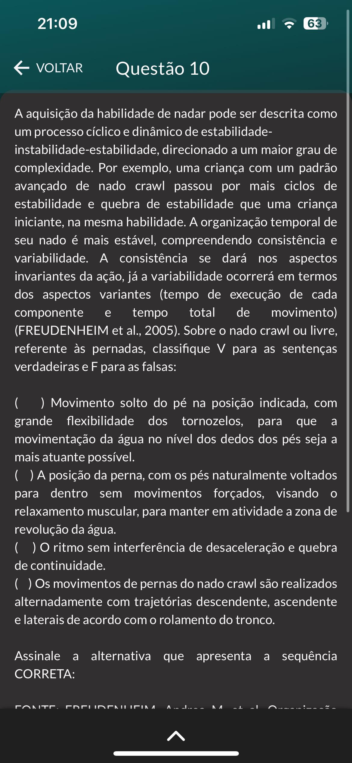 21:09 63 VOLTAR Questão 10 A aquisição da habilidade de nadar pode ser descrita como um processo cíclico e dinâmico de estabilidade- instabilidade-estabilidade, direcionado a um maior grau de complexidade. Por exemplo, uma criança com um padrão avançado de nado crawl passou por mais ciclos de estabilidade e quebra de estabilidade que uma criança iniciante, na mesma habilidade. A organização temporal de seu nado é mais estável, compreendendo consistência e variabilidade. A consistência se dará nos aspectos invariantes da ação, já a variabilidade ocorrerá em termos dos aspectos variantes (tempo de execução de cada componente e tempo total de movimento) (FREUDENHEIM et al., 2005). Sobre O nado crawl ou livre, referente às pernadas, classifique V para as sentenças verdadeiras e F para as falsas: ( ) Movimento solto do pé na posição indicada, com grande flexibilidade dos tornozelos, para que a movimentação da água no nível dos dedos dos pés seja a mais atuante possível. ( ) A posição da perna, com os pés naturalmente voltados para dentro sem movimentos forçados, visando O relaxamento muscular, para manter em atividade a zona de revolução da água. ( ) O ritmo sem interferência de desaceleração e quebra de continuidade. ( ) Os movimentos de pernas do nado crawl são realizados alternadamente com trajetórias descendente, ascendente e laterais de acordo com rolamento do tronco. Assinale a alternativa que apresenta a CORRETA: