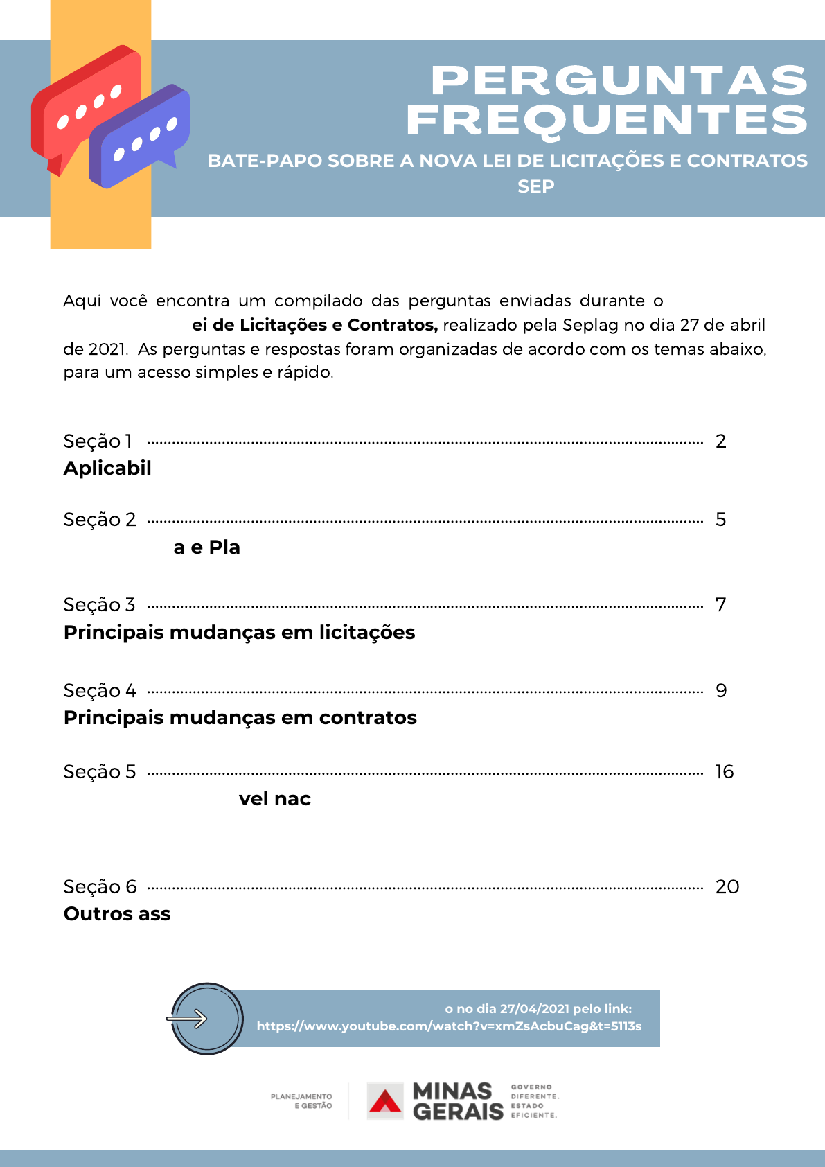 Seção 1 Aplicabilidade da nova lei e convivência com outros normativos Seção 2 Governança e Planejamento das contratações Seção 5 Discussões em nível nacional - centralização, portal nacional, procedimentos auxiliares PERGUNTAS FREQUENTES Aqui você encontra um compilado das perguntas enviadas durante o Bate Papo sobre a Nova Lei de Licitações e Contratos, realizado pela Seplag no dia 27 de abril de 2021. As perguntas e respostas foram organizadas de acordo com os temas abaixo, para um acesso simples e rápido. BATE-PAPO SOBRE A NOVA LEI DE LICITAÇÕES E CONTRATOS SEPLAG | 27 DE ABRIL DE 2021 Acesse o bate-papo realizado no dia 27/04/2021 pelo link: https://www.youtube.com/watch?v=xmZsAcbuCag&t=5113s Seção 3 Principais mudanças em licitações Seção 4 Principais mudanças em contratos Seção 6 Outros assuntos 2 5 7 9 16 20 Aplicabilidade da nova lei e convivência com outros normativos Resposta: A Nova Lei de Licitações e Contratos (NLLC), Lei nº 14.133 entrou em vigor no dia 1º de abril de 2021. Nos arts. 190, 191 e 193 da Lei 14.133/2021 são expostos critérios de transição, facultando ao gestor o uso tanto do regime administrativo da Lei nº 8.666, de 1993, da Lei nº 10.520, de 2002 e os arts. 1º a 47-A da Lei nº 12.462/2011 quanto o novo regime da NLLC em um período de 2 anos. A publicação da NLLC apenas revogou de imediato a seção “Dos crimes e das Penas” prevista na Lei nº 8.666/1993. Logo, o regime jurídico utilizado no processo licitatório será, nos termos da lei, de escolha do gestor, durante 2 anos, observando a indicação da opção no instrumento pertinente. Contudo, a Advocacia Geral do Estado de Minas Gerais orientou os gestores públicos para a não realização de licitações de acordo com a Lei nº 14.133, de 2021, considerando a necessidade de amadurecimento jurídico da legislação, a regulamentação de diversos pontos e a capacitação dos agentes públicos. 2- Quais são as leis que continuarão sendo usadas paralelamente à 14.133/2021? Resposta: A Lei nº 8.666/1993, a Lei nº 10.520/2002, e os arts. 1º a 47-A da Lei nº 12.462/2011 continuam vigentes até 1º.04.2023, quando serão revogados e somente estará vigente a Lei nº. 14.133/2021. 1 2 1 - Entendo que essa nova lei passará a ser obrigatória a partir de 2023. Até então podemos usar a Lei nº. 8.666/1993. É isso mesmo? Ao deixar de se aplicar a Lei nova de imediato, não corremos o risco da "ineficácia integral" da lei, pois a regulamentação do PNCP pode demorar muito para se concretizar. Como a nova LLC revogará as Leis 8.666, 10.520, e parte do RDC em dois anos, no momento em que o estado disponibilizar as regulamentações para a aplicação da NLLC, será obrigatório o seu uso? Aplicabilidade da nova lei e convivência com outros normativos Resposta: A Nova Lei de Licitações e Contratos (NLLC), Lei nº 14.133 entrou em vigor no dia 1º de abril de 2021. Nos arts. 190, 191 e 193 da Lei 14.133/2021 são expostos critérios de transição, facultando ao gestor o uso tanto do regime administrativo da Lei nº 8.666, de 1993, da Lei nº 10.520, de 2002 e os arts. 1º a 47-A da Lei nº 12.462/2011 quanto o novo regime da NLLC em um período de 2 anos. A publicação da NLLC apenas revogou de imediato a seção “Dos crimes e das Penas” prevista na Lei nº 8.666/1993. Logo, o regime jurídico utilizado no processo licitatório será, nos termos da lei, de escolha do gestor, durante 2 anos, observando a indicação da opção no instrumento pertinente. Contudo, a Advocacia Geral do Estado de Minas Gerais orientou os gestores públicos para a não realização de licitações de acordo com a Lei nº 14.133, de 2021, considerando a necessidade de amadurecimento jurídico da legislação, a regulamentação de diversos pontos e a capacitação dos agentes públicos. Resposta: Segundo a Lei nº. 14.133/2021: Art. 190. O contrato cujo instrumento tenha sido assinado antes da entrada em vigor desta Lei continuará a ser regido de acordo com as regras previstas na legislação revogada. Art. 191. Até o decurso do prazo de que trata o inciso II do caput do art. 193, a Administração poderá optar por licitar ou contratar diretamente de acordo com esta Lei ou de acordo com as leis citadas no referido inciso, e a opção escolhida deverá ser indicada expressamente no edital ou no aviso ou instrumento de contratação direta, vedada a aplicação combinada desta Lei com as citadas no referido inciso. Parágrafo único. Na hipótese do caput deste artigo, se a Administração optar por licitar de acordo com as leis citadas no inciso II do caput do art. 193 desta Lei [Lei nº. 8.666/1993, Lei nº. 10.520/2002 ou arts. 1º a 47-A da Lei nº. 12.462/2011], o contrato respectivo será regido pelas regras nelas previstas durante toda a sua vigência. (grifo nosso). (continua na próxima página) 3 - Entendo que essa nova lei passará a ser obrigatória a partir de 2023. Até então podemos usar a Lei nº. 8.666/1993. É isso mesmo? Ao deixar de se aplicar a Lei nova de imediato, não corremos o risco da "ineficácia integral" da lei, pois a regulamentação do PNCP pode demorar muito para se concretizar. Como a nova LLC revogará as Leis 8.666, 10.520, e parte do RDC em dois anos, no momento em que o estado disponibilizar as regulamentações para a aplicação da NLLC, será obrigatório o seu uso? 4 - Tenho contratos em vigor que ultrapassarão dois anos. Como será quando a Lei nº. 8.666/93 caducar? Deverá ser feita uma adaptação no aditivo. Caso afirmativo, como deve ser feito? Poderia explicar melhor o art. 191 da nova Lei? O aditivo poderia ser embasado na nova lei e o procedimento original na lei 8666/93? 1 3 Resposta: Não haverá conflito entre as leis vigentes, pois o gestor optará por utilizar somente um dos regimes para aplicar ao longo de todo processo de licitação ou contratação, desde os atos iniciais da fase preparatória até o fim da 