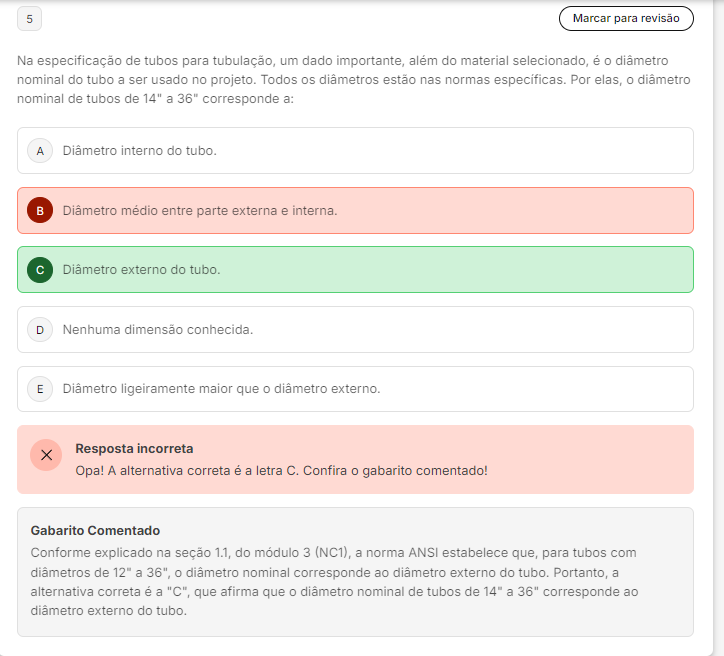 5 Marcar para revisão Na especificação de tubos para tubulação, um dado importante, além do material selecionado, é O diâmetro nominal do tubo a ser usado no projeto. Todos os diâmetros estão nas normas Por elas, O diâmetro nominal de tubos de 14" a 36" corresponde a: A Diâmetro interno do tubo. B Diâmetro médio entre parte externa e interna C Diâmetro externo do D Nenhuma dimensão E Diâmetro ligeiramente maior que diâmetro externo. Resposta incorreta Opa! A alternativa correta é a letra C. Confira gabarito comentado! Gabarito Comentado Conforme explicado na seção 1.1, do módulo 3 (NC1), a norma ANSI estabelece que, para tubos com diâmetros de 12" a diâmetro nominal corresponde ao diâmetro externo do tubo. Portanto, a alternativa correta é a "C", que afirma que diâmetro nominal de tubos de 14" a 36" corresponde ao diâmetro externo do tubo.