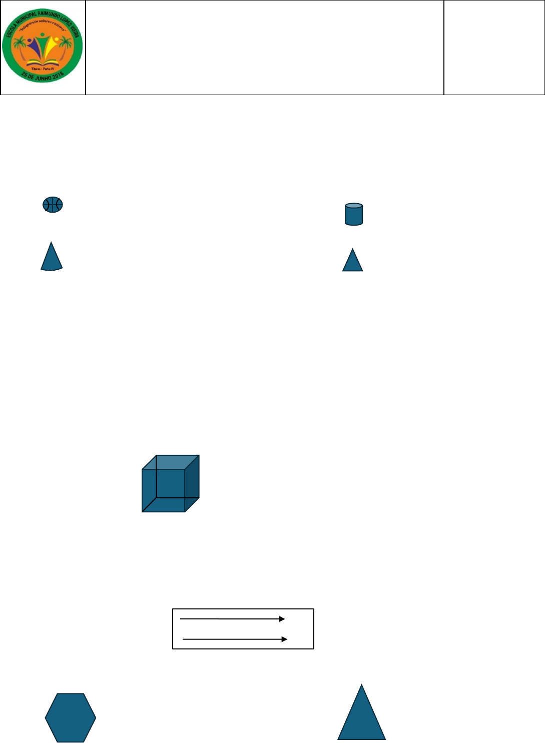 UNIDADE ESCOLAR RAIMUNDO LOPES VIEIRA CURSO: ENSINO FUNDAMENTAL ALUNO (A): _____________________________________________ Nº ____ ANO: 4º TURMA: “A” TURNO: MANHÃ DISCIPLINA: MATEMÁTICA DATA: _____/ _____/ 2024 PROFESSOR (a): JOSIMAR AVAL. QUALIT.:_______ + AVAL. QUANT.:_______ MÉDIA MENSAL:________ _________________________ Rubrica do (a) Professor (a) VERIFICAÇÃO DE APRENDIZAGEM 1. Qual o nome dos objetos abaixo, que se parecem com figuras espaciais. A) B) C) . D) . E) . F) . 2. Desenhe um poliedro que tem superfície plana. 3. Dê 2 exemplos de corpos redondos. (figura ou nome). 4. No paralelepípedo abaixo, tem quantos vértices? A) 2 B) 6 C) 8 D) 12 5. Como são representadas as retas? A) Letras maiúsculas (alfabeto). B) Letras minúsculas (alfabeto). 6. Observe a figura e responda: A B A) ( ) Retas Paralelas. B) ( ) Retas Concorrentes. 7. Quantos segmentos de reta há em cada figura? A) . B) . 8. O que é uma semirreta? 9. De acordo com as figuras, diga se é uma reta, semirreta ou segmento de reta. A B B A A B A) . B) . C) . 10. O poliedro abaixo, é uma pirâmide de base triangular. Ela tem quantas: · Faces ____________________ · Vértices __________________ · Arestas __________________BOA SORTE! image1.jpeg image2.jpeg