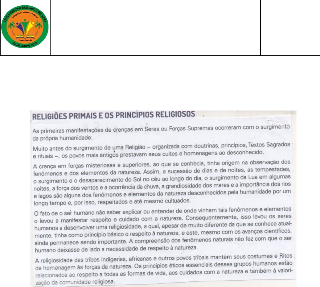 UNIDADE ESCOLAR RAIMUNDO LOPES VIEIRA CURSO: ENSINO FUNDAMENTAL ALUNO (A): _____________________________________________ Nº ____ ANO: 8º TURMA: _____ TURNO: TARDE DISCIPLINA: E. RELIGIOSO DATA: _____/ _____/ 2024 PROFESSOR (a): IOLANDA AVAL. QUALIT.:_______ + AVAL. QUANT.:_______ MÉDIA MENSAL:________ _________________________ Rubrica do (a) Professor (a) VERIFICAÇÃO DE APRENDIZAGEM · Leia o texto e responda as questões a seguir: 1. Segundo o texto, como as primeiras manifestações de crenças em seres ou forças supremas ocorreram? __________________________________________________________________________________________________________________________________________________________________________________ 2. Explique, como os povos mais antigos prestavam seus cultos e homenagens ao desconhecido? __________________________________________________________________________________________________________________________________________________________________________________ 3. Identifique alguns fenômenos e elementos da natureza desconhecidos pela humanidade por um longo tempo. __________________________________________________________________________________________________________________________________________________________________________________ 4. O fato de o ser humano não saber explicar ou entender de onde vinham tais fenômenos e elementos o levou manifestar respeito e cuidado com a: A) Fenômeno B) Natureza C) Ensinamentos D) Religião 5. Para as diferentes religiões, todas as formas de vida devem ser preservadas, protegidas e defendidas, ou seja, um princípio fundamental é o respeito à: A) Vida B) Caridade C) Amor D) Amizade 6. Nas religiões que formam o sistema religioso do Hinduísmo, é possível apresentar os princípios religiosos com base na saudação: A) Amém B) Namastê C) Saravá D) Shalom 7. O que nos leva a pensar no primeiro momento de alguma situação ou existência de algo, mas também pode estar associada a normas, posições ou diretrizes especificas de conduta para se conquistar algo: A) Valor B) Respeito C) Princípio D) Carinho 8. De acordo com os estudos em sala de aula existem alguns princípios considerado universais, cite-os. __________________________________________________________________________________________________________________________________________________________________________________ 9. Como se caracteriza os princípios de religião hindu? __________________________________________________________________________________________________________________________________________________________________________________ image1.jpeg image2.jpeg image3.jpeg