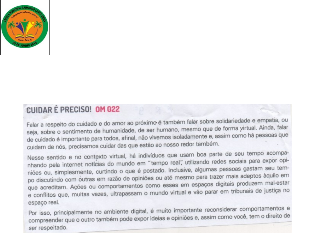 UNIDADE ESCOLAR RAIMUNDO LOPES VIEIRA CURSO: ENSINO FUNDAMENTAL ALUNO (A): _____________________________________________ Nº ____ ANO: 9º TURMA: “A” TURNO: TARDE DISCIPLINA: E. RELIGIOSO DATA: _____/ _____/ 2024 PROFESSOR (a): IOLANDA AVAL. QUALIT.:_______ + AVAL. QUANT.:_______ MÉDIA MENSAL:________ _________________________ Rubrica do (a) Professor (a) VERIFICAÇÃO DE APRENDIZAGEM · Leia o texto e responda as questões a seguir: 1. Explique sobre o respeito, cuidado e amor ao próximo: ____________________________________________________________________________________________________________________________________________________________________________________________ 2. De acordo com o texto, como os indivíduos utilizam as redes sociais atualmente. ____________________________________________________________________________________________________________________________________________________________________________________________ 3. Segundo o texto, ações ou comportamento em espaços digitais produzem o que? ____________________________________________________________________________________________________________________________________________________________________________________________ 4. Por isso principalmente no ambiente digital é muito importante reconsiderar o que? ____________________________________________________________________________________________________________________________________________________________________________________________ 5. Como quase tudo em nossa vida, o hábito ou a necessidade em nosso cotidiano também precisa de limites em relação ao uso da: A) Conhecimento B) Tecnologia C) Respeito D) Ensinamentos 6. Em 2020, ano que marcou o início da pandemia de covid-19, o brasil registrou um grande aumento no úmero de: A) Crimes cibernéticos B) Crimes especiais C) Crimes comuns D) Crimes próprios 7. São atos praticados com o auxílio de computador ou outros dispositivos eletrônicos com conexão à internet e que são considerados atos criminosos, por produzirem vários tipos de danos às pessoas, como pessoas ou patrimoniais: A) Pensamentos B) Estudos C) Valorização D) Crimes cibernéticos 8. Nas últimas décadas, com o uso da internet cada vez mais popularizado e a falta de regras para controle de espaço virtual e a identificação dos usuários, muitos internautas têm se aproveitando da situação para a prática de atos considerados criminoso no: A) Escola B) Condomínio C) Ambiente virtual D) Edifício 9. Os princípios e ensinamentos devem ser seguidos em todos os momentos da vida. “não fazer aos outros o que não quer que façam a você”, esse ensinamento pertence qual religião? A) Budismo B) Cristianismo C) Taoismo D) Judaísmo 10. Em sua opinião, quais são as atividades que as pessoas mais realizam na internet? ____________________________________________________________________________________________________________________________________________________________________________________________ image1.jpeg image2.jpeg image3.jpeg