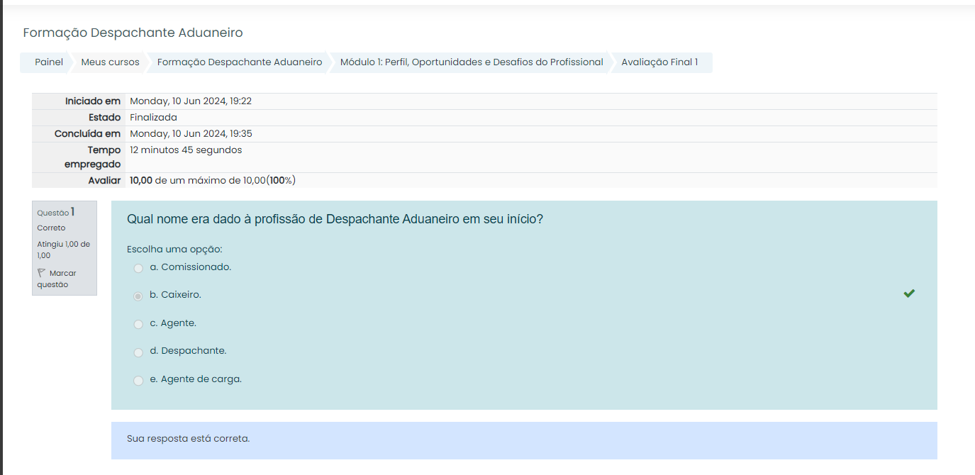 Formação Despachante Aduaneiro Painel Meus cursos Formação Despachante Aduaneiro Módulo 1: Perfil, Oportunidades e Desafios do Profissional Avaliação Final 1 Iniciado em Monday, 10 Jun 2024, 19:22 Estado Finalizada Concluída em Monday, 10 Jun 2024, 19:35 Tempo 12 minutos 45 segundos empregado Avalian 10,00 de um máximo de 10,00(100%) Questão 1 Qual nome era dado à profissão de Despachante Aduaneiro em seu início? Correto Atingiu 1,00 de Escolha uma 1,00 a. Marcar questão b. C. Agente. d. Despachante. e. Agente de carga. Sua resposta