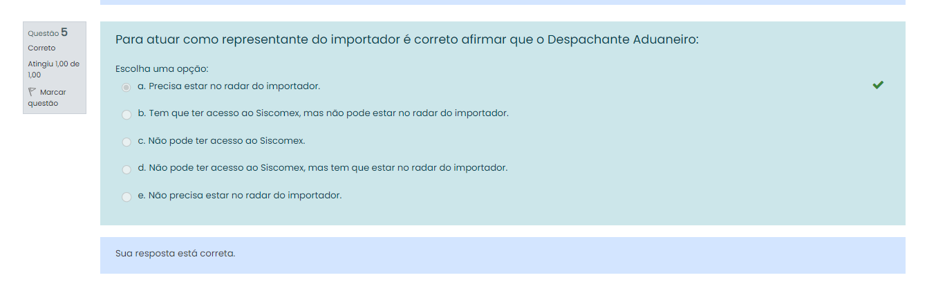 Questão 5 Para atuar como representante do importador é correto afirmar que Despachante Aduaneiro: Correto Atingiu de Escolha uma opção: 1,00 Precisa estar no radar do importador. Marcar questão b. Tem que ter acesso ao Siscomex, mas não pode estar no radar do importador. C. Não pode ter acesso ao Siscomex. d. Não pode ter acesso ao Siscomex, mas tem que estar no radar do importador. e. Não precisa estar no radar do importador. Suo resposta está correta.