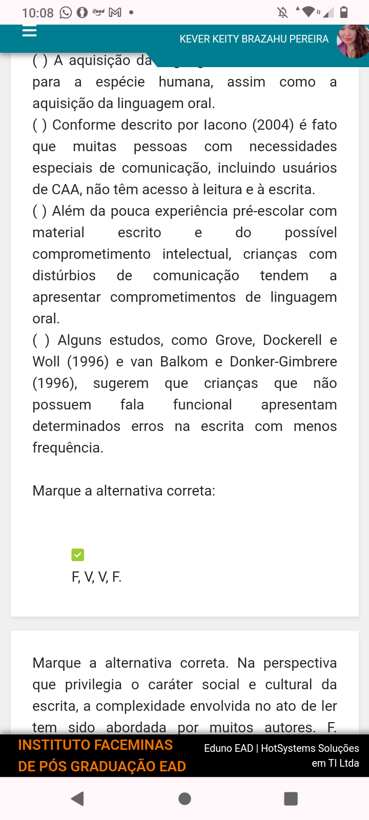 10:08 M KEVER KEITY BRAZAHU PEREIRA A aquisição da para a espécie humana, assim como a aquisição da linguagem oral. Conforme descrito por lacono (2004) é fato que muitas pessoas com necessidades especiais de comunicação, incluindo usuários de CAA, não têm acesso à leitura e à escrita. Além da pouca experiência pré-escolar com material escrito e do possível comprometimento intelectual, crianças com distúrbios de comunicação tendem a apresentar comprometimentos de linguagem oral. Alguns estudos, como Grove, Dockerell e Woll (1996) e van Balkom e Donker-Gimbrere (1996), sugerem que crianças que não possuem fala funcional apresentam determinados erros na escrita com menos frequência. Marque a alternativa correta: F, V, V, F. Marque a alternativa correta. Na perspectiva que privilegia o caráter social e cultural da escrita, a complexidade envolvida no ato de ler tem sido abordada por muitos autores. F. INSTITUTO FACEMINAS Eduno EAD HotSystems Soluções DE PÓS GRADUAÇÃO EAD em TI Ltda