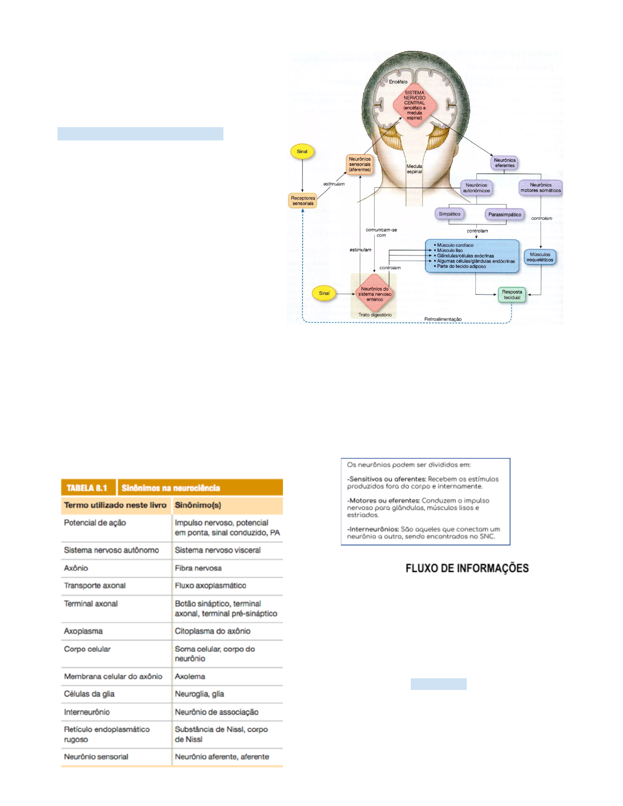 Isadora Freire Fisiologia do Sistema Nervoso NEURÔNIOS: CÉLULAS E REDE PROPRIEDADE EMERGENTE “São processos que não podem ser previstos a partir do conhecimento que temos sobre as propriedades individuais das células nervosas e suas conexões.” • A capacidade de funcionamento não está ligada a quantidade de neurônios e sim de conexões. Consciência, inteligência e emoções Consciência: ciência do próprio corpo (tudo o que a gente sente) Inteligência: capacidade de processar, memória. Habilidade de sentir, processar o sentimento e reagir. Emoções: resposta ao meio, exteriorizar o que o cérebro recebe (forma como processamos) Recebe a informação processa baseada na memória responde baseado nas emoções Sistema Nervoso Central (encéfalo e medula espinal) = processa, coordena (memória) Grupo de neurônios que tem memórias Memória = estímulo, sinapse (neurônio conduz sinapse) - memória voluntária - memória involuntária ESTÍMULO → receptor sensorial → sinal de entrada → CENTRO INTEGRADOR → sinal de saída → efetor → RESPOSTA • Receptores sensoriais monitoram condições internas e externas • Neurônios sensitivos enviam informações para SNC (centro integrador – processar) • Quando é necessário uma resposta … SNC usa neurônios eferentes (motores) para células “alvo” (músculos e glândulas) • Neurônios eferentes autônomos são divididos em Simpático e Parassimpático • (3º. Sistema): S. N. Entérico – rede na parede do TGI Neurônio e Glia (células suporte) • Neurônios são classificados pela suas estruturas (números de processos originados do corpo celular) ou pela suas funções • Agrupamentos de longos axônios formam nervos, podem ser nervos sensoriais, nervos motores e nervos mistos. Corpo celular (ou soma): possui núcleo (DNA - molde para síntese proteica) e organelas para atividades celulares Dendritos: recebem informações aumentando a superfície de contato Espinhos dendríticos: recebe informações de entrada e transfere para uma região integradora dentro do neurônio. No SNC podem enviar informações porque contém polirribossomos (produzem proteínas) Axônios: conduzem sinais de saída, no terminal pode conter mitocôndrias, vesículas membranosas ou junções comunicantes • Citoplasma é composto por fibras e filamentos Transporte lento: do corpo celular para terminal, componentes que serão consumidos rapidamente (enzimas e proteínas) Transporte rápido: Anterógrado: vesículas e mitocôndrias Retrógrado: componentes celulares velhos • Composto por Pré, Pós e Fenda sináptica • Podem ser químicas ou elétricas “Como neurônios encontram seus alvos e fazem sinapse?” R: sinais químicos controlam a diferenciação de células tronco em neurônios e atraem os cones de crescimento (pontas especializadas) *A extremidade em desenvolvimento do axônio (em azul) é uma região achatada, repleta de microtúbulos (em verde) e filamentos de actina (em vermelho e amarelo), que, continuamente, une as suas porções distais, entendendo a ponta do axônio enquanto ele procura o seu alvo • A formação da sinapse deve ser seguida de atividade elétrica ou química se não desaparecerá (depende de fatores neurotróficos) – “use ou perca” • O número de células e sua localização são fixas porém as sinapses não, rearranjos ocorrem por toda vida. Células da Glia (suporte aos neurônios) • Comunica-se entre si e com neurônios fornecendo suporte físico e bioquímico (tróficos) • SNP – células de Schwann e Satélites • SNC – células oligodendrócitos, microglia, astrócitos e células ependimárias Bainha de Mielina (suporte aos neurônios) • Células de Schwann (SNP) e oligodendrócitos (SNC) • Formado por várias camadas de membrana celular (fosfolipídeos) • Junções comunicantes permitem fluxo de nutrientes e informações • Suporte físico, isolante e acelera condução Bainha de Mielina • Possui duas funções: - acelera a condução de impulsos pelo axônio - isola o axônio, menor interferência Exemplo: neurônios que saem da coluna e vão contrair o dedão do pé (neurônio motor somático) - O corpo do neurônio está na medula, sai o axônio, passa pela cintura, coxa, joelho até o dedão. - Supondo que tenha feito um exercício de quadríceps (acúmulo de ácido láctico), em que o lado de fora do neurônio está cheio de H+, o axônio passa por meio desse músculo cheio de ácido láctico (muda ambiente). - Se não tem bainha de mielina, a condução é interferida (pode encher de hidrogênio o músculo) - Ausência de bainha de mielina pode gerar tremores e não movimentos SNP Células de Schwann: um axônio pode possuir mais de 500 células, formando nódulos de Ranvier (entre uma célula a outra – área não mielinizada - permite transmissão de sinais elétricos) Se enrola ao redor do axônio e forma bainha de mielina Células satélite: formam cápsulas de suporte físico, químico e eletrofisiológico ao redor dos corpos dos neurônios localizados nos gânglios (são agrupamento de corpos celulares dos neurônios fora do SNC) SNC Oligodendrócitos: formação da bainha de mielina, uma célula atua em vários axônios. - Enrola no axônio também, mas como uma forma de sustentação (estrutura para deixar ele parado) Astrócitos: cerca de metade das células do encéfalo, formam uma rede usando as junções comunicantes, várias funções. Microglia: células do sistema imune, removem células danificadas e invasoras (bom) e libera ERO (espécie reativas de oxigênio) que formam radicais livres (neurodegenerativas – restos do metabolismo que usa oxigênio, causa alterações na membrana das células, degenera) • Células ependimárias: garante a movimentação do líquido cefalorraquidiano e forma uma camada epitelial fornecedora de células-tronco. Atividades que lesionam o SNC • Atividades por aceleração: boxe, piloto f