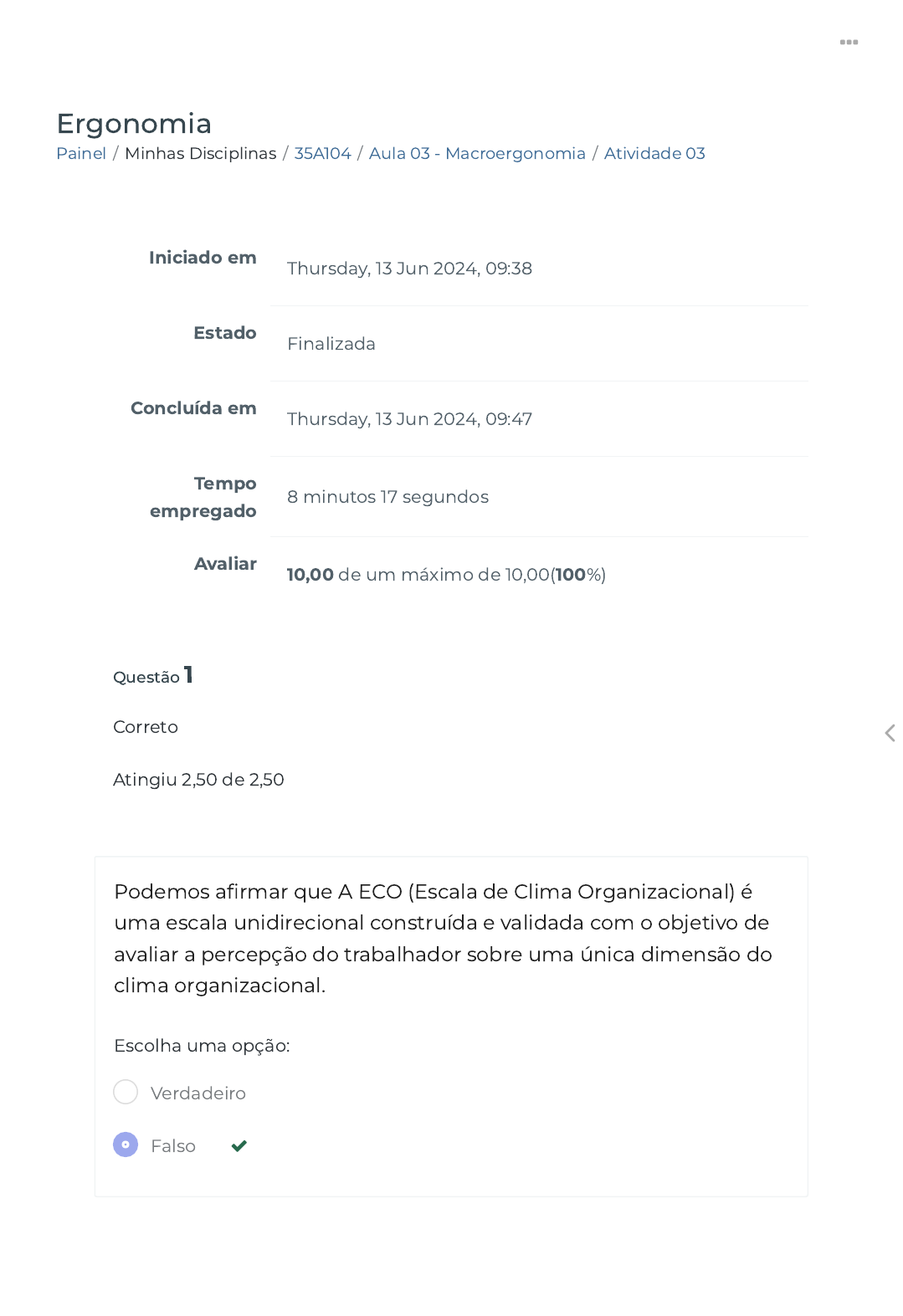 Painel / Minhas Disciplinas / 35A104 / Aula 03 - Macroergonomia / Atividade 03 Ergonomia Iniciado em Thursday, 13 Jun 2024, 09:38 Estado Finalizada Concluída em Thursday, 13 Jun 2024, 09:47 Tempo empregado 8 minutos 17 segundos Avaliar 10,00 de um máximo de 10,00(100%) Questão 1 Correto Atingiu 2,50 de 2,50 Podemos a�rmar que A ECO (Escala de Clima Organizacional) é uma escala unidirecional construída e validada com o objetivo de avaliar a percepção do trabalhador sobre uma única dimensão do clima organizacional. Escolha uma opção: Verdadeiro Falso https://ava.politecnicabr.com.br/my/ https://ava.politecnicabr.com.br/my/ https://ava.politecnicabr.com.br/course/view.php?id=1026 https://ava.politecnicabr.com.br/course/view.php?id=1026#section-4 https://ava.politecnicabr.com.br/mod/quiz/view.php?id=34037 https://ava.politecnicabr.com.br/ Questão 2 Correto Atingiu 2,50 de 2,50 Visa estabelecer parâmetros que permitam a adaptação das condições de trabalho às características psico�siológicas dos trabalhadores, de modo a proporcionar um máximo de conforto, segurança e desempenho e�ciente. Escolha uma opção: a. NR 33 - Ergonomia b. NR 15 - Ergonomia c. NR 17 - Ergonomia d. NR 18 - Ergonomia https://ava.politecnicabr.com.br/ Questão 3 Correto Atingiu 2,50 de 2,50 Nos locais de trabalho onde são executadas atividades que exijam solicitação intelectual e atenção constantes, como salas de controle, laboratórios, escritórios, salas de desenvolvimento ou análise de projetos, dentre outros, são recomendadas as seguintes condições de conforto, exceto na opção: Escolha uma opção: a. Velocidade do ar não superior a 0,45 m/s. b. Umidade relativa do ar não inferior a 40 (quarenta)por cento. c. Índice de temperatura efetiva entre 20°C (vinte) e 23°C (vinte e três graus centígrados). d. Níveis de ruído de acordo com o estabelecido na NBR 10152, norma brasileira registrada no INMETRO. https://ava.politecnicabr.com.br/ Questão 4 Correto Atingiu 2,50 de 2,50 O uso das cores no ambiente de trabalho pode interferir no ânimo do trabalhador e até na sua produtividade. Há cores que transmitem mais paz e tranquilidade, e outras que são mais densas. Marque a alternativa correta em relação a cor e sua indicação. Escolha uma opção: a. Vermelho - Perigo de colisão, atenção, alerta, risco de tropeço; em geral, as listras amarelas sobre um fundo preto indicam alerta nos transportes. b. Amarelo - Perigo, parar e proibido; alertas para fogo (é empregada em extintores e equipamentos de combate a incêndio). c. Azul - Nos serviços de resgate, indica saída de segurança e que as “coisas estão em ordem”; se refere a todas as formas de equipamento de resgate e primeiros socorros. d. Verde - Nos serviços de resgate, indica saída de segurança e que as “coisas estão em ordem”; se refere a todas as formas de equipamento de resgate e primeiros socorros. Entre em Contato https://www.politecnicabr.com.br 0800 084 2627 0800 084 2627 Links Úteis Dicas da nossa Diretora Acadêmica Planner de Estudos Declaração de Matrícula Orientações do AVA Abertura de Ticket https://www.politecnicabr.com.br/ https://soundcloud.com/user-501638417/sets/escola-politecnica-brasileira https://soundcloud.com/user-501638417/sets/escola-politecnica-brasileira https://storage.googleapis.com/sirius-pubstore/semestre_plannerdeestudo%20poli.pdf https://storage.googleapis.com/sirius-pubstore/semestre_plannerdeestudo%20poli.pdf https://storage.googleapis.com/sirius-pubstore/declaracao_matricula.pdf https://storage.googleapis.com/sirius-pubstore/declaracao_matricula.pdf https://storage.googleapis.com/sirius-pubstore/orientacoes_ava.pdf https://storage.googleapis.com/sirius-pubstore/orientacoes_ava.pdf https://storage.googleapis.com/sirius-pubstore/abertura_ticket.pdf https://storage.googleapis.com/sirius-pubstore/abertura_ticket.pdf https://ava.politecnicabr.com.br/ © 2022 - Escola Politécnica Brasileira Fale com o Tutor Cronograma de Estudos Manual de Estágio Manual de Competência Siga-nos nas redes sociais https://ava.politecnicabr.com.br/mod/quiz/0 https://ava.politecnicabr.com.br/mod/quiz/0 https://storage.googleapis.com/sirius-pubstore/fale_com_tutor.pdf https://storage.googleapis.com/sirius-pubstore/fale_com_tutor.pdf https://storage.googleapis.com/sirius-pubstore/cronograma_estudos.pdf https://storage.googleapis.com/sirius-pubstore/cronograma_estudos.pdf https://storage.googleapis.com/sirius-pubstore/manual_estagio.pdf https://storage.googleapis.com/sirius-pubstore/manual_estagio.pdf https://storage.googleapis.com/sirius-pubstore/manual_competencia.pdf https://storage.googleapis.com/sirius-pubstore/manual_competencia.pdf https://www.facebook.com/politecnicabr https://www.instagram.com/politecnicabr_oficial https://ava.politecnicabr.com.br/