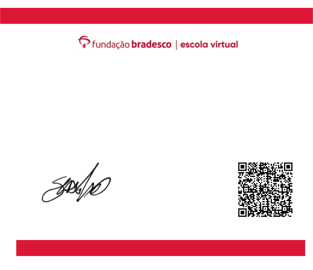 Certificado V4 C E R T I F I C A D O D E C O N C L U S Ã O Certificamos que LAIS SOARES NUNES concluiu o curso de EMPREENDEDORISMO E INOVAÇÃO, com carga horária de 12 hora(s), no período de 08.01.2020 a 31.01.2020. Osasco, 31 de janeiro de 2020. Simone Claudino de Carvalho Flores Escola Virtual LAIS SOARES NUNES Aluno (a) Código de Autenticidade: 4C2541AD-E785-40E5-ABA8-2918B4FF0D06 ou utilize o QR Code no portal da EV Fundação Bradesco Cidade de Deus, s/nº – Vila Yara – Osasco – SP – CEP 06029-900 CNPJ - 60.701.521/0001-06 www.ev.org.br 30/04/2024, 15:55 Escola Virtual - Fundação Bradesco https://lms.ev.org.br/mpls/Web/Lms/Student/PrintCertificateDialog.aspx?8TNfmPtQSZLtfzhL4TvyfN7F5Px7h4vS 1/1