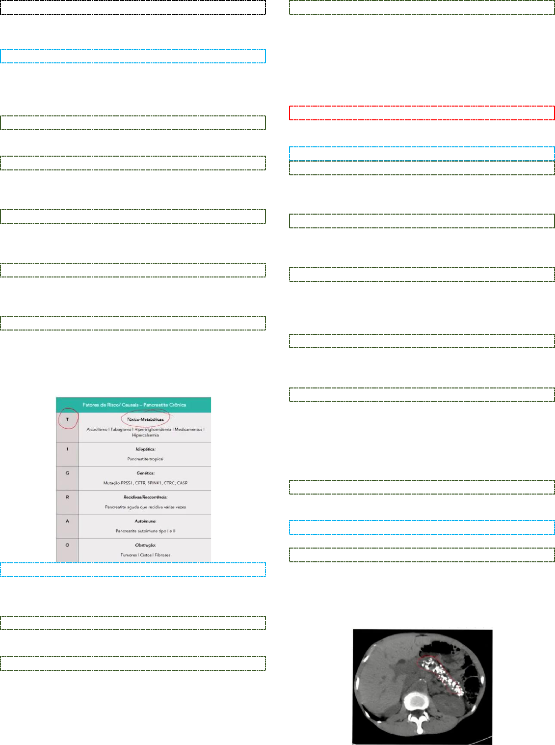 Hudson Mateus Motta – UNINTER - 5 año - 2024 Pancreatites crônica Perda da função pancreática de forma irreversível e progressiva. Etiologia Etilismo principal causa - 70-80% do casos. 3 a 7% dos etilistas evoluem para PC. Dieta, tabagismo, etnia, genético. 90% do pct fumantes que tem PC, são fumantes. Hipertrigliceridemia >1000mg/dl Varias agudas que fazem uma crônica. Genetica PRSS1 – mutações, hereditária. CFTR – Fibrose cística (principal causa de PC nas crianças) N34S Spink1 – aumenta 20x o risco de PC Autoimune Tipo I: Ligada ao IgG4 Tipo II: Ducto-central idiopática, igG4 normal. As duas respodem ao uso de corticoide. Obstrutiva Ducpancreatico principal > aumento da PA intrapancreatica. Tumores, cálculos ductais. Idiopatica 10 a 20% dos casos, precoce 20 anos ou tardio >50ª. Pancreatite tropical: Infancia + mutação do SPINK1 Recidiva e recorrência de recorrência de Pancreatite aguda. 10% PA para PC Principalmente se for grave. Manifestações clinica Retroperitoneal, Quadrante sup. Duodeno, vesícula biliar, ductocoleco (dentro da cabeça pancreática) Dor abdominal – principal caracterisca Epigastrica – Irradia para dorse. Variavel e progressiva, associada alimentação. Má digestão Não é presente na fase inicial, apenas quando 90% da função exócrina esta perdida, anos de evolução. Secreta enzimas digestivas. Diarreia crônica com esteatorreia. Perda de peso – pela ma digestão Hipovitaminose – A D E K Perda da função endócrina DM – perda na produção de insulina, tardio, após o estabelciemnto do distúrbio digestivo. 40 a 80% da PC tem, DM de difícil controle. Ictericia e colangite Pode ter 5 a 10%. Cbz pancreática, passa porção distal do colédoco, pela fibrose distal do colédoco. PCT típico Alcolico + Tabagista + multiplex PA Dor epigástrica + Perda de peso + esteatorreia + DM. Complicações Pseudocisto Pancreatico: complicação da aguda ou agudização, coleção fluida de conteúdo liquido com paredes bem definidas, assintomático. Obstrução: Obstrução do ductobiliar ou duodeno, tem relação com pancreas, 5 a 10%. Duodenal: Dor após comer, saciedade precoce. Ductobilar: Sx. Colestasica. Pseudoaneurisma: Enzima digestiva, que leva a lesão da aprede do vaso, A. esplênica, porção posterior do pâncreas. Dor distenção adbdominal, melena, sangramento leve e hemorragia aguda. Derrame intracavitários: Ruptura do ducto pancreático + fistula. Ascite: dor abdominal e distenção. Derrame pleural: dispneia + dor torácica. Trombose da veia esplênica: 11% dos pct. Relação intima com pâncreas, inflamação gera estado hipercoagubilidade, gera HT portal e é assintomático, sangraento gastrointestinal, ascite e esplenomegalia. Ins. Pancreatia Endocrina: 30 a 50% dos pct com PC. DM com difícil controle. Cancer de pâncreas: Inflamação crônica leva a câmbios celulares. Os sintomas se confundem com a PC. Diagnostico É difícil no inicio -Imagem normal + amilasa e lipasa normal. TC de abdômen é padrão ouro. Sensibilidade 56 a 95% CA de pâncreas, especidificade 85 a 95 % Inicio: normal. Atrofia do pâncreas 54%, Dilatação do ducto pancreático 68%, calficiação parenquimatosas e intraductais 50%. Hudson Mateus Motta – UNINTER - 5 año - 2024 Ressonancia Nuclear Magnetica de abdômen com colangiopancreatografia Melhor que a TC em casos iniciais. Mais caro e menos disponível Alterações: Irregularidades leves do ducto principal e seus ramos Ducto principal com áreas focais de estreitamento e dilatação + ectasia dos ramos laterias Ductoprincipal normal (inicial) Atrofia glandular. Ultrassom endoscópico Melhor exame para detectar PC em pacientes com alterações leves no estagio inicial Criterios de Rosemont – Alterações parenquimatosas e ductais. Testes funcionais Quantificação de elastase fecal Elastase = secretada pelo pâncreas – não se degrada pelo intestino. Valores normais em pct normal. Pancreas exocrino Detecção de gordura fecal Teste da secretina Estimulo de células ductais a liberar bicarbomanto. Teste da D-xilose PC normal. Teste útil para diferenciar ma absorção por doença da mucosa intestinal x Digestão deficitária. RESUMO Tratamento clinico Objetivo: Melhorar sintomas e retaradar progressãpo Equipe multidisciplinar Controlar a dor + Melhorar dos sintomas da IP + tt complicações. Cessar alcoolismo + Tabagismo + dieta adequada. Analgesia escalonada Analgesico simples > AINES > Tramadol/morfina Dor neuropática Antidepressivo (ISRS ou tri) = fluxetina Anticonvulsivantes = Gabapentina Ansioliticos = Pregabalina Enzimas pancreáticas Melhoram o distúrbio digestivo, mas não a dor. COncetração variável de lipase, protease e amilases, ingerir antes das refeições. Suplementação de vitaminas ADEK – lipossouliveis Triglicerides de cadea media Manejo no pct com perda de peso. • PCT com PC crônica – etiologia alcoolica. • Tratamento: Enzima pancreática ou pancreolipase. Analgésicos, AINES ou opioide. Hudson Mateus Motta – UNINTER - 5 año - 2024 Tratamento Qx. Principal indicação de QX é a dor refrataria Tratamento qx da dor: Semiologia Hudson Mateus Motta – UNINTER - 5 año - 2024
