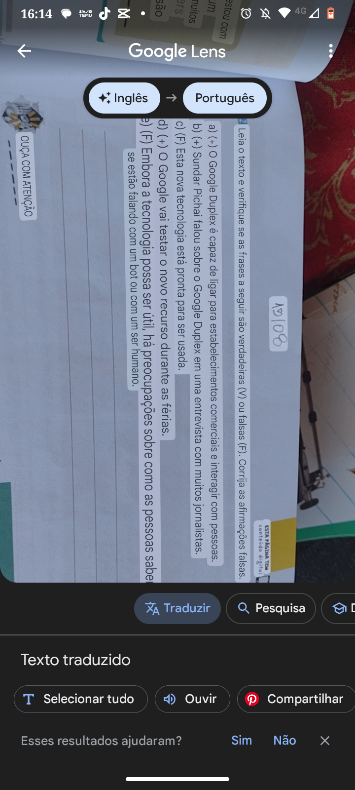 X ESTA TEM digital estou Leia o texto e verifique se as frases a seguir são verdadeiras (V) ou falsas (F). Corrija as afirmações falsas. Q com a) (+) Google Duplex é capaz de ligar para estabelecimentos comerciais e interagir com pessoas. b) (+) Sundar Pichai falou sobre o Google Duplex em uma entrevista com muitos jornalistas. c) (F) Esta nova tecnologia está pronta para ser usada. d) (+) O Google vai testar o novo recurso durante as férias. e) (F) Embora a tecnologia possa ser útil, há preocupações sobre como as pessoas saber se estão falando com um bot ou com um ser humano. COM ATENÇÃO