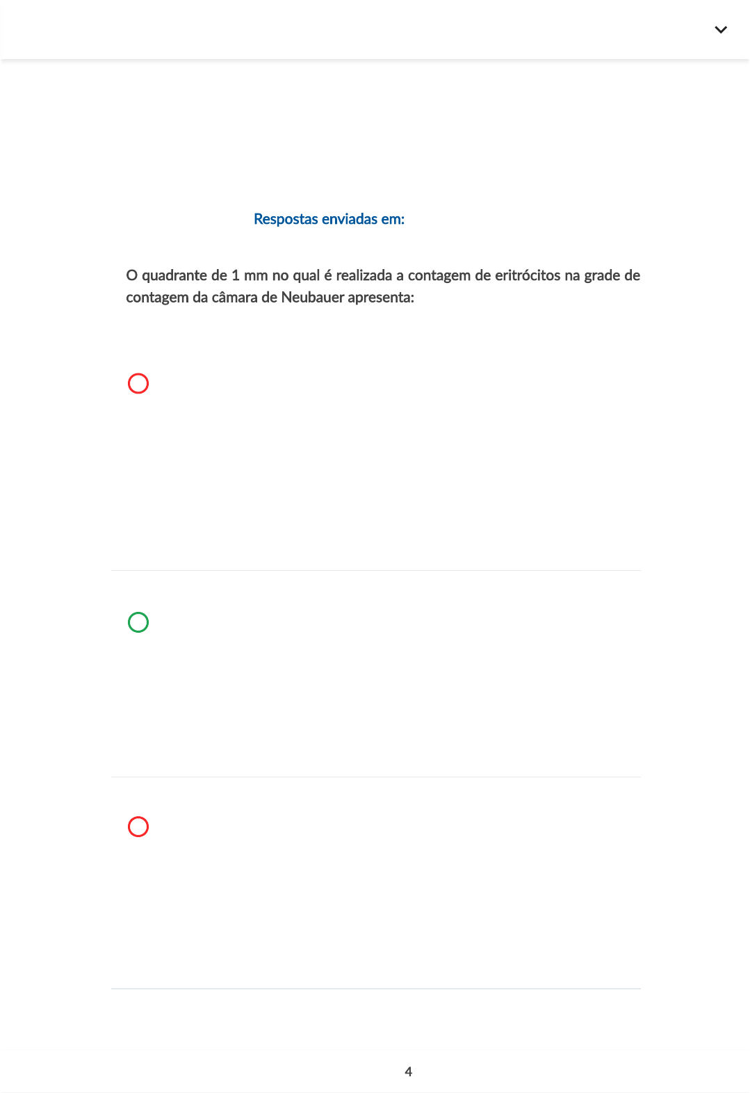 Pós Teste Respostas enviadas em: 15/08/2024 17:15 4. O quadrante de 1 mm no qual é realizada a contagem de eritrócitos na grade de contagem da câmara de Neubauer apresenta: Resposta incorreta. A. 16 quadrantes de 0,2 mm; Não há área de contagem delimitada na grade que apresente 16 quadrantes de 0,2 mm. Existem 16 quadrantes de 0,05 mm ou 16 quadrantes de 0,25 mm, como no caso da área de contagem dos leucócitos. Você acertou! B. 25 quadrantes de 0,2 mm; E cada quadrante de 0,2 mm é subdividido em 16 subáreas de 0,05 mm na região de contagem dos eritrócitos. Resposta incorreta. C. 25 quadrantes de 0,05 mm. As áreas de 0,05 mm se unem em 16 iguais para formar um quadrante de 0,2 mm, que se mu�plicam com 5 iguais, dando origem à área de 1 mm. 4 de 5 perguntas Anterior U2