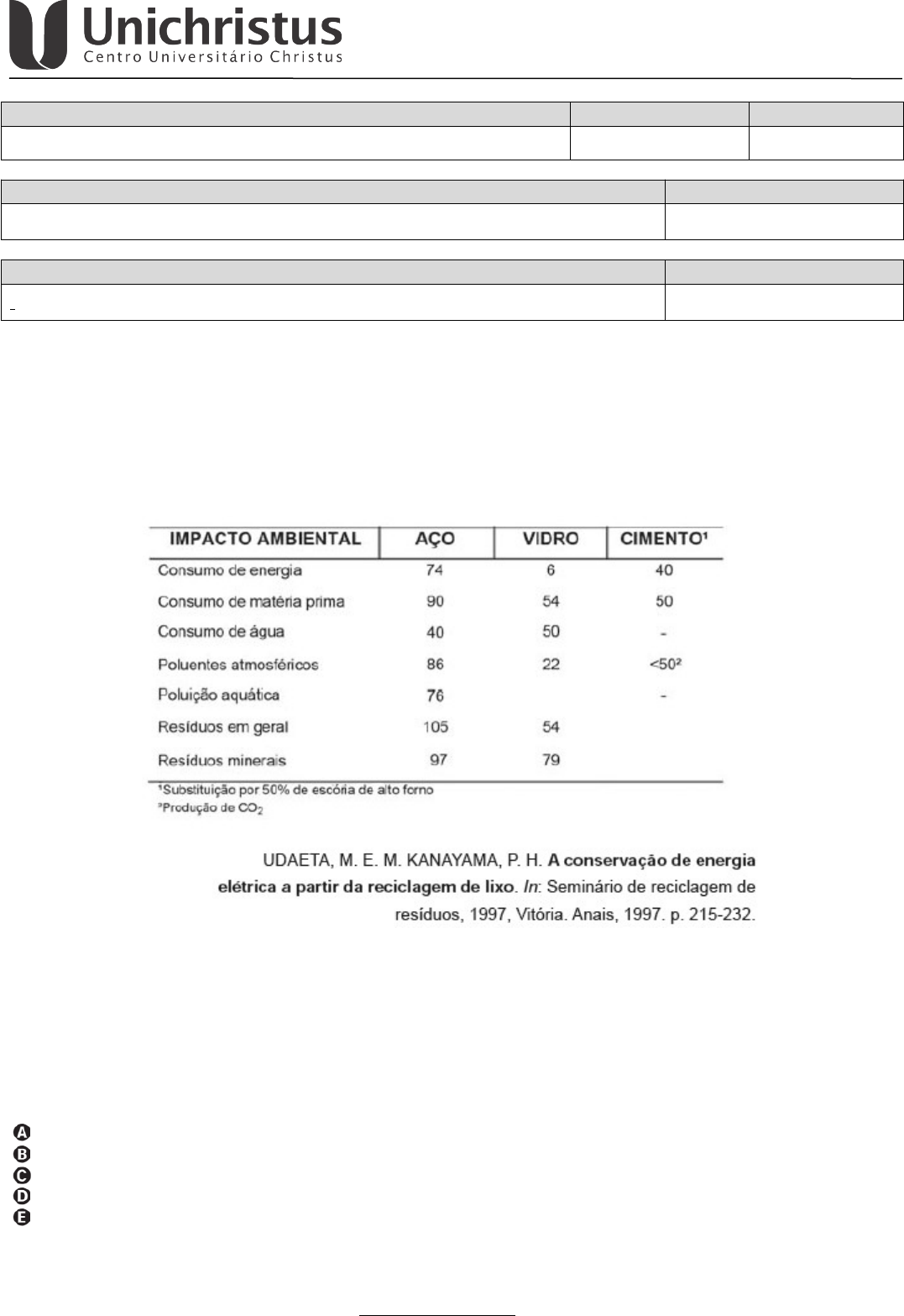 II LISTA DE QUESTÕES Curso Data Ano Gerência de Projetos De 18/08 até 13/08 2017.1 Conteúdos Professor(a) Tópicos de Engenharia Civil/ Gerência de Projetos Prof. Domingos Sávio Aluno(a) Matrícula QUESTÃO 1 ---------------------------------------------------------------------------------------------------------------------------- A maioria dos materiais gerados em uma obra de demolição pode e deve ser reaproveitada. Produzir utilizando materiais que podem ser reciclados é, às vezes, mais barato do que comprar matéria-prima, pois o preço da fabricação já está embutido no material de segunda mão. Na tabela 1, apresenta-se a redução do impacto ambiental (em %) da reciclagem de resíduos na produção de alguns materiais utilizados na indústria da construção civil. Tabela 1: Redução do impacto ambiental (em %) da reciclagem de resíduos na produção em alguns materiais de construção civil Praticando os chamados 3 Rs ─ redução, reutilização e reciclagem ─ na indústria da construção civil e tendo como referência a tabela acima, conclui-se que será possível diminuir I. o consumo de energia. II. a poluição do solo, da água e do ar. III. a exploração de recursos naturais. IV. a quantidade dos materiais utilizados na indústria da construção civil. V. os custos de produção, com o aproveitamento de recicláveis pelas indústrias. É correto o que se afirma em I e III, apenas. II e IV, apenas. IV e V, apenas. I, II, III e V, apenas. I, II, III, IV e V. QUESTÃO 2 ---------------------------------------------------------------------------------------------------------------------------- Uma indústria de blocos cerâmicos pretende utilizar queima de biomassa resultante de resíduos de madeira, para gerar energia térmica para seus fornos, que, atualmente, utilizam gás natural. Tal iniciativa poderá reduzir o consumo de combustível, porém será necessário um investimento no valor de 20% do consumo/ano atual de combustível, visando à adaptação dos fornos. Além disso, o transporte anual dos resíduos da fonte geradora até a indústria irá custar 5% do consumo/ano atual de combustível. Estima-se que essa alteração promova uma economia, no consumo/ano atual de combustível, de 10% ao ano. A partir da situação descrita, avalie as afirmações a seguir: I - A partir do quinto ano, a indústria começaria a ter benefícios econômicos. II - Na proposta apresentada, a indústria substituiria o combustível atual por uma fonte de energia com menor produção e emissão de partículas devido ao processo de combustão (particulados). III - Na proposta apresentada, a indústria substituiria o combustível atual por uma fonte renovável de energia. IV - O valor do investimento supera os benefícios promovidos com a economia de combustível durante os 5 primeiros anos. É correto o que se afirma apenas em II IV. I e II. I e III. III e IV. QUESTÃO 3 ---------------------------------------------------------------------------------------------------------------------------- O acervo técnico profissional é regulamentado pela Resolução CONFEA n.º 1.025, de 30 de outubro de 2009. A Certidão de Acervo Técnico (CAT) é o instrumento que certifica, para os efeitos legais, que consta dos assentamentos do CREA a Anotação de Responsabilidade Técnica (ART) pelas atividades consignadas no acervo técnico do profissional. Em relação à CAT, analise as afirmações abaixo. I. A CAT constituirá prova da capacidade técnicoprofissional da pessoa jurídica somente se o responsável técnico indicado estiver a ela vinculado como integrante do seu quadro técnico. II. A CAT deve ser requerida ao CREA pelo profissional ou pela pessoa jurídica interessada por meio de formulário próprio, com indicação do período ou especificação do número das ARTs que constarão da certidão. III. A emissão da CAT é estritamente vedada ao profissional que possuir débito relativo à anuidade, multas e preços de serviços junto ao Sistema CONFEA/CREA. IV. A CAT perderá a validade no caso de modificação dos dados técnicos qualitativos e quantitativos nela contidos, bem como de alteração da situação do registro da ART. É correto apenas o que afirma em I e IV. II e III. III e IV. I, II e III. I, II e IV. QUESTÃO 4 ---------------------------------------------------------------------------------------------------------------------------- Na proposta da reforma de um estádio de futebol para a Copa do Mundo de 2014, está previsto o reaproveitamento de água da chuva para molhagem do gramado e dos jardins e alimentação dos banheiros. Estima-se consumo médio mensal de 500 m3 de água para molhagem do gramado e do jardim e de 1 500 m3 de água para alimentação dos banheiros. O projeto prevê área de cobertura disponível para capitação de água pluvial de 25 000 m2. O estádio está localizado em uma região cujo regime de chuvas apresenta as médias mensais de precipitação mostradas na tabela a seguir. Com base nessas informações e considerando o coeficiente runnof igual a 0,80, conclui-se que o volume do Reservatório para atender a demanda média mensal de água para molhagem do gramado e dos jardins e alimentação dos banheiros deve ser de 2 000 m³. 3 000 m³. 4 000 m³. 6 000 m³. 12 000 m³. QUESTÃO 5 ---------------------------------------------------------------------------------------------------------------------------- Existem controvérsias acerca da magnitude dos fatores que influenciam o voto do eleitor. Embora, atualmente, as pesquisas eleitorais possa, ser divulgadas próximo ao dia da eleição, durante muito tempo essa divulgação não era permitida sob alegação de que as mesmas influenciavam a decisão de um tipo particular de eleitor, o qual desejava “votar no candidato ganhador” e tendia a votar nos candidatos cuja suposta probabilidade de vitória é maior, independentemente do conteúdo da proposta política apresen