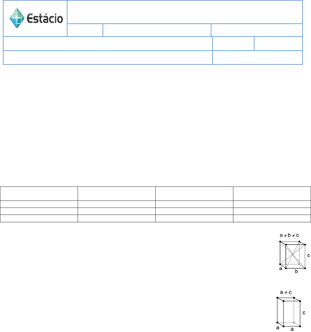 LISTA DE EXERCÍCIOS - 01 DISCIPLINA: Princ. Da Ciênc. E Tec. Dos Materiais. Turma: PROFESSOR (A): NÉLIA LIMA DATA: ALUNO: MATRÍCULA: 1. O ferro possui uma estrutura cristalina CCC, um raio atômico de 0,124nm, e um peso atômico de 55,85 g/mol. Calcular e comparar sua densidade teórica com o valor experimental (7,87g/cm3). 7,89g/cm3. 2. Calcular o raio de um átomo de Irídio, dado que o Ir possui uma estrutura cristalina CFC, uma densidade de 22,4 g/cm3 e um peso atômico de 192,2 g/mol. 0,136nm 3. Calcular o raio de um átomo de vanádio, dado que o V possui uma estrutura CCC, uma densidade de 5,96 g/cm3 e um peso atômico de 50,9 g/mol. 0,132nm 4. Algum metal hipotético possui a estrutura cristalina cúbica simples. Se o seu peso atômico é de 74,5g/mol. E o raio atômico é de 0,145nm, calcular sua densidade. 5,07g/cm3. 5. O titânio possui uma estrutura cristalina HC e uma densidade de 4,51 g/cm3. a. Qual é o volume de sua célula unitária em metros cúbicos? 1,06 x 10-23 cm3 b. Se a razão c/a é de 1,58, calcular os valores de c e de a. a = 0,296nm e c = 0,467nm 6. O nióbio possui um raio atômico de 0,1430nm e uma densidade de 8,57 g/cm3. Determinar se ele possui uma estrutura cristalina CCC ou CFC. Com n = 2 a estrutura é CCC. 7. A seguir estão listados os peso atômico, a densidade e o raio atômico para três ligas hipotéticas. Para cada uma delas determinar se a sua estrutura cristalina é CS, CFC, ou CCC. E então justificar sua determinação. LIGA PESO ATÔMICO (g/mol DENSIDADE (g/cm3) RAIO ATOMICO (nm) A 43,1 6,40 0,122 B 184,4 12,30 0,146 C 91,6 9,60 0,137 8. A célula unitária para o urânio possui uma simetria ortorrômbica, com os parâmetros de rede cristalina a, b e c de 0,286; 0,587 e 0,495nm respectivamente. Se sua densidade, seu peso atômico e seu raio atômico são de 19,05 g/cm3, 238,03 g/mol e 0,1385nm respectivamente, calcular o fator de empacotamento atômico. FEA = 0,13 9. O índio possui uma célula unitária tetragonal para os parâmetros de rede cristalina a e c são 0,459 e 0,495nm, respectivamente. a. Se o fator de empacotamento e o raio atômico são de 0,693 e 0,1625nm respectivamente, determinar o número de átomos em cada célula unitária. n = 4. b. O peso atômico do Índio é de 114,82g/mol; calcular sua densidade teórica. 7,33g/cm3 10. O berílio possui uma célula unitária HC para a qual a razão entre os parâmetros de rede cristalina c/a é de 1,568. Se o raio do átomo de Be é de 0,1143nm. a. Determinar o volume da célula unitária 5,07 x 10-23cm3 b. Calcular a densidade teórica do Be e comparar com o valor encontrado na literatura. 1,77g/cm3 11. O magnésio possui uma estrutura HC, uma razão c/a de 1,624 e uma densidade de 1,74 g/cm3. Calcular o raio atômico para o Mg. 0,160nm 12. O cobalto possui uma estrutura cristalina HC, um raio atômico de 0,153nm, e uma razão c/a de 1,623. Calcular o volume da célula unitária para o Co. 1,22 x 10-22cm3