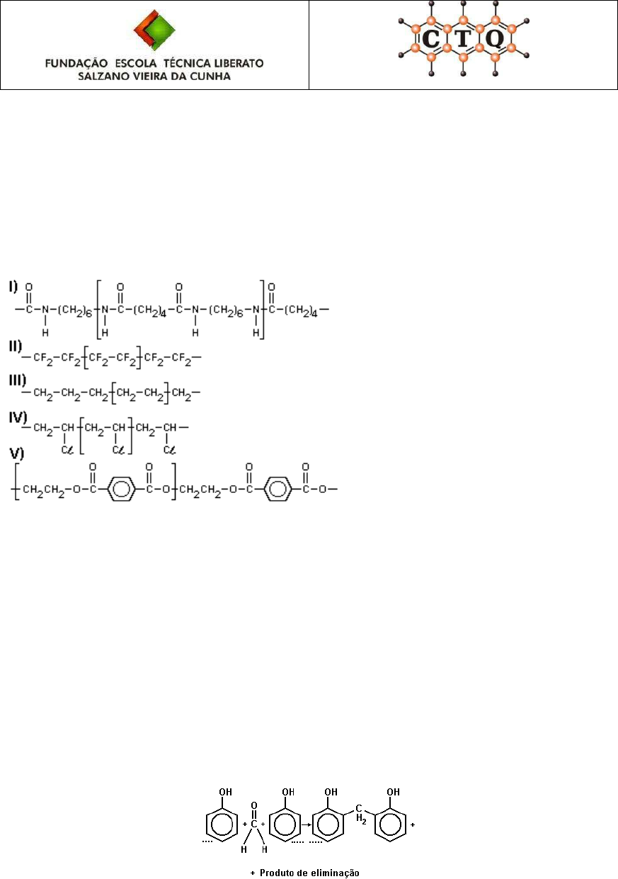 CURSO TÉCNICO DE QUÍMICA Processos Industriais - Polímeros Profª. Schana Andréia da Silva 1 Lista de Exercícios 3 – Obtenção de Polímeros 01) (PUC-SP) Polímeros são macromoléculas formadas por repetição de unidades iguais, os monômeros. A grande evolução da manufatura dos polímeros, bem como a diversificação das suas aplicações caracterizam o século XX como o século do plástico. A seguir estão representados alguns polímeros conhecidos: Assinale a alternativa que relaciona as estruturas e seus respectivos nomes. a) I-polietileno; II-poliéster; III-policloreto de vinila (PVC); IV-poliamida (nylon); V-politetra fluoretileno (Teflon); b) I-poliéster; II-polietileno; III-poliamida (nylon); IV-politetra fluoretileno (Teflon); V-policloreto de vinila (PVC); c) I-poliamida (nylon); II-politetra fluoretileno (Teflon); III-polietileno; IV- policloreto de vinila (PVC); V-poliéster; d) I-poliéster; II-politetra fluoretileno (Teflon); III-polietileno; IV-policloreto de vinila (PVC); V-poliamida (nylon); e) I-poliamida (nylon); II-policloreto de vinila (PVC); III-poliéster; IV-polietileno; V-politetra fluoretileno (Teflon). 02) (PUCCAMP-SP) A baquelite ainda é bastante utilizada em utensílios domésticos e materiais elétricos. É polímero de condensação, formado pela reação de fenol com formaldeído, ocorrendo "eliminação" de uma substância composta. O produto de eliminação, indicado na equação anterior, é: a) o etanol. b) o gás carbônico. c) a água. d) o próprio fenol. e) o próprio formaldeído. 03) (UFC-CE) Determinadas substâncias macromoleculares, usadas na fabricação de fibras têxteis, fios, membranas de dessalinizadores de águas etc. são obtidas através de reação de condensação (com eliminação de H2O sob aquecimento e pressão) de dois compostos (monômeros). Uma destas macromoléculas, identificada pelo nome de Nomex, tem a estrutura mostrada abaixo: Lista de exercícios 3 – Obtenção de Polímeros 2 Assinale a alternativa que indica corretamente os tipos de compostos necessários para a obtenção do Nomex. a) diácido e diálcool b) diéster e diálcool c) dihaleto e diéster d) diácido e diamina e) bisfenol e diamina 04) (FATEC-SP) Polimerização por condensação ocorre quando, no processo de formação das macromoléculas, há eliminação de moléculas pequenas. Um exemplo desse tipo de polimerização é a produção de poliéster mostrado na figura adiante. Também pode resultar em polimerização por condensação a interação, em condições adequadas, do seguinte par de substâncias: 05) (FUVEST-SP) Alguns polímeros biodegradáveis são utilizados em fios de sutura cirúrgica, para regiões internas do corpo, pois não são tóxicos e são reabsorvidos pelo organismo. Um desses materiais é um copolímero de condensação que pode ser representado pela figura 1. Dentre os seguintes compostos da figura 2 os que dão origem ao copolímero citado são a) I e III b) II e III c) III e IV d) I e II e) II e IV 06) (UFMG-MG) Diversos materiais poliméricos são utilizados na fabricação de fraldas descartáveis. Um deles, o poliacrilato de sódio, é responsável pela absorção da água presente na urina; um outro, o polipropileno, constitui a camada que fica em contato com a pele. Analise a estrutura de cada um desses dois materiais: Lista de exercícios 3 – Obtenção de Polímeros 3 Considerando-se esses dois materiais e suas respectivas estruturas, é CORRETO afirmar que a) o poliacrilato de sódio apresenta ligações covalentes e iônicas. b) o poliacrilato de sódio é um polímero apolar. c) o polipropileno apresenta grupos polares. d) o polipropileno tem como monômero o propano. 07) (UFRJ-RJ) Existem diversos tipos de náilon de acordo com a finalidade de uso. Comercialmente, estas poliamidas lineares são nomeadas em função do número de carbonos na cadeia do monômero. Assim, se dois monômeros são utilizados, o primeiro dígito no nome da poliamida indica o número de carbonos na diamina, e o segundo, o número de carbonos no ácido dicarboxílico. O Náilon 6,6 , por exemplo, é obtido a partir do 1,6 diaminohexano e do ácido hexanodióico: a) A partir destas considerações, dê as estruturas dos monômeros para a obtenção do Náilon 6,10. b) Na figura acima está representado, de forma incompleta, um segmento da proteína da fibroína da seda, uma poliamida de origem animal utilizada como modelo, pela equipe da Du Pont, para descobrir a síntese do náilon, entre 1929 e 1932. Sabendo-se que este segmento é formado a partir dos aminoácidos alanina (50 %), glicina (33,3%) e serina (16,7%), dê as estruturas de X1, X2 e X3 que permitam completar a fórmula estrutural desse segmento. 08) (FUVEST-SP) Kevlar é um polímero de alta resistência mecânica e térmica, sendo por isso usado em coletes à prova de balas e em vestimentas de bombeiros. a) Quais as fórmulas estruturais dos dois monômeros que dão origem ao Kevlar por reação de condensação? Escreva-as. b) Qual o monômero que, contendo dois grupos funcionais diferentes, origina o polímero Kevlar com uma estrutura ligeiramente modificada? Escreva as fórmulas estruturais desse monômero e do polímero por ele formado. c) Como é conhecido o polímero sintético, não aromático, correspondente ao Kevlar? d) nomeie este polímero com base na estrutura do mero. 09) (UFES-ES) Polietilenotereftalato, o material das chamadas garrafas "PET" de refrigerantes, é sintetizado a partir de ácido tereftálico e etilenoglicol, como mostrado abaixo: Lista de exercícios 3 – Obtenção de Polímeros 4 a) Que grupos funcionais estão presentes no composto A? b) Como você classificaria as reações I e II? c) Industrialmente, a síntese de A é feita utilizando-se um grande excesso de etilenoglicol. Explique por que isso é necessário. 10) (FUVEST-SP) Para aumentar a vida útil de alimentos que se deterioram em contacto com o oxigênio do ar, f