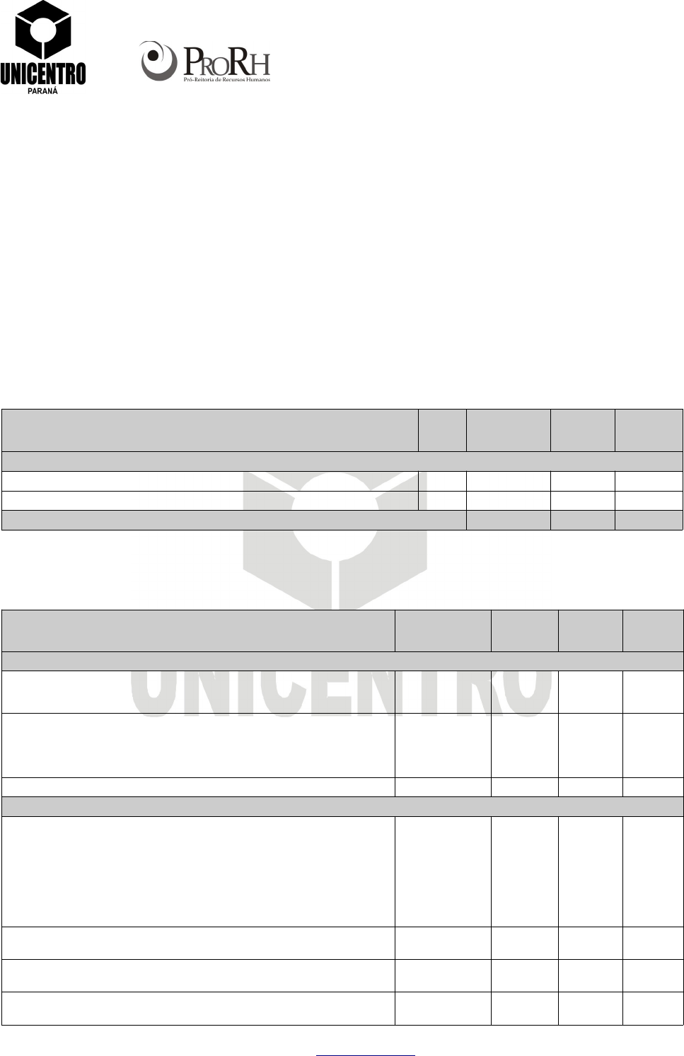 ANEXO VI DO REGULAMENTO DO REGULAMENTO DE CONCURSO PÚBLICO DE PROVAS E TÍTULOS PARA PROVIMENTO DO CARGO DE PROFESSOR DE ENSINO SUPERIOR NÃO TITULAR DA CARREIRA DO MAGISTÉRIO PÚBLICO DO ENSINO SUPERIOR DO PARANÁ, NA UNICENTRO. GABARITO PARA AVALIAÇÃO DE PROVA DE TÍTULOS (Conforme Resolução nº 019/2023-COU/UNICENTRO) NOME DO(A) CANDIDATO(A): ___________________________________________________________________ DEPARTAMENTO: ______________________________________________________________________________ SETOR: _____________________________________ Unidade Universitária: ______________________________ ÁREA OU MATÉRIA: ____________________________________________________________________________ GRUPO I – Títulos universitários (pontuação não cumulativa) [LIMITE DO GRUPO: 500 PONTOS] Atividade a ser pontuada Pontos Pontuação sugerida pelo candidato Número da página do currículo Pontuação Obtida * 1. Títulos 1.1. Doutor ou Livre Docente 500 1.2. Mestre 250 SUB-TOTAL * CAMPO EXCLUSIVO DA BANCA EXAMINADORA. OBSERVAÇÃO: Para a pontuação dos itens componentes dos Grupos II, III, IV e V, considerar apenas os resultados dos últimos cinco anos. GRUPO II – Atividades em ensino, pesquisa e extensão [LIMITE DO GRUPO: 550 PONTOS] Atividade a ser pontuada Pontos Pontuação sugerida pelo candidato Número da página do currículo Pontuação Obtida * 2.1. Docência 2.1.1. Docência no Ensino Superior, na graduação e no Lato Sensu (especialização, residência e aprimoramento) (por disciplina/semestre, comprovada por declaração oficial da Instituição empregadora e a pontuação máxima da soma do item 2.1.1 e 2.1.2 é de 250 pontos) 5 2.1.2. Docência na Educação Básica (por ano, sendo que a cada 12 meses é computado 1 ano e o saldo remanescente , quando superior a 6 meses, equivale a 1 ano, desde que não seja pré- requisito para o Concurso. Deve ser comprovado por meio da CTPS ou Contrato emitido pela Instituição, de experiência profissional de docência na educação básica, e a pontuação máxima da soma do item 2.1.1 e 2.1.2 é de 240 pontos) 20 2.1.3. Docência na Pós-Graduação Stricto Sensu (por disciplina) 10 2.2. Orientação Concluída 2.2.1. a) Orientação de trabalho de conclusão de curso de graduação, por trabalho; b) Orientação em projetos de iniciação a extensão, em iniciação científica ou tecnológica, por projeto; c) Orientação acadêmica de graduação em grupo, (em programas de treinamento – PET, PIBID e equivalentes) – pontuar por grupo/ano. d) Orientação acadêmica de tutoria, monitoria, estágio de docência no Ensino Superior, por orientação. (A pontuação máxima desse item é de 60 pontos) 5 2.2.2. Orientação de Residência e/ou de Especialização e/ou PDE e/ou aprimoramento concluída (por aluno, até o máximo de 60 pontos) 5 2.2.3. Orientação de Dissertação de Mestrado concluída (até o máximo de 200 pontos) 40 2.2.4. Coorientação de Dissertação de Mestrado concluída (até o máximo de 100 pontos) 20 Universidade Estadual do Centro-Oeste Reconhecida pelo Decreto Estadual nº 3.444, de 8 de agosto de 1997 Pró-Reitoria de Recursos Humanos – PRORH Diretoria de Concursos e Avaliação – DIRCOAV Home Page: http://www3.unicentro.br 1 Câmpus Santa Cruz: Rua Salvatore Renna – Padre Salvador, 875, Bairro Santa Cruz – Fone: (42) 3621-1000 – CEP 85.015-430 – GUARAPUAVA – PR Câmpus Cedeteg: Alameda Élio Antonio Dalla Vecchia, 838, Bairro Vila Carli – Fone: (42) 3629-8100 – CEP 85.040-167 – GUARAPUAVA – PR Câmpus de Irati: Rua Professora Maria Roza Zanon de Almeida, Bairro Engenheiro Gutierrez – Cx. Postal, 21 – Fone: (42) 3421-3000 CEP 84.505-677 – IRATI – PR http://www.unicentro.br/ 2.2.5. Orientação de Tese de Doutorado concluída (até o máximo de 400 pontos) 80 2.2.6. Coorientação de Tese de Doutorado concluída (até o máximo de 200 pontos) 40 2.2.7. Supervisão de estágio de pós-doutorado concluída 20 2.3. Participação em bancas ou Comissões Avaliadoras ou Prestação de Serviço de Consultoria e Assessoria(por unidade) 2.3.1. Membro titular de banca examinadora de especialização e graduação (até o máximo de 5 pontos, não pontuar quando for orientador) 0,5 2.3.2. Membro titular de banca examinadora de defesa de dissertação de mestrado (até o máximo de 80 pontos, não pontuar quando for orientador) 20 2.3.3. Membro titular de banca examinadora de defesa de tese de doutorado ou equivalente (até o máximo de 120 pontos, não pontuar quando for orientador) 30 2.3.4. Membro titular de banca examinadora de concurso público ou seleção de docente para o Ensino Superior ou equivalente (máximo de 15 pontos) 5 2.3.5. Membro titular de Comissão Avaliadora (pontuar por Comissão, até o máximo de 20 pontos) 2 2.3.6. Atuação como Avaliador Ad hoc (exceto revistas científicas) (pontuar por Avaliação, até o máximo de 10 pontos) 1 2.3.7. Atuação como Avaliador Ad hoc de revistas científicas (pontuar por Avaliação, até o máximo de 50 pontos) 2 2.3.8. Membro titular de corpo editorial de revistas científicas (por revista) (até máximo de 50 pontos) 10 2.3.9. Assessorias técnicas e consultorias (até o máximo 5 pontos) 1 2.3.10. Organização de eventos científicos (por evento) (até o máximo 60 pontos) 30 2.3.11. Participação em eventos científicos (por evento) (até o máximo de 20 pontos) 5 2.4. Atividades de Capacitação Docente 2.4.1. Estágio de Pós-Doutorado concluído (máximo de 1 estágio) No Brasil 80 No exterior 100 2.4.2. Curso de extensão concluído na área ou matéria do Concurso (até o máximo de 10 pontos) 1 2.4.3. Curso de Especialização (mínimo de 360 horas) ou Residência concluída na área ou matéria do Concurso (até o máximo de 50 pontos) 25 2.4.4. Residência ou Aprimoramento concluída na área ou matéria do Concurso (até o máximo de 30 pontos) 15 2.4.5. Curso de Aperfeiçoamento concluído