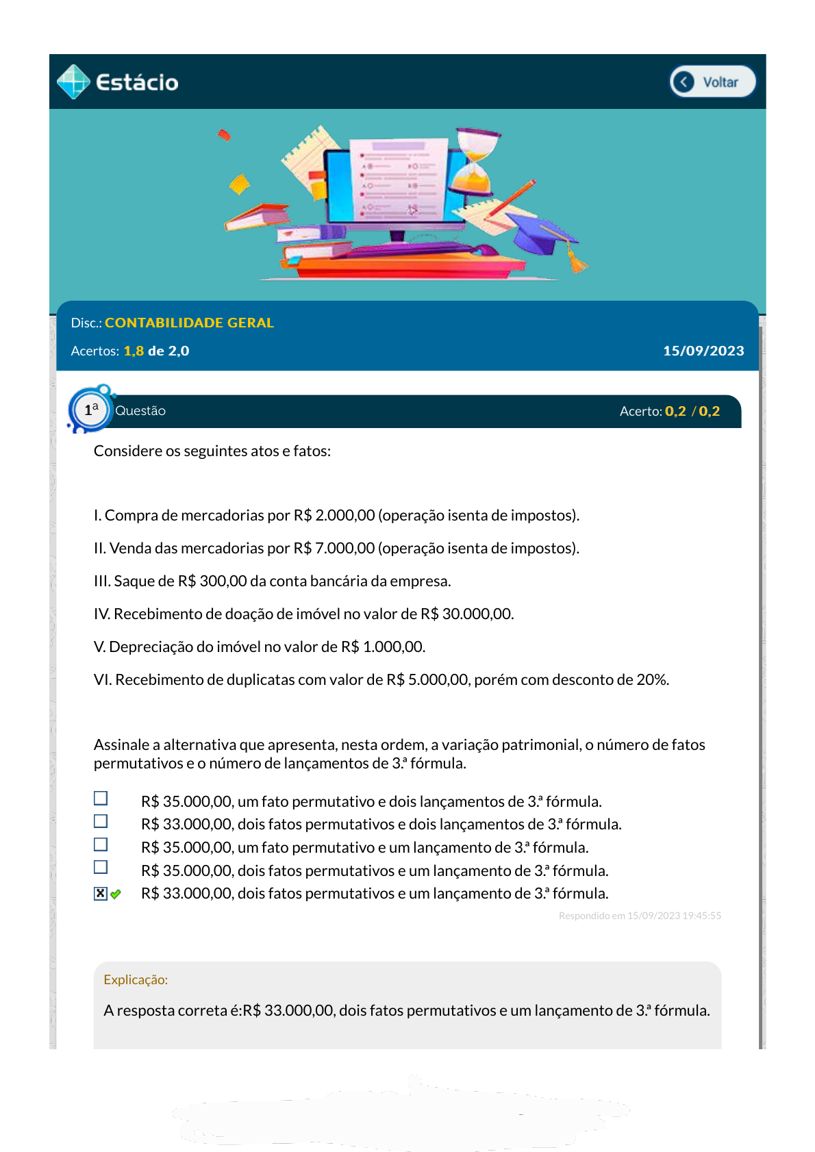 Disc.: CONTABILIDADE GERALCONTABILIDADE GERAL Acertos: 1,81,8 de 2,0 de 2,0 15/09/202315/09/2023 Acerto: 0,20,2 / 0,20,2 Considere os seguintes atos e fatos: I. Compra de mercadorias por R$ 2.000,00 (operação isenta de impostos). II. Venda das mercadorias por R$ 7.000,00 (operação isenta de impostos). III. Saque de R$ 300,00 da conta bancária da empresa. IV. Recebimento de doação de imóvel no valor de R$ 30.000,00. V. Depreciação do imóvel no valor de R$ 1.000,00. VI. Recebimento de duplicatas com valor de R$ 5.000,00, porém com desconto de 20%. Assinale a alternativa que apresenta, nesta ordem, a variação patrimonial, o número de fatos permutativos e o número de lançamentos de 3.ª fórmula. R$ 35.000,00, um fato permutativo e dois lançamentos de 3.ª fórmula. R$ 33.000,00, dois fatos permutativos e dois lançamentos de 3.ª fórmula. R$ 35.000,00, um fato permutativo e um lançamento de 3.ª fórmula. R$ 35.000,00, dois fatos permutativos e um lançamento de 3.ª fórmula. R$ 33.000,00, dois fatos permutativos e um lançamento de 3.ª fórmula. Respondido em 15/09/2023 19:45:55 Explicação: A resposta correta é:R$ 33.000,00, dois fatos permutativos e um lançamento de 3.ª fórmula. Questão11 a Baixado por Dayene Aguiar (dayenne.aguiar.cristina@gmail.com) lOMoARcPSD|30707823 https://www.studocu.com/pt-br?utm_campaign=shared-document&utm_source=studocu-document&utm_medium=social_sharing&utm_content=ava-contabilidade-avaliando-aprendizado-o-antigo-simulado Acerto: 0,20,2 / 0,20,2 O balanço patrimonial e a demonstração de resultados (DR) são importantes demonstrações contábeis. Qual é a principal diferença entre o balanço patrimonial e a DR? O balanço patrimonial demonstra a situação financeira da empresa em um determinado período, enquanto a DR demonstra o resultado das operações da empresa. O balanço patrimonial é uma demonstração de estoque, enquanto a DR é uma demonstração de fluxo. O balanço patrimonial é utilizado para fins internos, enquanto a DR é utilizada para fins externos. O balanço patrimonial registra as transações financeiras da empresa, enquanto a DR registra as transações patrimoniais. O balanço patrimonial apresenta as receitas e despesas da empresa, enquanto a DR apresenta o patrimônio líquido. Respondido em 15/09/2023 19:49:16 Explicação: O balanço patrimonial é uma demonstração contábil que apresenta a situação financeira da empresa em um determinado momento, mostrando seus ativos, passivos e patrimônio líquido. Ele fornece uma visão estática do patrimônio da empresa. Por outro lado, a demonstração do resultado (DR) é uma demonstração contábil que apresenta o resultado das operações da empresa em um determinado período, mostrando as receitas, despesas e o lucro líquido. Ela fornece uma visão dinâmica das operações da empresa ao longo do tempo. Acerto: 0,20,2 / 0,20,2 A contabilidade é um sistema fechado. Sobre isso, como é feita a verificação periódica da igualdade entre débitos e créditos no sistema contábil? Por meio do balanço patrimonial. Por meio do livro caixa. Por meio do livro razão. Por meio do livro diário. Por meio do balancete de verificação. Respondido em 15/09/2023 19:48:47 Explicação: O balancete de verificação é uma demonstração contábil que tem como objetivo verificar se os débitos e créditos estão devidamente registrados e se há igualdade entre eles. Ele lista todas as contas do livro razão, Questão22 a Questão33 a Baixado por Dayene Aguiar (dayenne.aguiar.cristina@gmail.com) lOMoARcPSD|30707823 apresentando o saldo devedor e o saldo credor de cada uma. Ao somar os valores de débitos e créditos no balancete de verificação, é possível verificar se há igualdade entre eles. Essa verificação periódica é fundamental para garantir a consistência e a precisão dos registros contábeis. Acerto: 0,20,2 / 0,20,2 Uma companhia contraiu um empréstimo para pagar de uma só vez, ao fim de 12 meses, no último dia do mês do vencimento, no valor de R$ 2.240.000,00, incluindo os juros prefixados de R$ 240.000,00. No último dia do mês de vencimento, quando o empréstimo completou o 5o mês, a companhia procurou a financeira propondo a quitação antecipada deste no dia seguinte. A financeira quitou o empréstimo no dia proposto, após a confirmação da transferência bancária de R$ 2.080.000,00, realizada pela companhia. Sabe-se que a companhia adota o princípio da competência de forma rigorosa, realizando todos os ajustes, impreterivelmente, no último dia de cada mês. Considerando exclusivamente as informações recebidas e a boa técnica contábil, o registro contábil dessa quitação num só lançamento, no dia aprazado, é: Débito: Banco conta Empréstimos 2.080.000,00 Crédito: Banco conta Movimento 2.080.000,00 Débito: Banco conta Empréstimos 2.240.000,00 Crédito: Banco conta Movimento 2.080.000,00 Crédito: Juros Passivos a Vencer 160.000,00 Débito: Banco conta Empréstimos 2.000.000,00 Débito: Juros Passivos 80.000,00 Crédito: Banco conta Movimento 2.080.000,00 Débito: Banco conta Empréstimos 2.240.000,00 Débito: Juros Passivos 80.000,00 Crédito: Juros Passivos a Vencer 240.000,00 Crédito: Banco conta Movimento 2.080.000,00 Débito: Banco conta Empréstimos 2.240.000,00 Crédito: Desconto Financeiro Auferido 20.000,00 Crédito: Juros Passivos a Vencer 140.000,00 Crédito: Banco conta Movimento 2.080.000,00 Respondido em 15/09/2023 19:51:45 Explicação: A resposta correta é: Débito: Banco conta Empréstimos 2.240.000,00 Crédito: Desconto Financeiro Auferido 20.000,00 Crédito: Juros Passivos a Vencer 140.000,00 Crédito: Banco conta Movimento 2.080.000,00 Acerto: 0,20,2 / 0,20,2 (ESAF/2004) O nosso Ativo Imobilizado consta apenas de Equipamento adquirido por R$ 60.000,00, em abril de 2002, e Veículo comprado em julho do mesmo ano, por R$ 45.000,00, com utilização imediata. Para fins de apropriar o desgaste fí