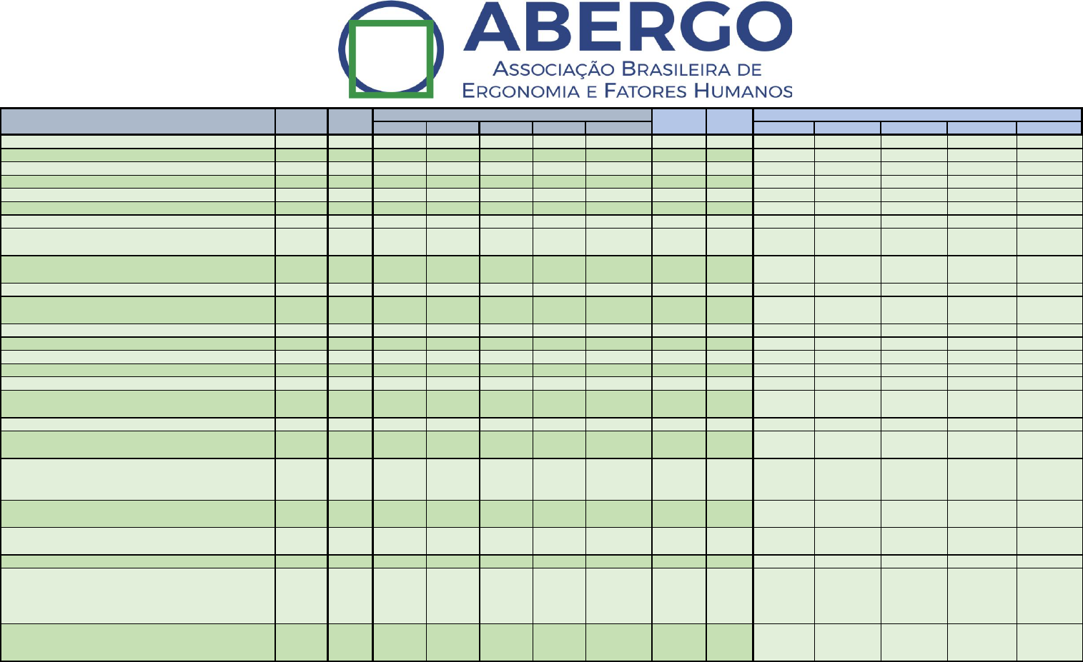 Sul Sudeste Norte Nordeste Centro-Oeste Sul Sudeste Norte Nordeste Centro-Oeste Elaboração/Participação de Concepção de Produto hora 525 R$ 0,4703 R$ 0,5699 R$ 0,5018 R$ 0,5198 R$ 0,4508 35 525 R$ 8.641,76 R$ 10.471,91 R$ 9.220,58 R$ 9.551,33 R$ 8.283,45 Elaboração/Participação de Concepção de Projeto hora 525 R$ 0,4703 R$ 0,5699 R$ 0,5018 R$ 0,5198 R$ 0,4508 40 525 R$ 9.876,30 R$ 11.967,90 R$ 10.537,80 R$ 10.915,80 R$ 9.466,80 Elaboração de Parecer de Produto hora 600 R$ 0,4703 R$ 0,5699 R$ 0,5018 R$ 0,5198 R$ 0,4508 16 600 R$ 4.514,88 R$ 5.471,04 R$ 4.817,28 R$ 4.990,08 R$ 4.327,68 Elaboração de Laudo Técnico de Produto hora 600 R$ 0,4703 R$ 0,5699 R$ 0,5018 R$ 0,5198 R$ 0,4508 16 600 R$ 4.514,88 R$ 5.471,04 R$ 4.817,28 R$ 4.990,08 R$ 4.327,68 Realização de Treinamento hora 650 R$ 0,4703 R$ 0,5699 R$ 0,5018 R$ 0,5198 R$ 0,4508 1 650 R$ 305,70 R$ 370,44 R$ 326,17 R$ 337,87 R$ 293,02 Formação de Comitê de Ergonomia hora 400 R$ 0,4703 R$ 0,5699 R$ 0,5018 R$ 0,5198 R$ 0,4508 32 400 R$ 6.019,84 R$ 7.294,72 R$ 6.423,04 R$ 6.653,44 R$ 5.770,24 Consultoria e Assessoria geral hora 725 R$ 0,4703 R$ 0,5699 R$ 0,5018 R$ 0,5198 R$ 0,4508 1 725 R$ 340,97 R$ 413,18 R$ 363,81 R$ 376,86 R$ 326,83 Elaborar e acompanhar programas de prevenção de risco ergonômicos e demais programas de prevenção; hora 400 R$ 0,4703 R$ 0,5699 R$ 0,5018 R$ 0,5198 R$ 0,4508 1 400 R$ 188,12 R$ 227,96 R$ 200,72 R$ 207,92 R$ 180,32 Realizar descrições de funções, tarefas e atividades de trabalho; hora 400 R$ 0,4703 R$ 0,5699 R$ 0,5018 R$ 0,5198 R$ 0,4508 1 400 R$ 188,12 R$ 227,96 R$ 200,72 R$ 207,92 R$ 180,32 Inventariar riscos ergonômicos; hora 400 R$ 0,4703 R$ 0,5699 R$ 0,5018 R$ 0,5198 R$ 0,4508 1 400 R$ 188,12 R$ 227,96 R$ 200,72 R$ 207,92 R$ 180,32 Inspecionar instalações, mobiliário, máquinas e equipamentos; hora 325 R$ 0,4703 R$ 0,5699 R$ 0,5018 R$ 0,5198 R$ 0,4508 1 325 R$ 152,85 R$ 185,22 R$ 163,09 R$ 168,94 R$ 146,51 Desenvolver parecer técnico; hora 525 R$ 0,4703 R$ 0,5699 R$ 0,5018 R$ 0,5198 R$ 0,4508 12 525 R$ 2.962,89 R$ 3.590,37 R$ 3.161,34 R$ 3.274,74 R$ 2.840,04 Gerar especificações técnicas de ergonomia; hora 275 R$ 0,4703 R$ 0,5699 R$ 0,5018 R$ 0,5198 R$ 0,4508 8 275 R$ 1.034,66 R$ 1.253,78 R$ 1.103,96 R$ 1.143,56 R$ 991,76 Avaliar/Validar implementação de projetos ergonômicos; hora 225 R$ 0,4703 R$ 0,5699 R$ 0,5018 R$ 0,5198 R$ 0,4508 12 225 R$ 1.269,81 R$ 1.538,73 R$ 1.354,86 R$ 1.403,46 R$ 1.217,16 Desenvolver indicadores; hora 225 R$ 0,4703 R$ 0,5699 R$ 0,5018 R$ 0,5198 R$ 0,4508 12 225 R$ 1.269,81 R$ 1.538,73 R$ 1.354,86 R$ 1.403,46 R$ 1.217,16 Analisar dados e achados das investigações ergonômicas; hora 275 R$ 0,4703 R$ 0,5699 R$ 0,5018 R$ 0,5198 R$ 0,4508 10 275 R$ 1.293,33 R$ 1.567,23 R$ 1.379,95 R$ 1.429,45 R$ 1.239,70 Implementar auditorias ergonômicas (internas e/ou externas); hora 250 R$ 0,4703 R$ 0,5699 R$ 0,5018 R$ 0,5198 R$ 0,4508 8 250 R$ 940,60 R$ 1.139,80 R$ 1.003,60 R$ 1.039,60 R$ 901,60 Gerir programas de qualidade de vida no trabalho; hora 250 R$ 0,4703 R$ 0,5699 R$ 0,5018 R$ 0,5198 R$ 0,4508 8 250 R$ 940,60 R$ 1.139,80 R$ 1.003,60 R$ 1.039,60 R$ 901,60 Analisar queixas ocupacionais e acidentes do trabalho para questões ergonômicas; hora 250 R$ 0,4703 R$ 0,5699 R$ 0,5018 R$ 0,5198 R$ 0,4508 8 250 R$ 940,60 R$ 1.139,80 R$ 1.003,60 R$ 1.039,60 R$ 901,60 Identificar a exposição potencial do trabalhador aos fatores de riscos físicos, organizacionais, cognitivos e psicossociais do trabalho; hora 250 R$ 0,4703 R$ 0,5699 R$ 0,5018 R$ 0,5198 R$ 0,4508 12 250 R$ 1.410,90 R$ 1.709,70 R$ 1.505,40 R$ 1.559,40 R$ 1.352,40 Coordenar e participar de projetos de concepção de novos ambientes, produtos ou serviços; hora 325 R$ 0,4703 R$ 0,5699 R$ 0,5018 R$ 0,5198 R$ 0,4508 18 325 R$ 2.751,26 R$ 3.333,92 R$ 2.935,53 R$ 3.040,83 R$ 2.637,18 Implementar e coordenar a Certificação em Sistema de Gestão em Ergonomia (Selo Abergo/Abnt) hora 350 R$ 0,4703 R$ 0,5699 R$ 0,5018 R$ 0,5198 R$ 0,4508 45 350 R$ 7.407,23 R$ 8.975,93 R$ 7.903,35 R$ 8.186,85 R$ 7.100,10 Ministrar palestras em temas relacionados à ergonomia hora 1625 R$ 0,4703 R$ 0,5699 R$ 0,5018 R$ 0,5198 R$ 0,4508 2 1625 R$ 1.528,48 R$ 1.852,18 R$ 1.630,85 R$ 1.689,35 R$ 1.465,10 Participar do processo de inclusão de pessoas com Deficiência (PcD) para atender à legislação, à ciência e às adequações do processo produtivo relacionadas à ergonomia. hora 250 R$ 0,4703 R$ 0,5699 R$ 0,5018 R$ 0,5198 R$ 0,4508 12 250 R$ 1.410,90 R$ 1.709,70 R$ 1.505,40 R$ 1.559,40 R$ 1.352,40 Elaboração de Avaliação Ergonômica Preliminar Posto de Trabalho (1 a 5) 2100 R$ 0,4703 R$ 0,5699 R$ 0,5018 R$ 0,5198 R$ 0,4508 1 2100 R$ 987,63 R$ 1.196,79 R$ 1.053,78 R$ 1.091,58 R$ 946,68 Qtde horas (sugeridas) * Qtde CVE REGIÕES ATIVIDADE - SERVIÇO - EVENTO Referência Qtde de CVE * Regiões (Valores do Coeficiente de Valoração para Ergonomistas) Elaboração de Avaliação Ergonômica Preliminar Posto de Trabalho (6 a 10) 1510 R$ 0,4703 R$ 0,5699 R$ 0,5018 R$ 0,5198 R$ 0,4508 1 1510 R$ 710,15 R$ 860,55 R$ 757,72 R$ 784,90 R$ 680,71 Elaboração de Avaliação Ergonômica Preliminar Posto de Trabalho (11 a 30) 1218 R$ 0,4703 R$ 0,5699 R$ 0,5018 R$ 0,5198 R$ 0,4508 1 1218 R$ 572,83 R$ 694,14 R$ 611,19 R$ 633,12 R$ 549,07 Elaboração de Avaliação Ergonômica Preliminar Posto de Trabalho (31 a 50) 1045 R$ 0,4703 R$ 0,5699 R$ 0,5018 R$ 0,5198 R$ 0,4508 1 1045 R$ 491,46 R$ 595,55 R$ 524,38 R$ 543,19 R$ 471,09 Elaboração de Avaliação Ergonômica Preliminar Posto de Trabalho (51 a 100) 785 R$ 0,4703 R$ 0,5699 R$ 0,5018 R$ 0,5198 R$ 0,4508 1 785 R$ 369,19 R$ 447,37 R$ 393,91 R$ 408,04 R$ 353,88 Elaboração de Avaliação Ergonômica Preliminar Posto de Trabalho (101 a 200) 589 R$ 0,4703 R$ 0,5699 R$ 0,5018 R$ 0,5198 R$ 0,4508 1 589 R$ 277,01 R$ 335,67 R$ 295,56 R$ 306,16 R$ 265,52 Elaboração de Avaliação Ergonômica Preliminar Posto de Trabalho (201 a 500) 425 R$ 0,4703 R$ 0,5699 R$ 0,5018 R$ 0,5198 R$ 0,45