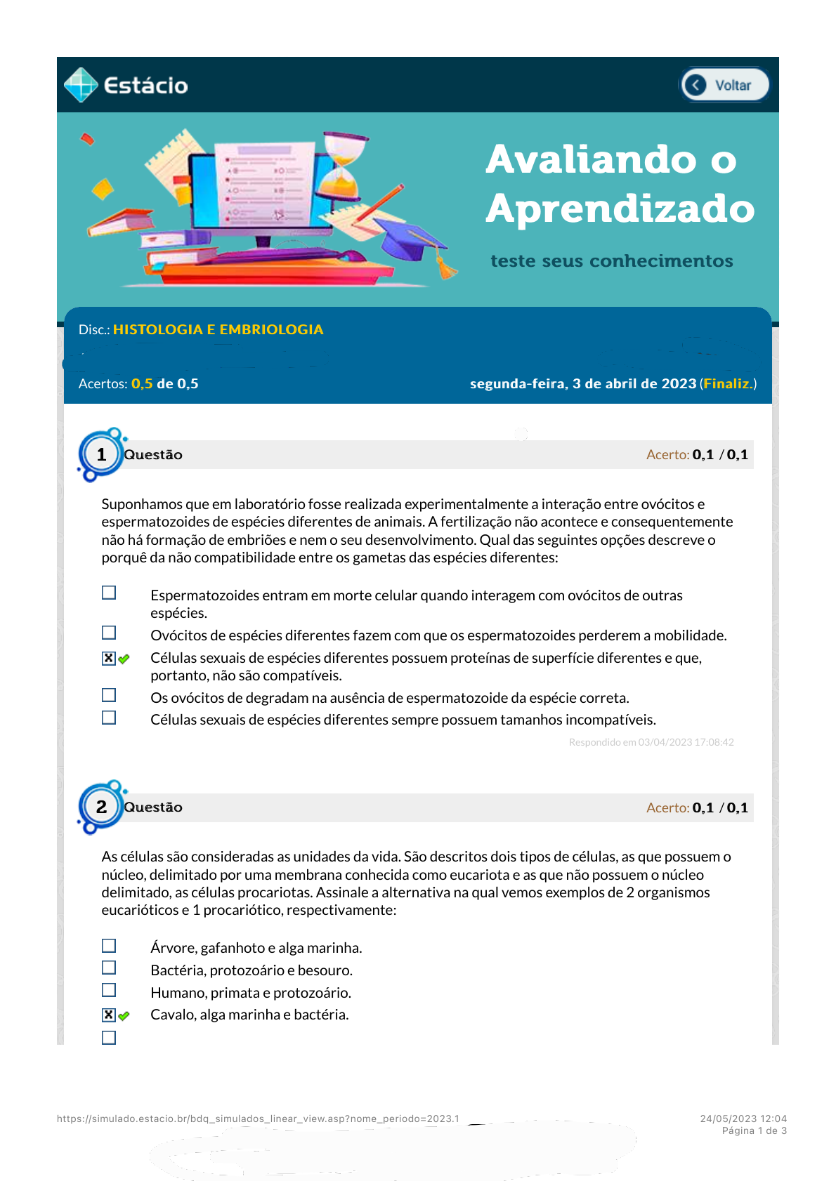 Avaliando oAvaliando o AprendizadoAprendizado teste seus conhecimentosteste seus conhecimentos Disc.: HISTOLOGIA E EMBRIOLOGIAHISTOLOGIA E EMBRIOLOGIA Aluno(a): TAINARA LOPES DA SILVATAINARA LOPES DA SILVA Matríc.: 202212033858202212033858 Acertos: 0,50,5 de 0,5 de 0,5 segunda-feira, 3 de abril de 2023segunda-feira, 3 de abril de 2023 (Finaliz.Finaliz.) Acerto: 0,10,1 / 0,10,1 Suponhamos que em laboratório fosse realizada experimentalmente a interação entre ovócitos e espermatozoides de espécies diferentes de animais. A fertilização não acontece e consequentemente não há formação de embriões e nem o seu desenvolvimento. Qual das seguintes opções descreve o porquê da não compatibilidade entre os gametas das espécies diferentes: Espermatozoides entram em morte celular quando interagem com ovócitos de outras espécies. Ovócitos de espécies diferentes fazem com que os espermatozoides perderem a mobilidade. Células sexuais de espécies diferentes possuem proteínas de superfície diferentes e que, portanto, não são compatíveis. Os ovócitos de degradam na ausência de espermatozoide da espécie correta. Células sexuais de espécies diferentes sempre possuem tamanhos incompatíveis. Respondido em 03/04/2023 17:08:42 Acerto: 0,10,1 / 0,10,1 As células são consideradas as unidades da vida. São descritos dois tipos de células, as que possuem o núcleo, delimitado por uma membrana conhecida como eucariota e as que não possuem o núcleo delimitado, as células procariotas. Assinale a alternativa na qual vemos exemplos de 2 organismos eucarióticos e 1 procariótico, respectivamente: Árvore, gafanhoto e alga marinha. Bactéria, protozoário e besouro. Humano, primata e protozoário. Cavalo, alga marinha e bactéria. QuestãoQuestão11 QuestãoQuestão22 https://simulado.estacio.br/bdq_simulados_linear_view.asp?nome_periodo=2023.1 24/05/2023 12:04 Página 1 de 3 Baixado por Dayene Aguiar (dayenne.aguiar.cristina@gmail.com) lOMoARcPSD|30707823 https://www.studocu.com/pt-br?utm_campaign=shared-document&utm_source=studocu-document&utm_medium=social_sharing&utm_content=estacio-alunos-avaliando-aprendizado Árvore, vírus e bactéria. Respondido em 03/04/2023 17:09:25 Acerto: 0,10,1 / 0,10,1 Os embriologistas dividem didaticamente o desenvolvimento embrionário humano em 3 etapas: período do zigoto, período embrionário e período fetal. O período do zigoto tem início com a fertilização, a união dos gametas. Qual destes eventos marca o fim do período? Desenvolvimento de órgãos rudimentares. Ruptura da zona pelúcida. Dobramento da placa neural A formação da placenta. A implantação do concepto no útero. Respondido em 03/04/2023 17:10:06 Acerto: 0,10,1 / 0,10,1 O tecido conjuntivo atua na sustentação, nutrição e adesão das células epiteliais. O contato do epitélio com sua lâmina própria pode ser aumentado por invaginações irregulares entre os dois tecidos denominadas: Pseudópodes Interdigitações Pólipos Zônulas de adesão Papilas Respondido em 03/04/2023 17:08:01 Acerto: 0,10,1 / 0,10,1 O tecido conjuntivo embrionário é dividido em tecido mucoide, presente no cordão umbilical, e mesênquima, no embrião. O mesênquima é a origem dos tecidos conjuntivos e é formado pelas células mesenquimais. São características dessas células: São células que apresentam muita coesão entre si. Originam-se no endoderma, folheto mais interno, de onde partem e penetram nos órgãos. São células que apresentam poucos prolongamentos citoplasmáticos. São células fusiformes com núcleo reduzido. Encontram-se imersas em uma matriz viscosa com poucas fibras. Respondido em 03/04/2023 17:10:42 QuestãoQuestão33 QuestãoQuestão44 QuestãoQuestão55 https://simulado.estacio.br/bdq_simulados_linear_view.asp?nome_periodo=2023.1 24/05/2023 12:04 Página 2 de 3 Baixado por Dayene Aguiar (dayenne.aguiar.cristina@gmail.com) lOMoARcPSD|30707823