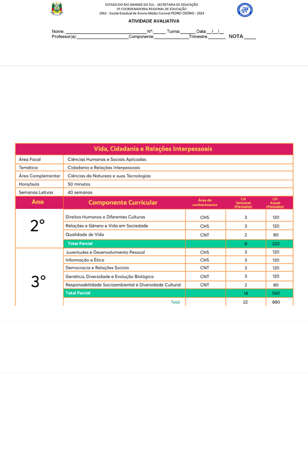 Estrutura da Eletiva de Ciências Humanas O desenvolvimento integral do ser humano ocorre através de práticas pedagógicas tanto no contexto escolar quanto na esfera social e política. Estas práticas visam promover reflexões e ações que reconheçam e promovam a cidadania, as relações interpessoais e interculturais, a justiça social, os direitos humanos e a dignidade humana. Essa formação integral requer a consideração de diversos aspectos, incluindo o econômico, social, espiritual, emocional e ambiental, além do estudo e prática dos princípios democráticos. Em diálogo com temas complementares, como qualidade de vida, diversidade cultural, responsabilidade socioambiental e genética, busca-se situar o indivíduo no mundo e despertar sua responsabilidade para com a natureza e a vida em suas diversas formas, promovendo uma abordagem ecobiocêntrica na ciência e no conhecimento. COMPONENTES CURRICULARES DO 2° ANO Direitos humanos e diferentes culturas Essa disciplina engloba a interseção entre os direitos humanos e o multiculturalismo, explorando suas relações conceituais e práticas na interação interpessoal e cidadania. Considerando os contextos históricos, geográficos, políticos, econômicos, sociais, ambientais e culturais, busca-se compreender as estruturas de poder e as diversas concepções sóciofilosóficas. Prioriza-se a formação integral das juventudes, capacitando-as para enfrentar desafios éticos e morais em sociedades complexas. A cultura de solidariedade, equidade e justiça social é promovida como meio de superar desigualdades e violências. A atenção ao campo democrático e ao Estado de Direito é central, fornecendo um horizonte político-pedagógico para a ação docente. Relações de gênero e vida em sociedade Essa disciplina se concentra em estudar e desenvolver argumentos que promovam a vida em comunidade, levando em conta a diversidade cultural, ética e de gênero, bem como as diferentes subjetividades, identidades e escolhas. No âmbito da ação pedagógica diária, é crucial manter um cuidado especial com a alteridade, a dignidade humana e a justiça social, incorporando diversas concepções teóricas e reconhecendo a condição humana como um foco da educação. Reconhecendo que a diversidade de agentes sociais molda os territórios através de mudanças tecnológicas, teorias e relações sociais, esta disciplina trabalha para construir uma sociedade próspera, justa e inclusiva, promovendo a participação ativa dos cidadãos e cidadãs e desenvolvendo habilidades de planejamento e gestão das ações. Qualidade de vida Serão tratados temas atuais de relevância científica e social para a área de ciências da natureza e sua transposição como componente curricular para o ensino básico e seu papel no desenvolvimento social e ambiental, e os avanços tecnológicos na preservação da qualidade de vida e manutenção da saúde com base ética. COMPONENTES CURRICULARES DO 3° ANO Juventudes e desenvolvimento pessoal Essa disciplina ressalta a importância de experiências e vivências relevantes na vida das pessoas para o desenvolvimento pessoal. As juventudes são incentivadas a refletir sobre condutas, comportamentos e atitudes, visando consolidar valores morais, éticos e estéticos que promovam um desenvolvimento integral. A liberdade, cooperação, autonomia e empreendedorismo são destacados como fundamentais para uma convivência democrática e solidária, capaz de enfrentar desafios e construir sociedades justas e inclusivas. O protagonismo, autoconhecimento, autoestima, autoconfiança e empatia são considerados elementos essenciais para o desenvolvimento pessoal, promovendo compromissos individuais e coletivos com o mundo e contribuindo para o crescimento integral dos indivíduos através de processos educativos e dialógicos. Informação e ética Esta disciplina destaca a importância da ética, das redes e da informação na efetividade educacional de uma sociedade cidadã na era digital. Refletir sobre questões éticas relacionadas à tecnologia é fundamental para orientar decisões e comunicações autênticas. A utilização crítica e reflexiva das diversas linguagens e tecnologias digitais contribui para a comunicação, acesso e produção de informações, capacitando jovens a resolver problemas e exercer liderança em suas vidas pessoais e coletivas. As transformações culturais, sociais e tecnológicas exigem uma abordagem ética e política das novas formas de trabalho. O texto também enfatiza a importância da educação para enfrentar desigualdades, preconceitos e intolerâncias, promovendo os direitos humanos, a solidariedade e o respeito à diversidade, inclusive nas interações virtuais. Democracia E Relações Sociais Essa disciplina ressalta a importância das diferentes correntes teórico-filosóficas e sócio-históricas na promoção de relações sociais e princípios democráticos através da educação. Ao estudar conceitos como democracia e república, os indivíduos são capacitados a elaborar argumentos que defendam a dignidade humana e a justiça social. A compreensão dos fundamentos éticos guia a vida cotidiana e promove valores como solidariedade, respeito às diferenças e liberdades individuais. Ações que buscam o bem comum, solidariedade e ética são consideradas essenciais para uma cultura de paz e justiça social, sendo promovidas por meio de diálogos sócio-filosóficos nas relações escolares e sociais