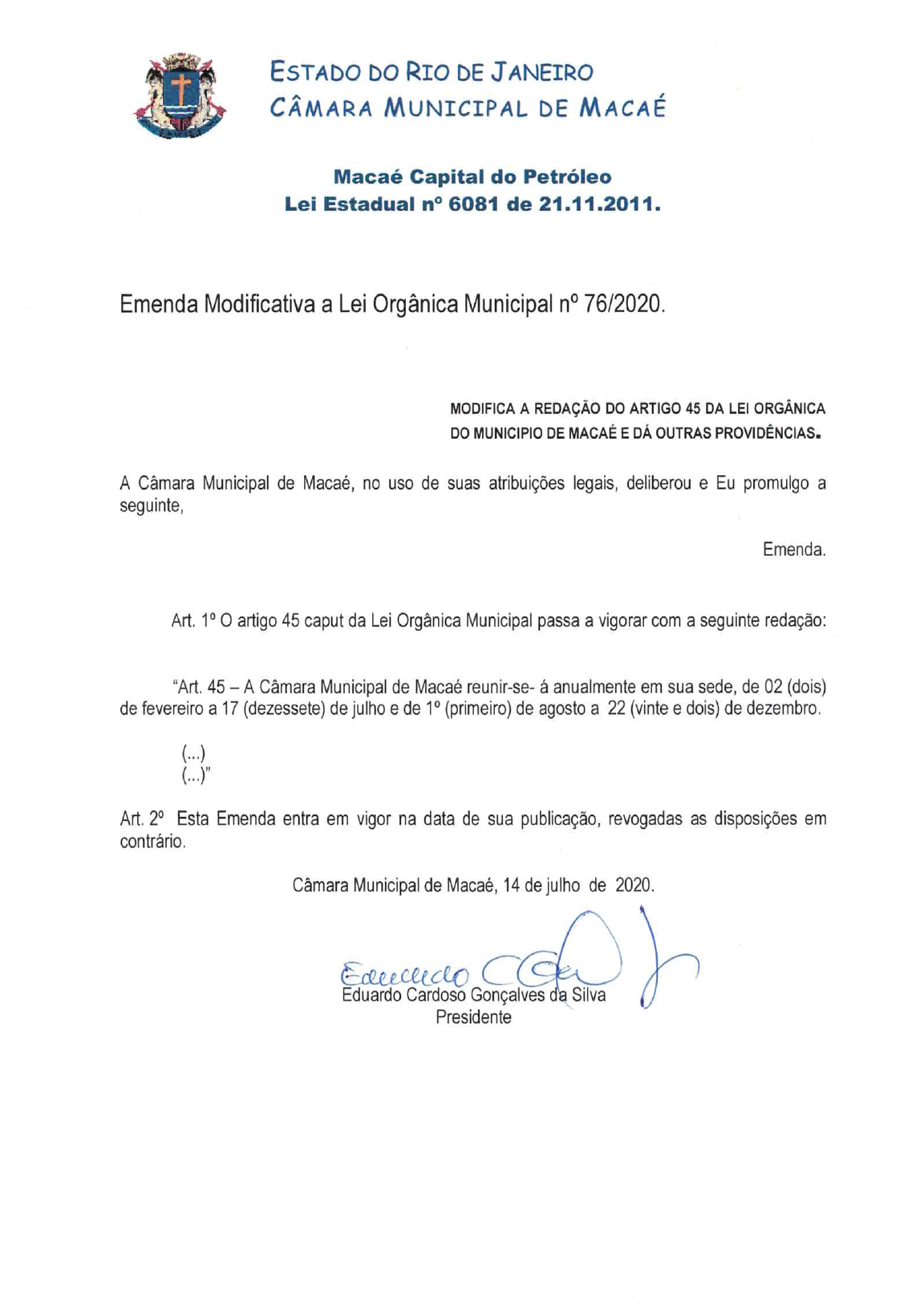 1 ESTADO DO RIO DE JANEIRO MUNICÍPIO DE MACAÉ LEI ORGÂNICA DO MUNICÍPIO DE MACAÉ (Consolidada até a Emenda 76/2020) TÍTULO I DA ORGANIZAÇÃO MUNICIPAL CAPÍTULO I DO MUNICÍPIO Seção I Das Disposições Gerais Art. 1º O Município de Macaé, pessoa jurídica de direito público interno, com sede no Paço Municipal, na Avenida Presidente Sodré nº 534, Centro, unidade central de sua estrutura administrativa, no pleno uso de sua autonomia política, administrativa e financeira, reger-se-á por esta Lei Orgânica, votada e aprovada pela Câmara Municipal.1 Parágrafo único.2 A organização administrativa do Município obedecerá aos seguintes princípios e diretrizes: I - o exercício pleno da autonomia municipal, no que é de sua exclusiva competência; II - a prática democrática e a participação popular; III - a programação, o planejamento, a transparência e o controle das ações governamentais; IV - o respeito à autonomia e à independência de atuação das associações legalmente constituídas e com funcionamento regular; V - a articulação e a cooperação com os demais entes federados, em especial os que integram a mesma região, com vistas ao desenvolvimento sustentável e harmonioso; VI - a garantia de acesso aos bens e serviços públicos a todos, de modo igualitário, sem distinção de origem, raça, sexo, orientação sexual, cor, idade, condição econômica, credo religioso, preferência político-partidária ou qualquer outra forma de discriminação; 1 Alterado pela Emenda Revisional n° 55/2008. 2 Inserido pela Emenda Revisional n° 55/2008. 2 VII - a acolhida e o tratamento igual a todos os que, de maneira legal, passem a viver em território municipal; VIII - a defesa e a preservação dos recursos naturais, do meio ambiente natural e construído, dos valores históricos e culturais e do território municipal; IX - a modernização da Administração Pública através do uso de novas tecnologias e da adequada capacitação de pessoal; X - a legalidade, a impessoalidade, a moralidade, a publicidade, a eficiência, a razoabilidade, a indisponibilidade do interesse público, a descentralização e a valorização dos servidores públicos. Art. 2º São Poderes do Município, independentes e harmoniosos entre si, o Legislativo e o Executivo. Art. 3º São símbolos do Município: a Bandeira, o Brasão e o Hino, representativos de sua cultura e história, em conformidade aos Anexos I, II e III. § 1º A Bandeira do Município, em azul, da mesma tonalidade do escudo do Brasão de Macaé, significando formosura e majestade, com duas listras brancas representando o Rio e o Mar, e uma palmeira macaíba, estilizada, com seus frutos, a doce macaba, origem do nome da Cidade. § 2º O Brasão de Macaé, de autoria do Dr. Moacyr Santos, é um escudo redondo português, encimado com coroa mural de prata, com cinco torres ameiadas, características das cidades, em campo blau (azul), que em heráldica significa formosura e majestade; rio e mar de prata, indicando que possui rio e mar, sobre a qual se levanta a Cruz de Cristo, de ouro, símbolo da fé, gravado nas velas dos primitivos colonizadores, a mostrar que, em suas origens, esta cidade, foi uma fazenda de jesuítas; como suporte, tudo ao natural, com as cores próprias, uma quilha de arco, emblema próprio das cidades marítimas; duas flechas cruzadas detrás do escudo, lembrando o primitivo aldeamento dos índios; dois bagres, o peixe mais abundante do rio que banha a cidade, e duas palmeiras macaíbas, com seus cachos de frutos, a macaíba, coco carnudo e doce, tão apreciado pelos indígenas e que viria a dar o nome à região e à cidade: Macaé – a macaíba doce; como divisa, uma faixa blau tendo em letras de prata o nome da Cidade e a data de criação da vila: 29 de julho de 1813. § 3º O Hino de Macaé, com música do artista Lucas Vieira e letra do Professor Antonio Álvares Parada, conforme Deliberação 221/65, de 17 de setembro de 1965, sendo que, nos atos oficiais em que for executado, é obrigatória sua execução integral; e liberada sua versão não oficial em quaisquer outros eventos festivos. § 4º Será admitido o uso de logomarca ou forma de identificação de um perfil de governo, inclusive em impressos oficiais, desde que tenha conteúdo educativo, informativo ou de orientação social, não caracterize promoção pessoal de políticos ou servidores públicos e que seja instituído por decreto do Executivo.3 3 Inserido pela Emenda Revisional n° 55/2008. 3 § 5º Os bens do Município deverão ser identificados pela impressão ou gravação do brasão oficial; se pintados, o serão apenas com as cores da Bandeira do Município; quaisquer outras inscrições só serão permitidas em bens móveis e em conformidade ao disposto no parágrafo anterior.4 Art. 4º Integram os bens do Município: I - os móveis, imóveis, direitos e ações que atualmente lhe pertençam e os que vierem a lhe ser atribuídos, inclusive por herança vacante;4 II - as áreas, nas ilhas oceânicas e costeiras, que estiverem sob seu domínio, excluídas aquelas sob domínio da União, do Estado ou de terceiros; III - as ilhas fluviais e lacustres e as terras devolutas situadas em seu território, não pertencentes ao Estado ou à União; IV - as águas superficiais ou subterrâneas, fluentes, emergentes e em depósito, ressalvadas, neste caso, na forma da lei, as decorrentes de obras do Estado ou da União. Art. 5º A sede do Município dá-lhe o nome e tem categoria de cidade. Seção II Da Divisão Administrativa do Município Art. 6º O Município de Macaé, para fins administrativos, é dividido em 06 (seis) Distritos, a saber: (Redação dada pela Emenda Modificativa 39/1999) 1º - Cidade de Macaé; 2º - Córrego do Ouro; 3º - Cachoeiros de Macaé; 4º - Glicério; 5º - Frade; 6º - Sana. § 1º O 1º (primeiro) Distrito, Cidade de Macaé, fica subdividido em 06 (seis) Sub-Distritos: 1º Sub-Distrito 