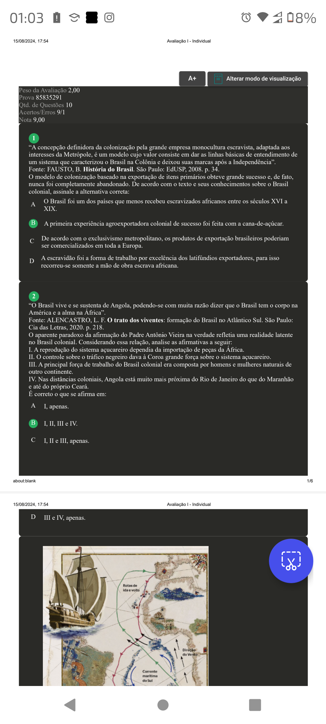 01:03 ! 08% 17:54 Avaliação Individual A+ Alterar modo de visualização Peso da Avaliação 2,00 Prova 85835291 Otd. de Questões 10 Acertos/Erros 9/1 Nota 1 A concepção definidora da colonização pela grande empresa monocultura escravista, adaptada aos interesses da é um modelo cujo valor consiste em dar as linhas básicas de entendimento de um sistema que caracterizou Brasil na Colônia e deixou suas marcas após a Independência". Fonte: FAUSTO, B. História do Brasil. São Paulo: EdUSP. 2008. p. 34. O modelo de colonização baseado na exportação de itens primários obteve grande sucesso de fato, nunca foi completamente De acordo com texto e seus conhecimentos sobre Brasil colonial, assinale a alternativa correta: A O Brasil foi um dos países que menos recebeu escravizados africanos entre os séculos XVI a XIX. B A primeira experiência agroexportadora colonial de sucesso foi feita com a C De acordo com exclusivismo metropolitano, os produtos de exportação brasileiros poderiam ser comercializados em toda a Europa. D A escravidão foi a forma de trabalho por excelência dos latifúndios exportadores, para isso recorreu-se somente a mão de obra escrava africana 2 "O Brasil vive e se sustenta de Angola, podendo-se com muita razão dizer que Brasil tem o corpo na América e a alma na Fonte: ALENCASTRO, L. trato dos viventes: formação do Brasil no Atlântico Sul. São Paulo: Cia das Letras, 2020. p. 218. O aparente paradoxo da afirmação do Padre Antônio Vieira na verdade refletia uma realidade latente no Brasil colonial. Considerando essa relação, analise as afirmativas a seguir: I. A reprodução do sistema açucareiro dependia da importação de peças da África. II. O controle sobre tráfico negreiro dava à Coroa grande força sobre o sistema III. A principal força de trabalho do Brasil colonial era composta por homens e mulheres naturais de outro continente. IV. Nas distâncias coloniais, Angola está muito mais próxima do Rio de Janeiro do que do Maranhão e até do próprio correto que se afirma em: A I. apenas. B II. III e IV. C II e III. apenas. about:blank 1/6 15/08/2024, 17:54 Avaliação Individual D III e apenas. Rotas de ida volta do Vento Corrente maritima Sul