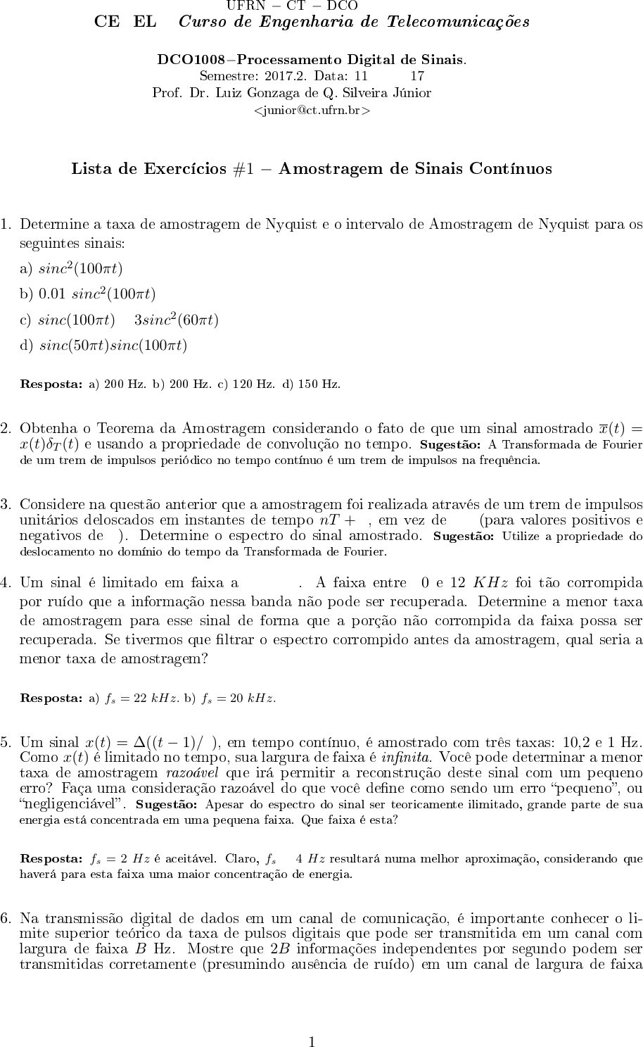 ❯❋❘◆ − ❈❚ − ❉❈❖ CETEL − ❈✉rs♦ ❞❡ ❊♥❣❡♥❤❛r✐❛ ❞❡ ❚❡❧❡❝♦♠✉♥✐❝❛çõ❡s ❉❈❖✶✵✵✽−Pr♦❝❡ss❛♠❡♥t♦ ❉✐❣✐t❛❧ ❞❡ ❙✐♥❛✐s✳ ❙❡♠❡str❡✿ ✷✵✶✼✳✷✳ ❉❛t❛✿ 11/08/2017 Pr♦❢✳ ❉r✳ ▲✉✐③ ●♦♥③❛❣❛ ❞❡ ◗✳ ❙✐❧✈❡✐r❛ ❏ú♥✐♦r <❥✉♥✐♦r❅❝t✳✉❢r♥✳❜r> ▲✐st❛ ❞❡ ❊①❡r❝í❝✐♦s #1 − ❆♠♦str❛❣❡♠ ❞❡ ❙✐♥❛✐s ❈♦♥tí♥✉♦s ✶✳ ❉❡t❡r♠✐♥❡ ❛ t❛①❛ ❞❡ ❛♠♦str❛❣❡♠ ❞❡ ◆②q✉✐st ❡ ♦ ✐♥t❡r✈❛❧♦ ❞❡ ❆♠♦str❛❣❡♠ ❞❡ ◆②q✉✐st ♣❛r❛ ♦s s❡❣✉✐♥t❡s s✐♥❛✐s✿ ❛✮ sinc2(100πt) ❜✮ ✵✳✵✶ sinc2(100πt) ❝✮ sinc(100πt) + 3sinc2(60πt) ❞✮ sinc(50πt)sinc(100πt) ❘❡s♣♦st❛✿ ❛✮ ✷✵✵ ❍③✳ ❜✮ ✷✵✵ ❍③✳ ❝✮ ✶✷✵ ❍③✳ ❞✮ ✶✺✵ ❍③✳ ✷✳ ❖❜t❡♥❤❛ ♦ ❚❡♦r❡♠❛ ❞❛ ❆♠♦str❛❣❡♠ ❝♦♥s✐❞❡r❛♥❞♦ ♦ ❢❛t♦ ❞❡ q✉❡ ✉♠ s✐♥❛❧ ❛♠♦str❛❞♦ x(t) = x(t)δT (t) ❡ ✉s❛♥❞♦ ❛ ♣r♦♣r✐❡❞❛❞❡ ❞❡ ❝♦♥✈♦❧✉çã♦ ♥♦ t❡♠♣♦✳ ❙✉❣❡stã♦✿ ❆ ❚r❛♥s❢♦r♠❛❞❛ ❞❡ ❋♦✉r✐❡r ❞❡ ✉♠ tr❡♠ ❞❡ ✐♠♣✉❧s♦s ♣❡r✐ó❞✐❝♦ ♥♦ t❡♠♣♦ ❝♦♥tí♥✉♦ é ✉♠ tr❡♠ ❞❡ ✐♠♣✉❧s♦s ♥❛ ❢r❡q✉ê♥❝✐❛✳ ✸✳ ❈♦♥s✐❞❡r❡ ♥❛ q✉❡stã♦ ❛♥t❡r✐♦r q✉❡ ❛ ❛♠♦str❛❣❡♠ ❢♦✐ r❡❛❧✐③❛❞❛ ❛tr❛✈és ❞❡ ✉♠ tr❡♠ ❞❡ ✐♠♣✉❧s♦s ✉♥✐tár✐♦s ❞❡❧♦s❝❛❞♦s ❡♠ ✐♥st❛♥t❡s ❞❡ t❡♠♣♦ nT + τ ✱ ❡♠ ✈❡③ ❞❡ nT ✭♣❛r❛ ✈❛❧♦r❡s ♣♦s✐t✐✈♦s ❡ ♥❡❣❛t✐✈♦s ❞❡ n✮✳ ❉❡t❡r♠✐♥❡ ♦ ❡s♣❡❝tr♦ ❞♦ s✐♥❛❧ ❛♠♦str❛❞♦✳ ❙✉❣❡stã♦✿ ❯t✐❧✐③❡ ❛ ♣r♦♣r✐❡❞❛❞❡ ❞♦ ❞❡s❧♦❝❛♠❡♥t♦ ♥♦ ❞♦♠í♥✐♦ ❞♦ t❡♠♣♦ ❞❛ ❚r❛♥s❢♦r♠❛❞❛ ❞❡ ❋♦✉r✐❡r✳ ✹✳ ❯♠ s✐♥❛❧ é ❧✐♠✐t❛❞♦ ❡♠ ❢❛✐①❛ ❛ 12 kHz✳ ❆ ❢❛✐①❛ ❡♥tr❡ 10 ❡ 12 KHz ❢♦✐ tã♦ ❝♦rr♦♠♣✐❞❛ ♣♦r r✉í❞♦ q✉❡ ❛ ✐♥❢♦r♠❛çã♦ ♥❡ss❛ ❜❛♥❞❛ ♥ã♦ ♣♦❞❡ s❡r r❡❝✉♣❡r❛❞❛✳ ❉❡t❡r♠✐♥❡ ❛ ♠❡♥♦r t❛①❛ ❞❡ ❛♠♦str❛❣❡♠ ♣❛r❛ ❡ss❡ s✐♥❛❧ ❞❡ ❢♦r♠❛ q✉❡ ❛ ♣♦rçã♦ ♥ã♦ ❝♦rr♦♠♣✐❞❛ ❞❛ ❢❛✐①❛ ♣♦ss❛ s❡r r❡❝✉♣❡r❛❞❛✳ ❙❡ t✐✈❡r♠♦s q✉❡ ✜❧tr❛r ♦ ❡s♣❡❝tr♦ ❝♦rr♦♠♣✐❞♦ ❛♥t❡s ❞❛ ❛♠♦str❛❣❡♠✱ q✉❛❧ s❡r✐❛ ❛ ♠❡♥♦r t❛①❛ ❞❡ ❛♠♦str❛❣❡♠❄ ❘❡s♣♦st❛✿ ❛✮ fs = 22 kHz. ❜✮ fs = 20 kHz. ✺✳ ❯♠ s✐♥❛❧ x(t) = ∆((t − 1)/2)✱ ❡♠ t❡♠♣♦ ❝♦♥tí♥✉♦✱ é ❛♠♦str❛❞♦ ❝♦♠ três t❛①❛s✿ 10✱2 ❡ 1 ❍③✳ ❈♦♠♦ x(t) é ❧✐♠✐t❛❞♦ ♥♦ t❡♠♣♦✱ s✉❛ ❧❛r❣✉r❛ ❞❡ ❢❛✐①❛ é ✐♥✜♥✐t❛✳ ❱♦❝ê ♣♦❞❡ ❞❡t❡r♠✐♥❛r ❛ ♠❡♥♦r t❛①❛ ❞❡ ❛♠♦str❛❣❡♠ r❛③♦á✈❡❧ q✉❡ ✐rá ♣❡r♠✐t✐r ❛ r❡❝♦♥str✉çã♦ ❞❡st❡ s✐♥❛❧ ❝♦♠ ✉♠ ♣❡q✉❡♥♦ ❡rr♦❄ ❋❛ç❛ ✉♠❛ ❝♦♥s✐❞❡r❛çã♦ r❛③♦á✈❡❧ ❞♦ q✉❡ ✈♦❝ê ❞❡✜♥❡ ❝♦♠♦ s❡♥❞♦ ✉♠ ❡rr♦ ✏♣❡q✉❡♥♦✑✱ ♦✉ ✏♥❡❣❧✐❣❡♥❝✐á✈❡❧✑✳ ❙✉❣❡stã♦✿ ❆♣❡s❛r ❞♦ ❡s♣❡❝tr♦ ❞♦ s✐♥❛❧ s❡r t❡♦r✐❝❛♠❡♥t❡ ✐❧✐♠✐t❛❞♦✱ ❣r❛♥❞❡ ♣❛rt❡ ❞❡ s✉❛ ❡♥❡r❣✐❛ ❡stá ❝♦♥❝❡♥tr❛❞❛ ❡♠ ✉♠❛ ♣❡q✉❡♥❛ ❢❛✐①❛✳ ◗✉❡ ❢❛✐①❛ é ❡st❛❄ ❘❡s♣♦st❛✿ fs = 2 Hz é ❛❝❡✐tá✈❡❧✳ ❈❧❛r♦✱ fs = 4 Hz r❡s✉❧t❛rá ♥✉♠❛ ♠❡❧❤♦r ❛♣r♦①✐♠❛çã♦✱ ❝♦♥s✐❞❡r❛♥❞♦ q✉❡ ❤❛✈❡rá ♣❛r❛ ❡st❛ ❢❛✐①❛ ✉♠❛ ♠❛✐♦r ❝♦♥❝❡♥tr❛çã♦ ❞❡ ❡♥❡r❣✐❛✳ ✻✳ ◆❛ tr❛♥s♠✐ssã♦ ❞✐❣✐t❛❧ ❞❡ ❞❛❞♦s ❡♠ ✉♠ ❝❛♥❛❧ ❞❡ ❝♦♠✉♥✐❝❛çã♦✱ é ✐♠♣♦rt❛♥t❡ ❝♦♥❤❡❝❡r ♦ ❧✐✲ ♠✐t❡ s✉♣❡r✐♦r t❡ór✐❝♦ ❞❛ t❛①❛ ❞❡ ♣✉❧s♦s ❞✐❣✐t❛✐s q✉❡ ♣♦❞❡ s❡r tr❛♥s♠✐t✐❞❛ ❡♠ ✉♠ ❝❛♥❛❧ ❝♦♠ ❧❛r❣✉r❛ ❞❡ ❢❛✐①❛ B ❍③✳ ▼♦str❡ q✉❡ 2B ✐♥❢♦r♠❛çõ❡s ✐♥❞❡♣❡♥❞❡♥t❡s ♣♦r s❡❣✉♥❞♦ ♣♦❞❡♠ s❡r tr❛♥s♠✐t✐❞❛s ❝♦rr❡t❛♠❡♥t❡ ✭♣r❡s✉♠✐♥❞♦ ❛✉sê♥❝✐❛ ❞❡ r✉í❞♦✮ ❡♠ ✉♠ ❝❛♥❛❧ ❞❡ ❧❛r❣✉r❛ ❞❡ ❢❛✐①❛ ✶ B ❍③✶✳ ❙✉❣❡stã♦✿ ❈♦♥s✐❞❡r❡ ✉♠ ✈❛❧♦r ❞❡ ❛♠♣❧✐t✉❞❡ ✐♥❞❡♣❡♥❞❡♥t❡ ✭♥ã♦ ♥❡❝❡ss❛r✐❛♠❡♥t❡ ❜✐♥ár✐♦✮ ❝♦♠♦ ✉♠❛ ✐♥❢♦r♠❛çã♦
