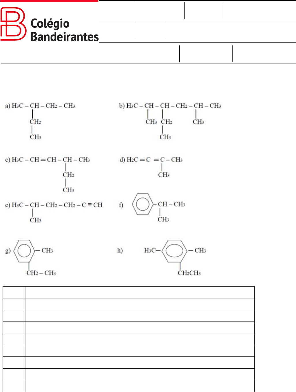 1 Bimestre Disciplina Série Período 1.o Química 3.a Manhã Questões Páginas Profess@res 30 11 Almeida, Franco, Maria Fernanda e Wanda Alun@ Turma N.o Lista de Exercícios – Revisão de Química Orgânica 1. Dar o nome oficial dos hidrocarbonetos: item Nomenclatura oficial (IUPAC) a) b) c) d) e) f) g) h) 2 02. Indique a função e dê a nomenclatura para os compostos abaixo. item Função Nomenclatura oficial (IUPAC) a) b) c) d) e) f) g) h) i) 03. Circule o grupo funcional e indique a(as) função(ões) presente(s) nos compostos abaixo: 3 04. (FUVEST) As figuras a seguir representam moléculas constituídas de carbono, hidrogênio e oxigênio. Elas são, respectivamente, a. etanoato de metila, propanona e propan-2-ol. b. propan-2-ol, propanona e etanoato de metila. c. propan-2-ol, etanoato de metila e propanona. d. propanona, etanoato de metila e propan-2-ol. e. propanona, propan-2-ol e etanoato de metila. 05. (UNESP) Por motivos históricos, alguns compostos orgânicos podem ter diferentes denominações aceitas como corretas. Alguns exemplos são o álcool etílico (C2H6O), a acetona (C3H6O) e o formaldeído (CH2O). Estes compostos podem também ser denominados, respectivamente, como a. hidroxietano, oxipropano e oximetano. b. etanol, propanal e metanal. c. etanol, propanona e metanal. d. etanol, propanona e metanona. e. etanal, propanal e metanona 06. (FATEC) O hidrocarboneto que apresenta a menor quantidade de átomos de H por molécula é: a. metano b. etano c. eteno d. etino e. propino 07. (UFMA) Um dos componentes da gasolina que abastece os automóveis é o isoctano de fórmula estrutural: a. Classifique os átomos de carbono na estrutura escrevendo: P (carbono primário), S (carbono secundário), T (carbono terciário) e Q (carbono quaternário). 4 b. Classifique a cadeia carbônica do composto. c. Como se chama o composto acima, de acordo com a nomenclatura I.U.P.A.C. 08. (VUNESP / Unificado) O nome do composto de fórmula estrutural, segundo as regras oficiais de nomenclatura é: a. 4,5-dimetil-3-propil-hex-1-eno. b. 4,5-dimetil-3-propil-2-hex-1-eno. c. 3-propil-4,5-dimetil-hex-1-eno. d. 2,3-dimetil-4-propil-hex-5-eno. e. 3-pentil-hex-1-eno. 09. (UFG-GO) A cafeína é considerada doping quando sua concentração ultrapassa 1,2 x 10–7 g/mL de urina. A cafeína pode ser representada por sua fórmula estrutural plana: Dado: uma xícara (50 mL) de café contém 5 x 10–3 g de cafeína. Sobre o exame antidoping e a cafeína, são corretas as afirmações: a. ( ) Se um jogador de futebol apresentar na urina uma concentração igual à concentração de cafeína presente em uma xícara de café, dará exame antidoping positivo. b. ( ) A cafeína apresenta cadeia heterocíclica, porque contém o átomo de oxigênio como heteroátomo. c. ( ) Para o exame antidoping negativo o jogador não deve ingerir qualquer substância química. d. ( ) C8H10N4O2 é a fórmula molecular da cafeína. e. ( )A fórmula estrutural da cafeína apresenta três grupos metila e dois grupos carbonila. f. ( ) A cafeína contém átomos de carbono insaturados e saturados. 5 10. (UNIP-SP) As estruturas abaixo representam, respectivamente: a. o-xileno, fenol, ácido benzóico, p-xileno, m-xileno. b. o-xileno, ácido benzóico, fenol, p-xileno, m-xileno. c. p-xileno, fenol, ácido benzóico, m-xileno, o-xileno. d. m-xileno, fenol, ácido benzóico, p-xileno, o-xileno. e. m-xileno, ácido benzóico, fenol, p-xileno, o-xileno. 11. (UFFS-BA) A essência artificial de ananás apresenta a seguinte composição: Aldeído acético (etanal) ................1 mL Butanoato de etila ........................5 mL Butanoato de pentila ..................10 mL Glicerina (propanotriol).................3 mL Clorofórmio..................................1 mL Álcool etílico ............................100 mL Em relação aos componentes dessa essência, pode-se afirmar: a. O butanoato de etila é um éster. b. O butanoato de pentila é um éter. c. A glicerina é uma cetona. d. O álcool etílico é o metanol. e. A fórmula do álcool etílico é CH3OH. 12. (UEM-PR) Assinale as alternativas corretas. a. ( ) Um composto, com fórmula molecular C3H8O, pode ser um ácido carboxílico ou um álcool. b. ( ) A cachaça contém etanol. c. ( ) O composto H3C — CH2 — O — CH3 é um éster. 6 d. ( ) O hexanal apresenta fórmula molecular C6H12O. e. ( ) A propanona pode ser utilizada na remoção de esmalte de unha. f. ( ) O fenol é representado pela estrutura e o tolueno, pela estrutura 13. (UnB-DF) Entre os inseticidas de uso doméstico, encontram-se aqueles à base de compostos orgânicos extraídos de flores de crisântemo. Esses inseticidas são muito pouco tóxicos para os mamíferos, tendo, portanto, amplo uso em residências. Eles são identificados por uma tarja azul na embalagem. Hoje em dia, esses compostos idênticos aos produtos naturais são sintetizados em laboratório por preços muito inferiores. Alguns produtos comercializados nos supermercados contêm ésteres do ácido crisantêmico. A partir da estrutura desse ácido, representada abaixo, julgue os itens a seguir: a. A fórmula mínima do ácido crisantêmico é C10H13O2. b. O ácido crisantêmico possui um anel ciclopropano. c. O ácido crisantêmico possui quatro grupos metila em sua estrutura. d. A substância representada abaixo é um éster do ácido crisantêmico. 14. (UFU-MG) Muitos compostos orgânicos estão presentes em nosso cotidiano. Por exemplo: I. CH3(CH2)2COOCH2CH3 – aroma de abacaxi II. C2H2 – gás utilizado em soldagem a altas temperaturas III. HOOC(CH2)4COOH – um dos materiais de partida para a síntese do nylon-66 A alternativa que indica, respectivamente, os nomes dos compostos, segundo a I.U.P.A.C., é: a. peróxido de hexila; eteno; ácido hexanodióico. b. etil-n-butil-éter; etano; ácido hexanodióico. c. etil-n-butil-cetona; etino; ácido hexanóico d. etil-n-butil-peróxido; eteno; ácido hexanóico e. butanoato de etila; e