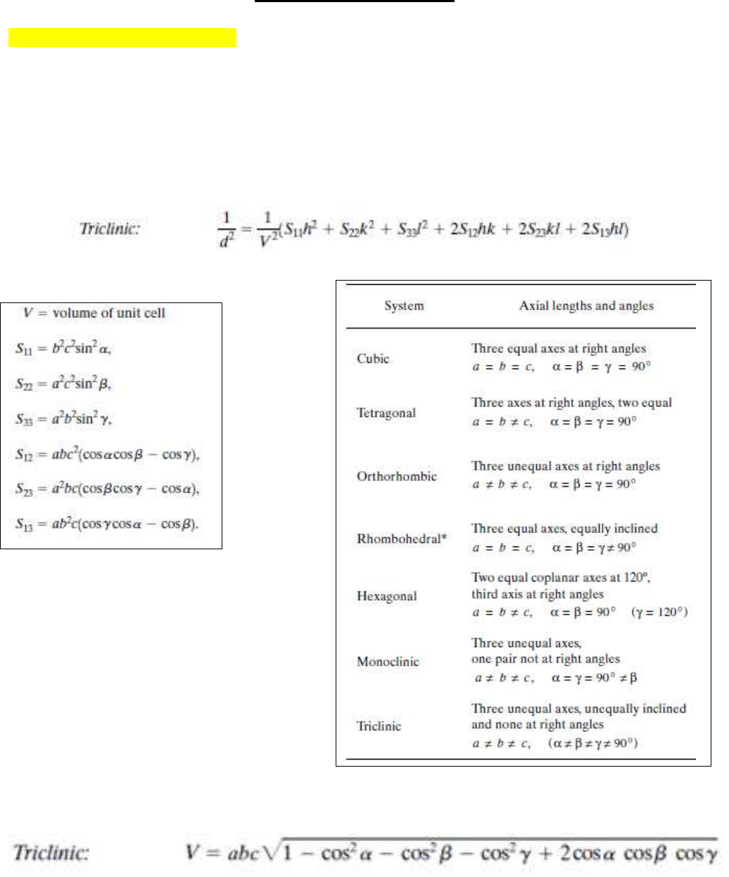 TNM 5823 – Análise de Materiais Inorgânicos por Difração de Pó 2ª Lista de exercícios Prazo para entrega: 20/10/16 1) Starting from the general equation that correlates cell parameters (a, b and c), cell angles (α, and ) and interplanar spacings (d) for the triclinic crystal symmetry and the axial lengths and angles for other crystal systems, simplify the expression of triclinic cell for the other six crystal systems. where: 2) Considering the general equation that correlates cell parameters (a, b and c), cell angles (α, and ) and unit cell volume (V) for the triclinic crystal symmetry: show that the expressions for cell volume for the other six crystal systems can be expressed by: 3) Determine the interplanar spacings and Bragg angles for the reflexions 110, 200, 211, 220, 310 and 222 of α-Iron ( BCC structure, a0 = 2-8664 Å) measured with Mo-Kα radiation (λ = 0.7093 Å). 4) Define unit cell of a crystal lattice. 5) Determine and list in order of increasing angle, the values of Bragg angle ( βθ ) and Miller indexes (hkl) for the first three lines (those of lowest βθ values) on the powder patterns of substances with the following structures (incident radiation Cu Kα (λ = 1.54 Å ): a) simple cubic (a = 3.00 Å), b) simple tetragonal (a = 2.00 Å, c = 3.00 Å), c) simple tetragonal (a = 3.00 Å, c = 2.00 Å), d) simple rhombohedral (a = 3.00 Å, α = 80°). 6) The figure below represents the x-ray diffraction pattern of copper (FCC structure) measured with Co-Kα radiation (λ = 1.542 Å). Determine: a) The interplanar distance dhkl, for each peak. b) The cell parameter, a0. 7) The structure factor for an x-ray diffraction reflexion hkl) can be calculated by the expression: Where: N is the number of atoms of the motif; fj is the atomic scattering factor for the atom j; (uj , vj , wj) are the fractional coordinates for atom j; h, k e l are the Miller index for the reflexion. Considering a FCC structure with one atom in each net site, at positions (0, 0, 0), (½, ½, 0), (½, 0, ½) e (0, ½, ½). Prove that: a) Fhkl = 4f when the values of h, k and l are all odd or even (unmixed); b) Fhkl = 0 for values of h, k and l mixed (odd and even). 8) Simulate the X-ray diffraction pattern for a sample of polycrystalline aluminum (face- centered cubic symmetry, space group Fm3m with 1 atom / lattice point), whose cell parameter is 4.0494 Å, determining: a) The possible XRD reflexions measured with Cu-kα1 radiation (λ = 1.54056 Å) and 2θ ranging from 20° to 100°, their angular positions (2θhkl) and interplanar spacings (dhkl). b) Calculate the structure factors and the relative intensities of these reflections by assigning a value of 100% to the more intense reflection. 9) Calculate the relative intensities for the 10 first XRD reflexions of NaCl (Space Group: Fm-3m; a0 = 5.6402 Å) in a diffraction pattern measured with Cu-Ka radiation (λ = 1.54056 Å). Detail the calculations used and values. 10) Optional question (but highly important for the final concept). If you have ability to use spreadsheets, as EXCEL and Origin, you can construct a spreadsheet to calculate the structure factors and the relative intensities for any structure (including exercises 8 and 9). Using your spreadsheet, determine the reflexions and its relative intensities for powder patterns measured with Co-Kα1 (λ = 1.78897 Å), in the Bragg angle range (2θ) from 20º to 120º, for the crystal phases: a) LiF (Lithium Fluoride; System: cubic; Space Group: Fm-3m; a0 = 4.0270 Å) b) V (Vanadium; System: cubic; Space Group: Im-3m; a0 = 3.0274 Å). For do this read carefully the Chapter 12 of the book “Structure of Materials – An Introduction to Crystallography Diffraction and Symmetry – M. De Graef and M. E. McHenry” (included in the books you received) and use the Equation 12.3 and Table 12.1 for determine the atomic scattering factors. You can find the crystal structures and cif files at the Crystallography Open Database (http://www.crystallography.net/cod/). http://www.crystallography.net/cod/ SOME USEFUL RELATIONS In calculating structure factors by complex exponential functions, many particular relations occur often enough to be worthwhile stating here.They may be verified by means of Eq. (7). a) ����� = ��� �� = ��� ��... = -1 b) ��� �� = ��� �� = ��� �� ... = +1 c) In general, ������= (-1)n , (where n is any integer) d) ������= ���−���, (where n is any integer) e) ����� + ���−�� = 2 cos x