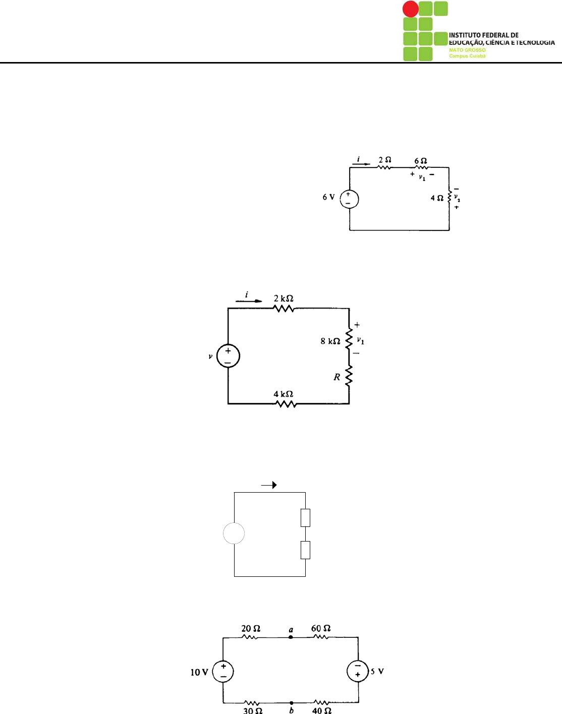 CURSO: Engenharia SEMESTRE: DISCIPLINA: Eletricidade Aplicada TURMA: DOCENTE: Dr. Saulo A. R. Piereti DISCENTE: TURNO: LISTA DE EXERCÍCIOS EA 03 - Associação Série e Divisor de Tensão 1. Dado o circuito abaixo, calcule: Resposta: (a)12Ω; (b) 0,5A; (c) 3W; (d) 3V e -2V. a. A resistência equivalente vista pela fonte; b. A corrente i; c. A potencia entregue pela fonte; d. v1 e v2; 2. No divisor de tensão abaixo, a potência entregue pela fonte é 8mW e v1=v/4. Calcule R, v, v1 e i. Resposta: R=18kΩ, v=16V, v1=4V e i=0,5mA. 3. Uma carga resistiva requer 4V e dissipa 2W. Uma tensão de 12V está disponível, através de uma bateria, para alimentar a carga. Em relação ao circuito abaixo, se R2 representa a carga e v a bateria de 12V, calcule: (a) a corrente i; (b) o valor necessário da resistência R1 e (c) a potencia R1. Resposta: (a) 0,5A; (b) 16Ω; (c) 4W 4. Calcule vab e a potência entregue pela fonte de 5V. Resposta: vab =5V e p=0,5W v R1V1 + - i + - R2V2 + - CURSO: Engenharia SEMESTRE: DISCIPLINA: Eletricidade Aplicada TURMA: DOCENTE: Dr. Saulo A. R. Piereti DISCENTE: TURNO: 5. Calcule i e vab, e um circuito equivalente para i contendo uma única fonte e um único resistor. 6. Uma fonte de 10V em série com vários resistores fornece uma corrente de 50mA. Qual resistência deve ser conectada em série com a fonte e os resistores para que a corrente seja limitada em 20mA. Resposta: 300Ω 7. Uma fonte de 50V e dois resistores, R1 e R2 são conectados em série. Se R2=4.R1, calcule a tensão sobre cada resistor. Resposta: V1=10[V], V2=40[V] 8. Uma fonte de 12V em série com uma carga resistiva R fornece uma corrente de 60mA. Se um resistor R1 for adicionado em série com a fonte e a carga, calcule R1 tal que a tensão sobre ele seja de 8V. Resposta: 400Ω 9. Projete um divisor de tensão que forneça 4, 10 e 20V, referente a um terminal negativo comum, a partir de uma fonte de 25V. A fonte fornece 25mW de potência. 10. Projete um divisor de tensão que forneça 2, 6,10, 24 e 40V, referente a um terminal negativo comum, a partir de uma fonte de 50V. A fonte fornece 100mW de potência. 11. Construa um divisor de tensão com uma fonte de 60V e vários resistores de 10KΩ. Calcule o número mínimo de resistores necessários, se a tensão de saída é (a) 40V e (b) 30V. 12. Calcule todas as tensões de saída possíveis, inferiores a 14V, que podem ser obtidas pela construção de dispositivos de tensão com uma fonte de 14V em série com três resistores cujos valores são respectivamente, 2, 4 e 8Ω. Resposta: 2V, 4V, 6V, 8V, 10V, 12V.