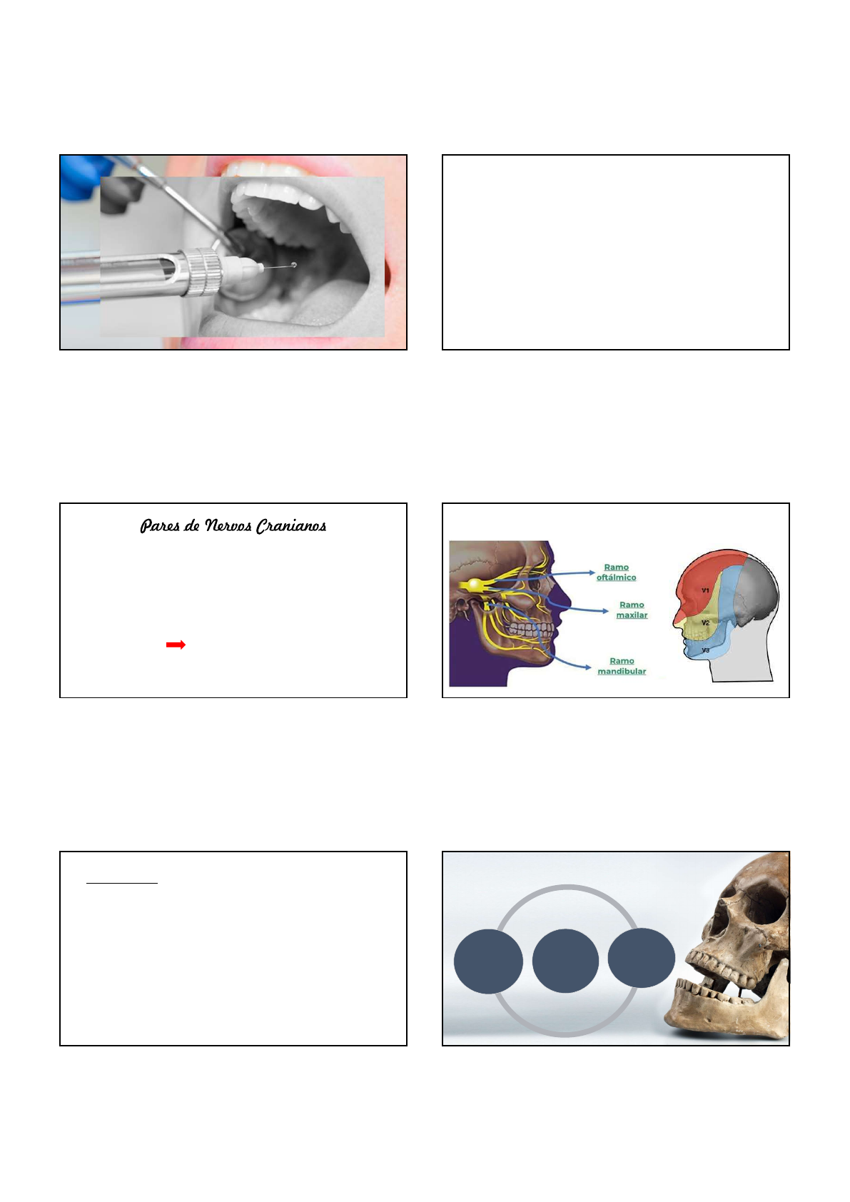 11/08/2024 Técnicas Anestésicas em Odontologia Profª Juliana Rodrigues Rozatto Anestesia local Um tipo de anestesia no qual parte do corpo é privado de sensações, sendo esta condição obtida por meio de agentes específicos (Anestésicos locais). Lidocaína Articaína Mepivacaína Prilocaína Bupivacaína Epinefrina (Adrenalina) Noradrenalina Felipressina Principais sais anestésicos Principais Vasoconstritores I – Olfatório II – Óptico III – Óculomotor IV – Troclear V – Trigêmeo VI – Abducente VII – Facial VIII – Vestibular IX – Glossofaríngeo X – Vago XI – Acessório XII – Hipoglosso Misto: Sensitivo + Motor V par Craniano (N. Trigêmeo) (V1) (V2) (V3) Anestesias: • Anestesias por Bloqueio Regional: o agente anestésico exercerá sua ação ao nível de um ramo, promovendo anestesia na região por ele inervada (por ex: nervo Alveolar Inferior, Lingual ou Bucal) • Anestesia por Bloqueio Tronculares: o agente anestésico exercerá sua ação ao nível do tronco nervoso, insensibilizando várias áreas por ele inervadas (por ex: o nervo Mandibular (V3) ou maxilar (V2) • Anestesias por Infiltração (Supraperiosteal): o agente anestésico exercerá sua ação em uma terminação nervosa (por ex: vestibular e palatina dos dentes superiores) Anestesias por Bloqueios regionais: Mandíbula N. Mentoniano e Incisivo N. Alveolar inferior, Lingual e Bucal 11/08/2024 Indicações: intervenções em todos os dentes inferiores, tecido ósseo, mucosa, assoalho bucal, 2/3 anteriores da língua e ramos gengivais. Anestesia por bloqueio dos N. Alveolar inferior, bucal e lingual N. Alveolar inferior: tecidos pulpares dos dentes inferiores (incisivos até molares) e osso alveolar Bucal: mucosa vestibular dos molares Lingual: 2/3 anteriores da língua, gengiva e mucosa lingual de molar a incisivos Técnica Direta Técnica Direta: • Agulha Longa (Bisel voltada para o osso) • Introdução de 2/3 da agulha • Aspiração • Introduzir lentamente 1. N. Alveolar inferior + Lingual Ponto de inserção da agulha Técnica: • Dedo na borda anterior do ramo mandibular • ¾ da distância entre o ramo anterior da mandíbula e a rafe pterigo-mandibular • Seringa paralela ao plano oclusal, na direção dos pré- molares contralateirais (comissura labial) Ponto de inserção da agulha N. Alveolar inferior + Lingual 11/08/2024 N. Alveolar inferior + Lingual N. Alveolar inferior + Lingual Vantagens: Técnica única diminui chances de fratura da agulha Mais fácil Desvantagens: Não anestesia o N. Bucal Necessita de 2 punções 2. N. Bucal N. Bucal 1. Afastar o tecido mole 2. Carpule paralela ao plano oclusal 3. Agulha inserida na vestibular, na altura da distal do Segunda Molar (Agulha curta ou longa) 4. Introduzir a agulha até o contato osso, regredir com cuidado e injetar lentamente Técnica indireta ou das 3 posições Técnica indireta ou das 3 posições: • Uma única punção permite o bloqueio dos nervos alveolar inferior, lingual e bucal VANTAGEM • Deposição do anestésico em 3 locais distintos • Necessidade de mudança de posição do conjunto seringa-agulha Maior chance de fratura da agulha DESVANTAGEM 11/08/2024 Técnica indireta ou das 3 posições: • Agulha Longa (Bisel voltada para o osso) • Introdução de 1/3 da agulha (Bucal) 1/2 da agulha (Lingual) e 3/4 (Alveolar inferior) • Aspiração • Introduzir lentamente 1ª posição = N. Bucal 2ª posição = N. Lingual 3ª posição = N. Alveolar Inferior Anestesia por bloqueio N. Mentoniano e Inicisivo Regiões anestesiadas: Lábio inferior do mesmo lado e mucosa vestibular dos pré-molares, caninos e incisivos. N. Mentoniano e Incisivo Técnica: • Agulha inserida 3mm fora do fundo de vestibular mandibular • Entre os ápices dos primeiros e segundos pré-molares inferiores • Agulha inclinada 60° com a tábua óssea N. Mentoniano e Incisivo Atenção!! Agulha não toca em osso 11/08/2024 Anestesias por Bloqueios regionais: Maxila N. Alveolar superior anterior e Médio (Infra- orbitário) N. Nasopalati- no N. Palatino maior N. Alveolar Superior Posterior • Vestibular: Agulha 2mm fora do fundo de vestíbulo, 45° com a tábua óssea Anestesia infiltrativa (Supraperiosteal) • Palatina: Agulha 5mm abaixo da cervical do dente, 45° com a tábua óssea. Carpule apoiada na comissura labial contralateral Anestesia infiltrativa Anestesia por bloqueio dos N. Alveolar superiores anterior, médio e N. Infra-orbital N. Alveolar Superior anterior: Inerva incisivos e caninos (mucosa gengival vestibular e dentes) N. Alveolar Superior médio: Aparecem somente em 10 a 20% dos casos Quando presentes, inervam os pré-molares e raiz mésio-vestibular do 1º Molar Mucosa gengival vestibular, seio maxilar, periósteo e os alvéolos correspondentes Anestesia por bloqueio do N. Infra-Orbital Injetando a solução anestésica próxima ao forame Infra- orbitário, anestesia os N. Alveolar superiores anterior e médio por difusão. Técnica: Linha centro pupilar/eixo do segundo pré-molar Paciente deve olhar para frente, centralizando suas pupilas Traça-se uma linha imaginária que passa entre o centro da pupila e pelo longo eixo do segundo pré- molar OBS: O forame situa-se aproximadamente 6 a 7 mm abaixo da margem infra-orbital (palpar com os dedos) Punção de 4 a 5 mm do fundo de vestíbulo N. Infra-Orbital 11/08/2024 N. Infra-Orbital N. Infra-Orbital Anestesia por bloqueio dos N. Alveolar superiores posterior Inerva: raiz distal e palatina do primeiro molar, segundo e terceiro molar (Mucosa gengival vestibular e dentes) Técnica: Angulação dupla Agulha na altura do primeiro/segundo molar 1ª angulação: agulha 45° com a tábua óssea vestibular dos molares superiores 2ª angulação: agulha 45° para anterior Agulha é introduzida cerca de 16mm N. Alveolar superiores posterior 45° 1ª Angulação da Agulha 45° 2ª Angulação da Agulha Anestesia por bloqueio dos N. Nasopalatino Inerva: Mucosa palat