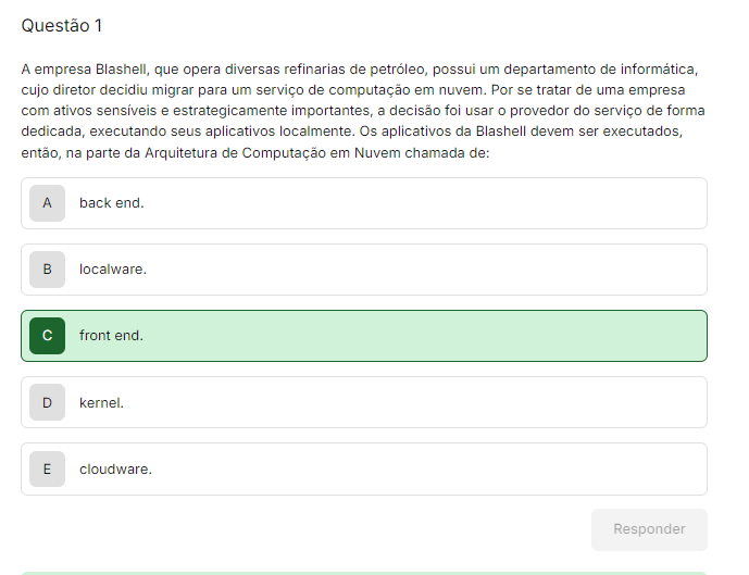Questão 1 A empresa Blashell, que opera diversas refinarias de possui um departamento de informática, cujo diretor decidiu migrar para um serviço de computação em nuvem. Por se tratar de uma empresa com ativos e estrategicamente importantes, a decisão foi usar provedor do serviço de forma dedicada, executando seus aplicativos localmente. Os aplicativos da Blashell devem ser executados, então, na parte da Arquitetura de Computação em Nuvem chamada de: A back end. B C front end. D kernel. E cloudware. Responder