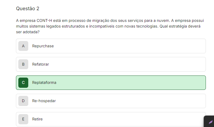 Questão 2 A empresa CONT-H está em processo de migração dos seus serviços para a A empresa possui muitos sistemas legados estruturados e incompatíveis com novas tecnologias. Qual estratégia deverá ser adotada? A Repurchase B Refatorar C Replataforma D Re-hospedar E Retire