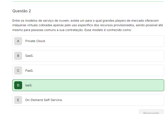 Questão 2 Entre os modelos de serviço de nuvem, existe um para qual grandes players de mercado oferecem máquinas virtuais cobradas apenas pelo uso específico dos recursos provisionados, sendo possível até mesmo para pessoas comuns a sua contratação. Esse modelo é conhecido A Private Cloud. B C D E On-Demand Self-Service Responder