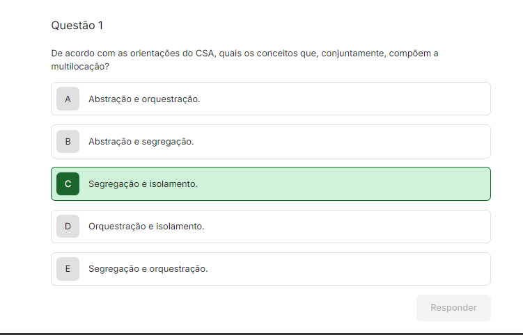 Questão 1 De acordo com as orientações do CSA, quais os conceitos que, conjuntamente, compõem a multilocação? A Abstração e orquestração. B Abstração e segregação. C Segregação e isolamento. D Orquestração e isolamento. E Segregação e orquestração. Responder